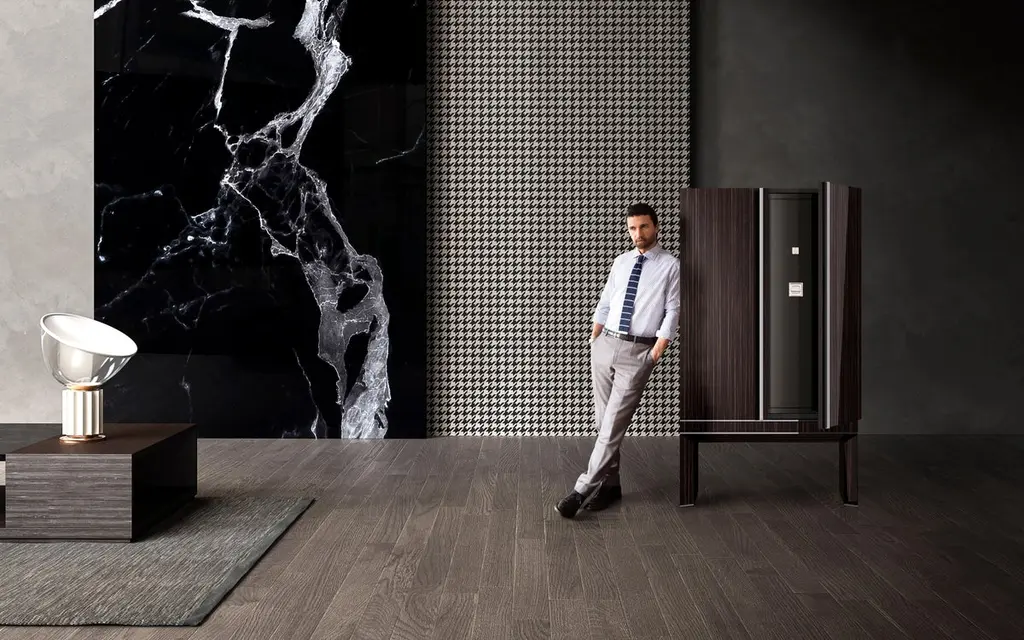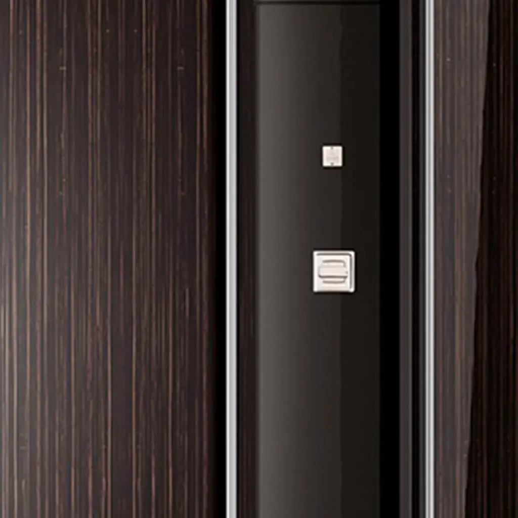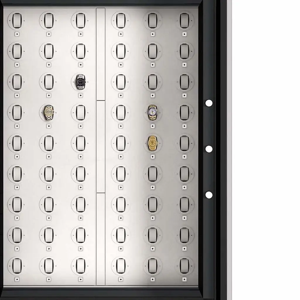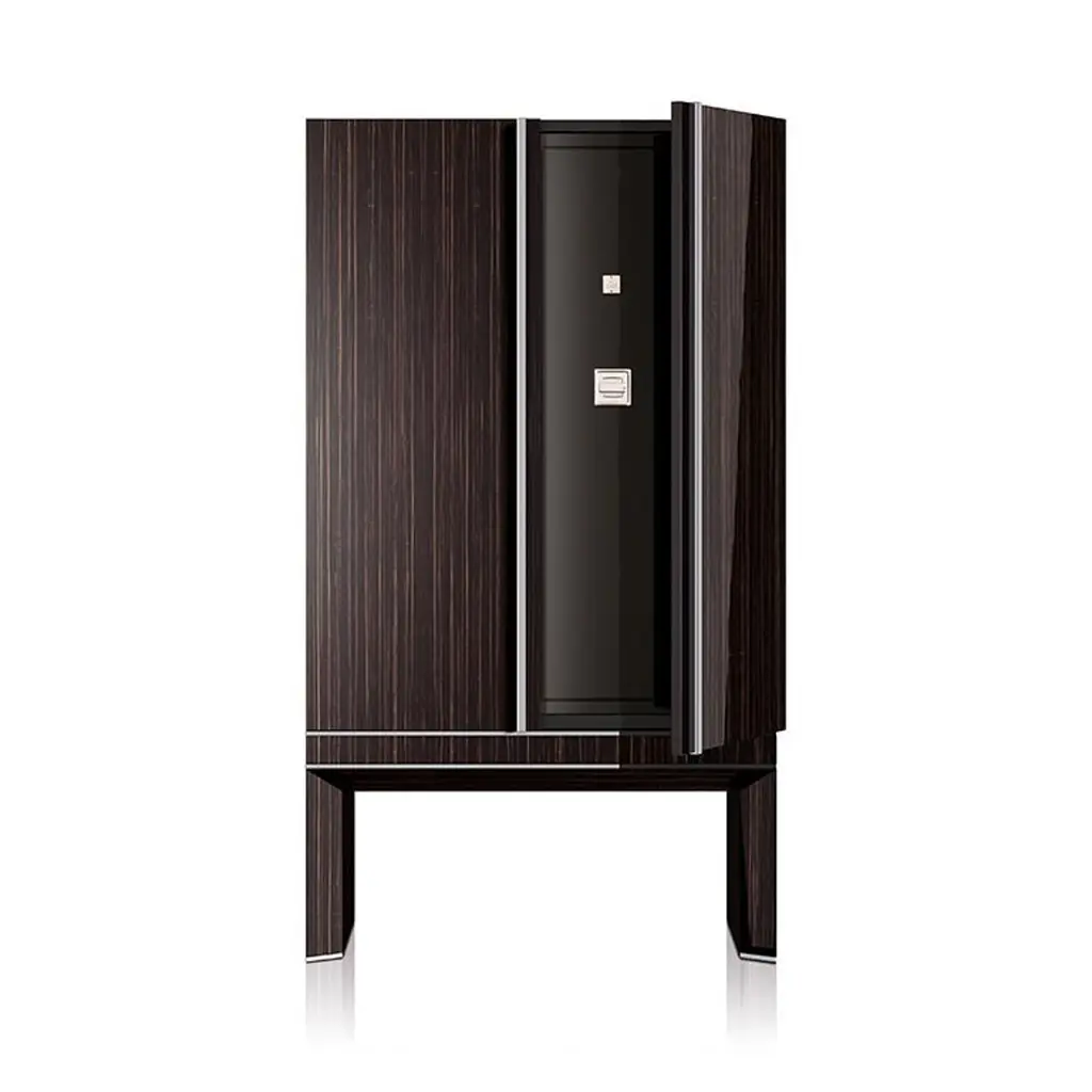 Armored armoire in polished Ebony, brass accessories in Ruthenium. Safe with biometric opening device, drawers and trays lined for watches and jewelry. Available with 54 Swiss made watch winders. Two secret compartments. Safe to be anchored to the wall with metal screws. Biometric opening device (upto 99 authorized users) and emergency key system.
