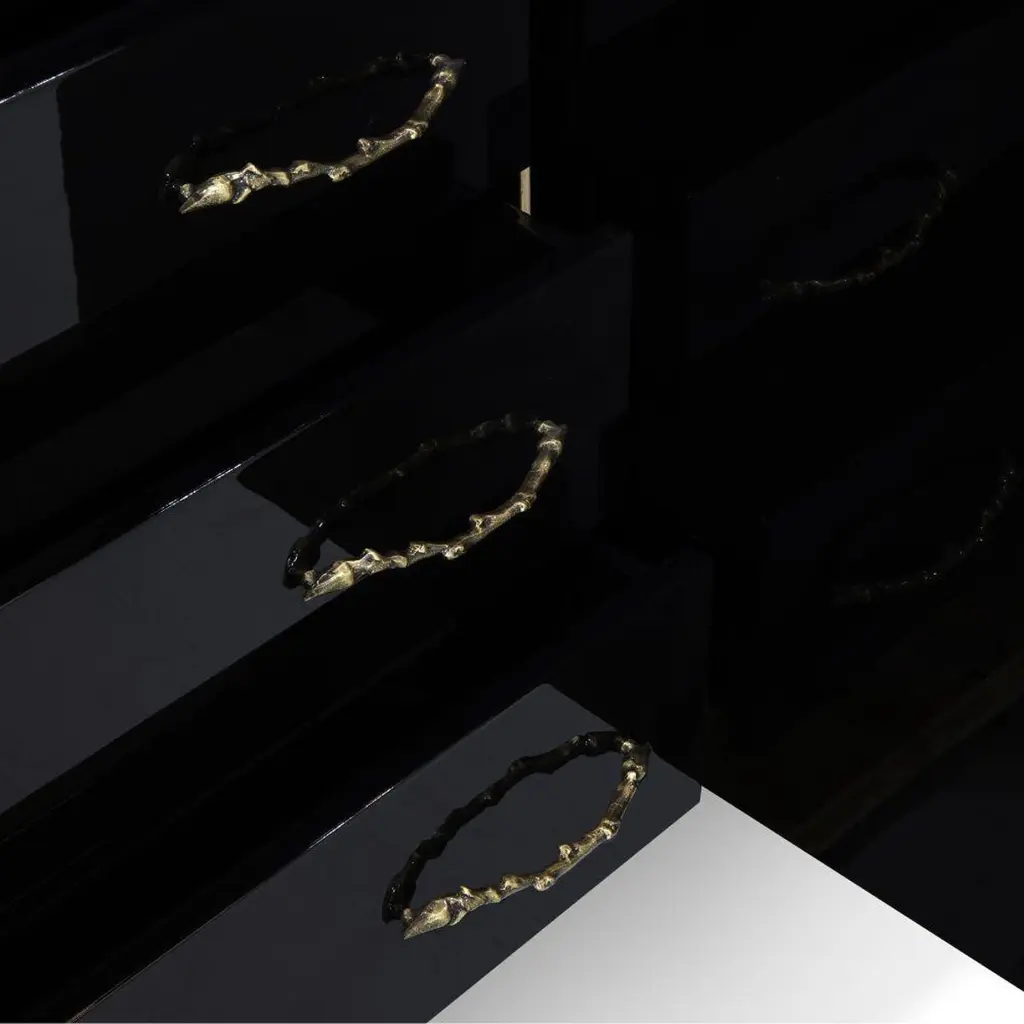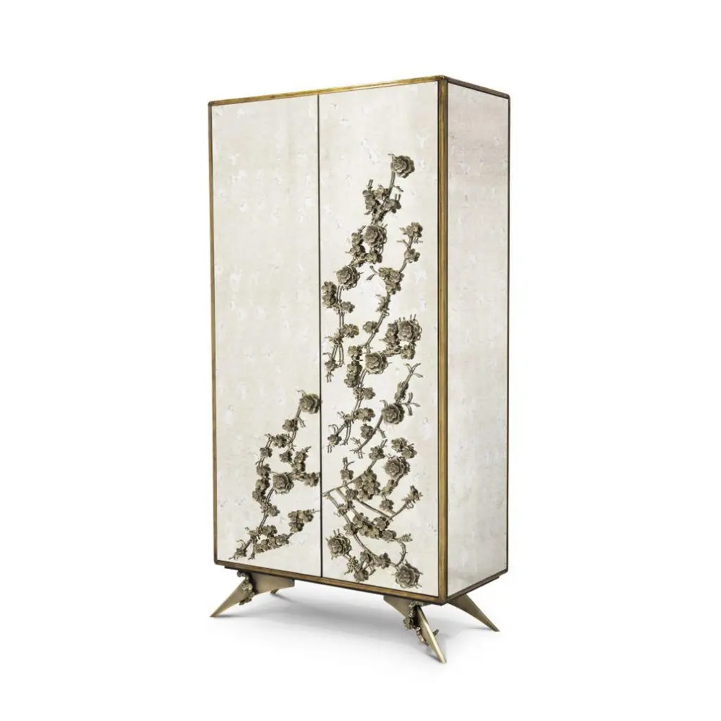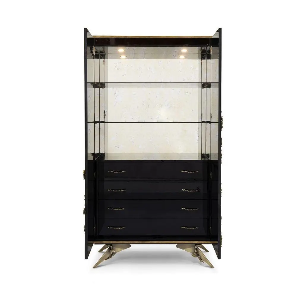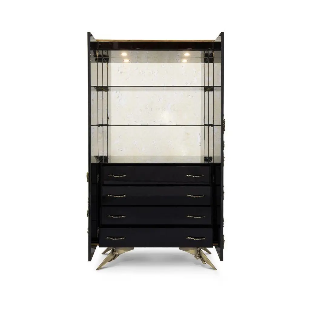 There is a sense of reveal and conceal as KOKET takes a beautiful armoire in high gloss lacquer and adorns it in metal organic lace, revealing a mesmerizing hint of what lies beneath. The stunning interior opens to an antique mirror back with two glass shelves at top four drawers embellished with organic hardware finished to match the exterior.Materials & Finishes: Structure: Black Lacquer (High Gloss Finish)Structure Sides: Aged MirrorDoor Front: Aged MirrorDoor Interior: Black Lacquer (High Gloss Finish)Base: Aged Brass (High Gloss Finish)Handle: Aged Brass (High Gloss Finish)Frame: Aged Gold Leaf (High Gloss Finish)Drawers: Black Lacquer (High Gloss Finish)Shelves: Smoked GlassInterior Back: Aged MirrorClean & Care: Wood and lacquered pieces have been stained and/or polished to bring depth and beauty to each finish. Although most are protected with either a clear coat or wax, they are still susceptible to wear. Care for your wood and lacquer pieces by dusting regularly with a soft cloth. Maintain wood, lacquer and mother of pearl by not placing near heaters and air conditioning units to prevent over-drying or exposure to excessive moisture. Avoid extreme humidity changes in your home, as extremely dry air can cause wood to crack and lacquer to lift. Do not place/leave hot or moist objects directly on the wood. Rubber or plastic left on the wood finish can also damage the finish. Clean by using a dry or slightly damp soft cloth. Follow by polishing with a dry soft cloth. Do not use commercial, heavy-duty polishes or waxes, as they can yellow light finishes. We recommend that stained or soiled wood, lacquer or mother of pearl pieces be professionally cleaned or re finished.