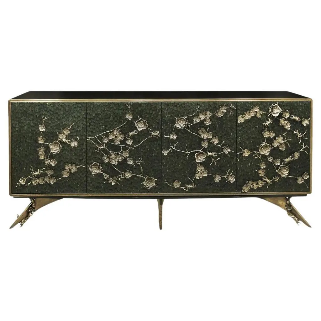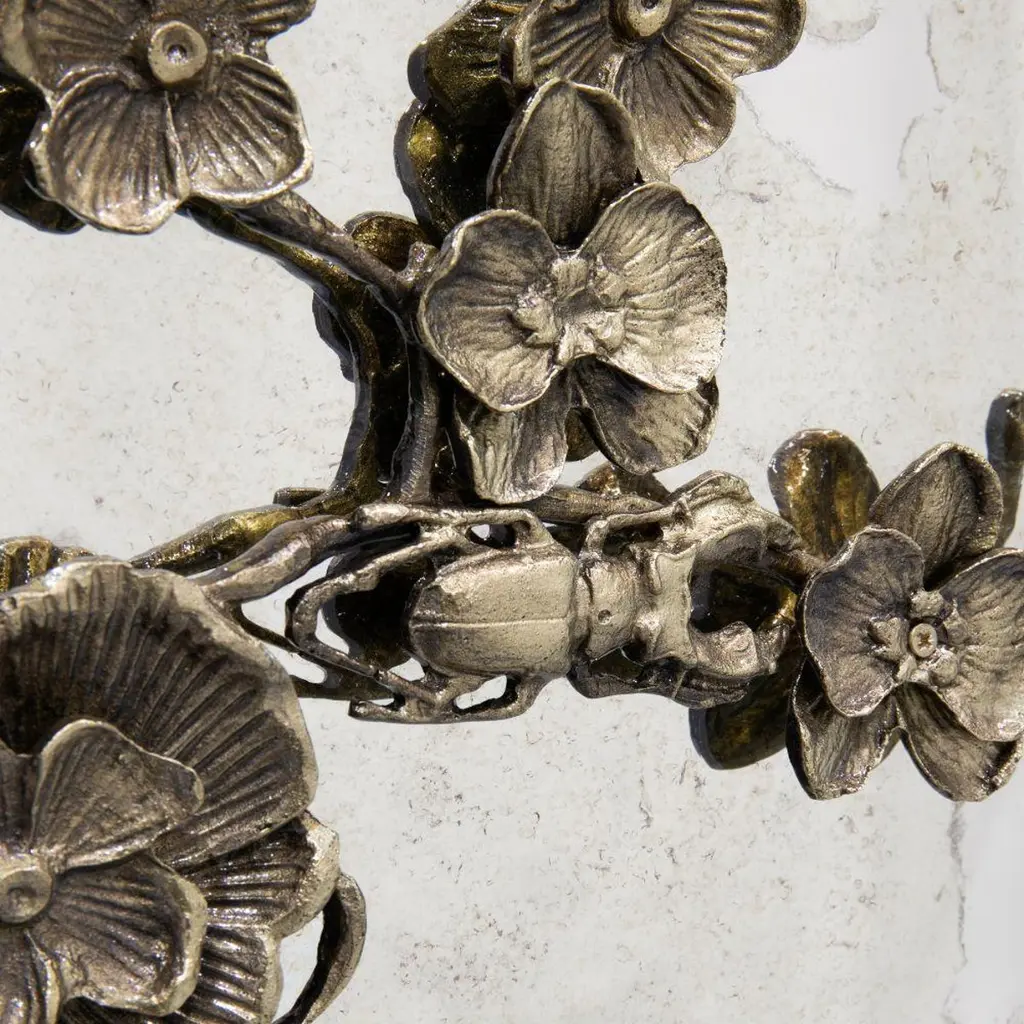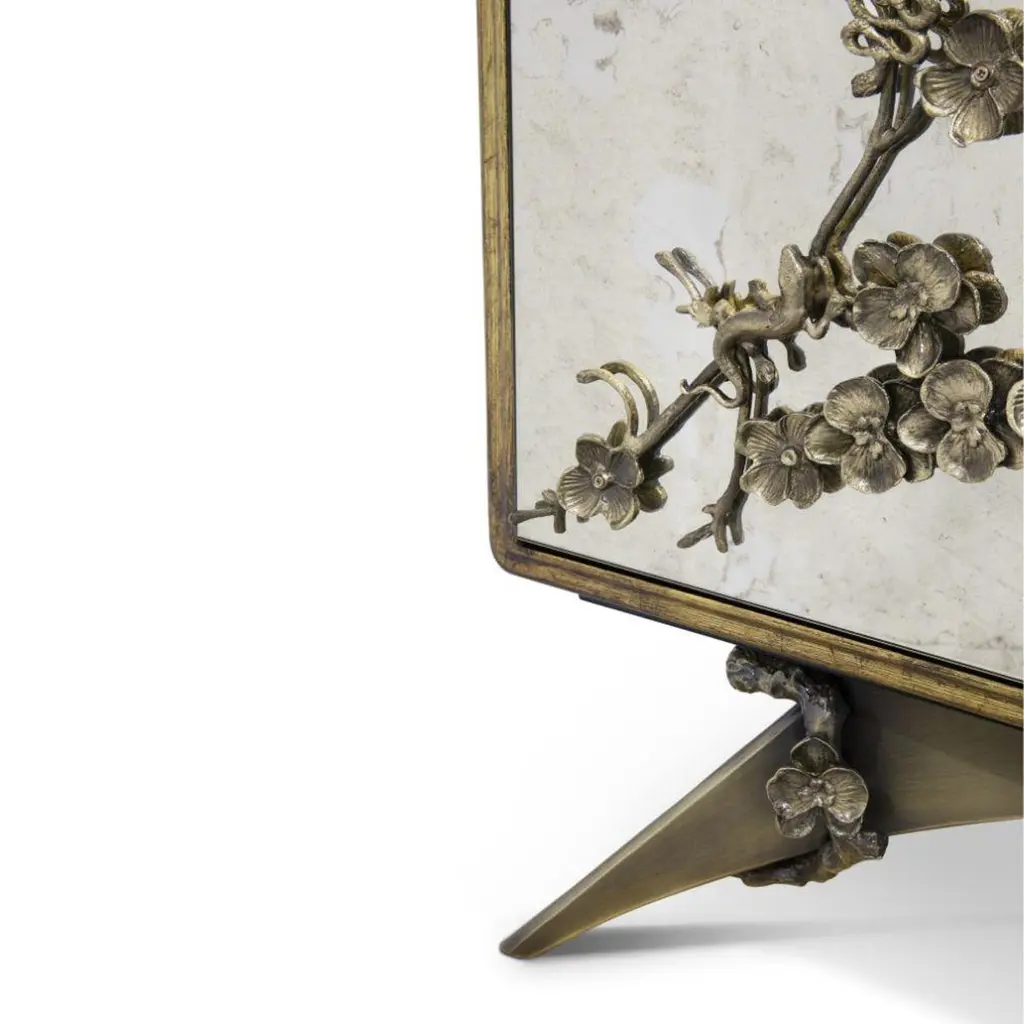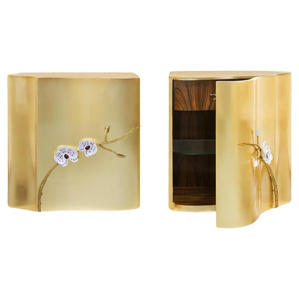 There is a sense of reveal and conceal as KOKET takes a beautiful armoire in high gloss lacquer and adorns it in metal organic lace, revealing a mesmerizing hint of what lies beneath. The stunning interior opens to an antique mirror back with two glass shelves at top four drawers embellished with organic hardware finished to match the exterior.Materials & Finishes: Structure: Black Lacquer (High Gloss Finish)Structure Sides: Aged MirrorDoor Front: Aged MirrorDoor Interior: Black Lacquer (High Gloss Finish)Base: Aged Brass (High Gloss Finish)Handle: Aged Brass (High Gloss Finish)Frame: Aged Gold Leaf (High Gloss Finish)Drawers: Black Lacquer (High Gloss Finish)Shelves: Smoked GlassInterior Back: Aged MirrorClean & Care: Wood and lacquered pieces have been stained and/or polished to bring depth and beauty to each finish. Although most are protected with either a clear coat or wax, they are still susceptible to wear. Care for your wood and lacquer pieces by dusting regularly with a soft cloth. Maintain wood, lacquer and mother of pearl by not placing near heaters and air conditioning units to prevent over-drying or exposure to excessive moisture. Avoid extreme humidity changes in your home, as extremely dry air can cause wood to crack and lacquer to lift. Do not place/leave hot or moist objects directly on the wood. Rubber or plastic left on the wood finish can also damage the finish. Clean by using a dry or slightly damp soft cloth. Follow by polishing with a dry soft cloth. Do not use commercial, heavy-duty polishes or waxes, as they can yellow light finishes. We recommend that stained or soiled wood, lacquer or mother of pearl pieces be professionally cleaned or re finished.