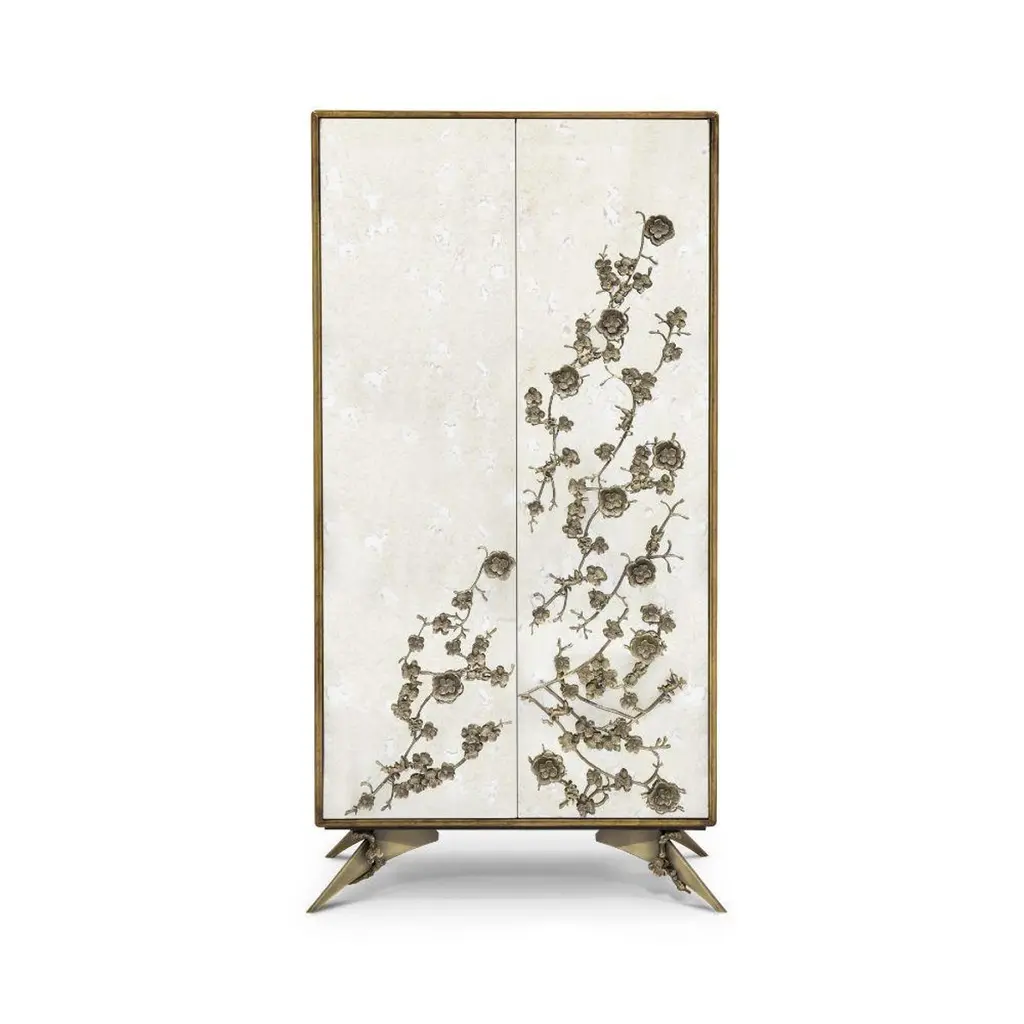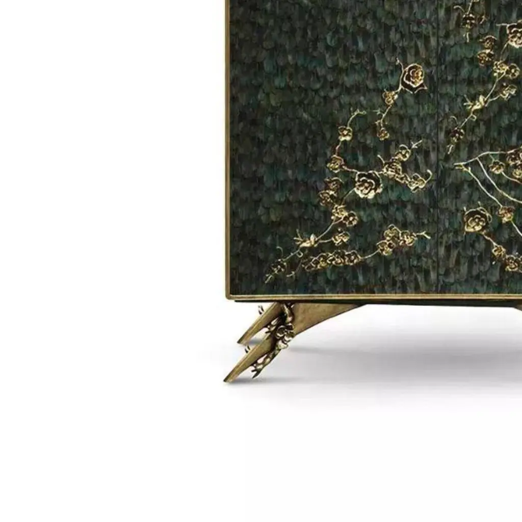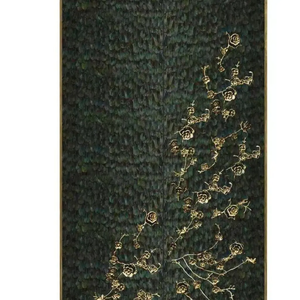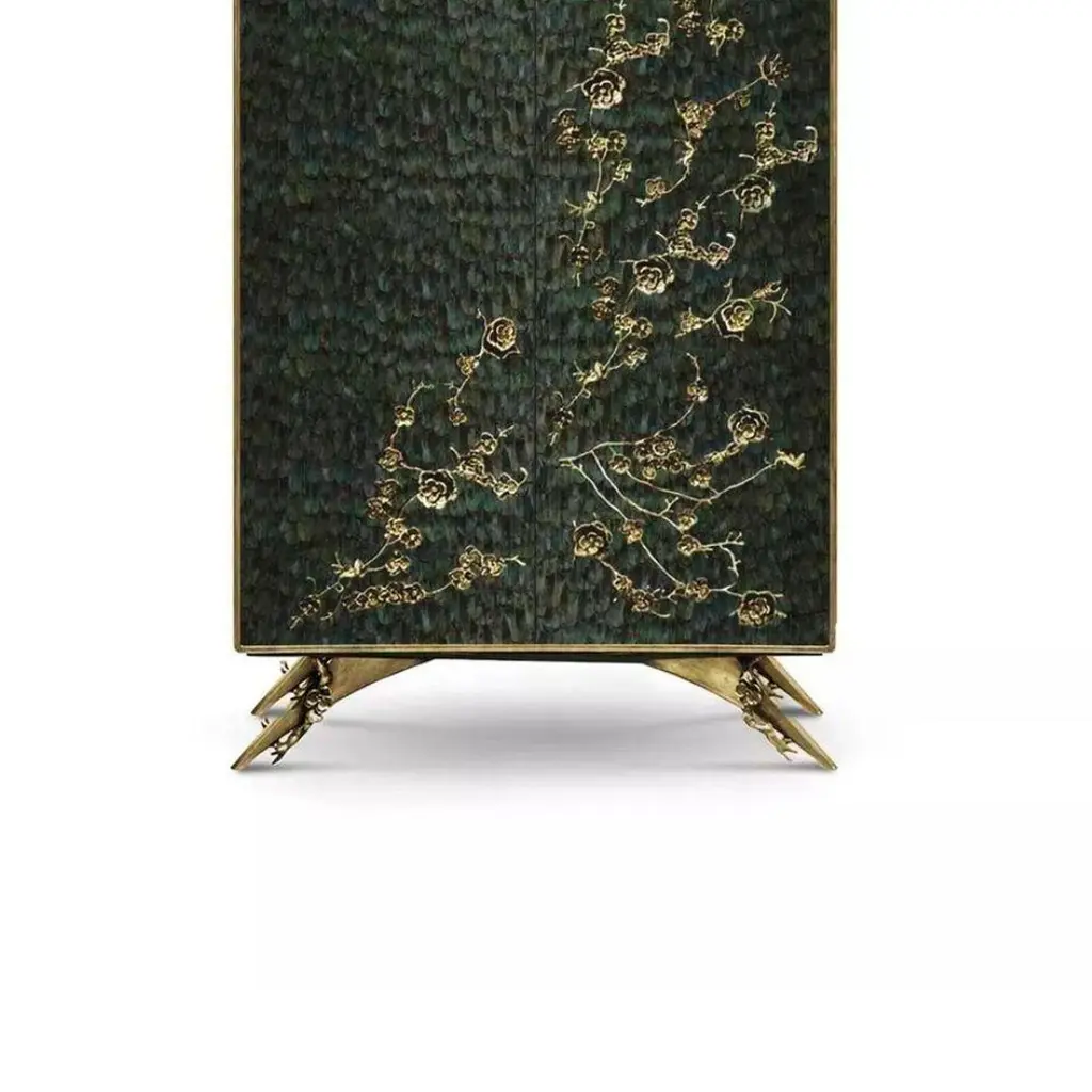 There is a sense of reveal and conceal as KOKET takes a beautiful armoire in high gloss lacquer and adorns it in metal organic lace, revealing a mesmerizing hint of what lies beneath. The stunning interior opens to an antique mirror back with two glass shelves at top four drawers embellished with organic hardware finished to match the exterior.Materials & Finishes: Structure: Black Lacquer (High Gloss Finish)Structure Sides: Black Lacquer (High Gloss Finish)Door Front: Iridescent Peacock Feathers from the KOKET Textiles collectionDoor Interior: Black Lacquer (High Gloss Finish)Base: Aged Brass (High Gloss Finish)Handle: Aged Brass (High Gloss Finish)Frame: Aged Gold Leaf (High Gloss Finish)Drawers: Black Lacquer (High Gloss Finish)Shelves: Smoked GlassInterior Back: Aged MirrorClean & Care: Wood and lacquered pieces have been stained and/or polished to bring depth and beauty to each finish. Although most are protected with either a clear coat or wax, they are still susceptible to wear. Care for your wood and lacquer pieces by dusting regularly with a soft cloth. Maintain wood, lacquer and mother of pearl by not placing near heaters and air conditioning units to prevent over-drying or exposure to excessive moisture. Avoid extreme humidity changes in your home, as extremely dry air can cause wood to crack and lacquer to lift. Do not place/leave hot or moist objects directly on the wood. Rubber or plastic left on the wood finish can also damage the finish. Clean by using a dry or slightly damp soft cloth. Follow by polishing with a dry soft cloth. Do not use commercial, heavy-duty polishes or waxes, as they can yellow light finishes. We recommend that stained or soiled wood, lacquer or mother of pearl pieces be professionally cleaned or re finished.