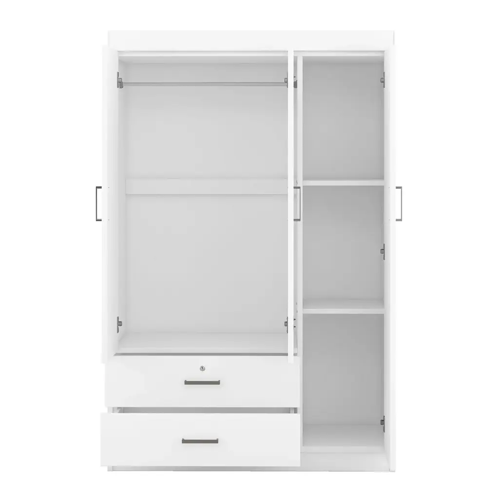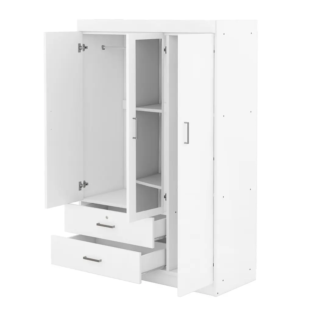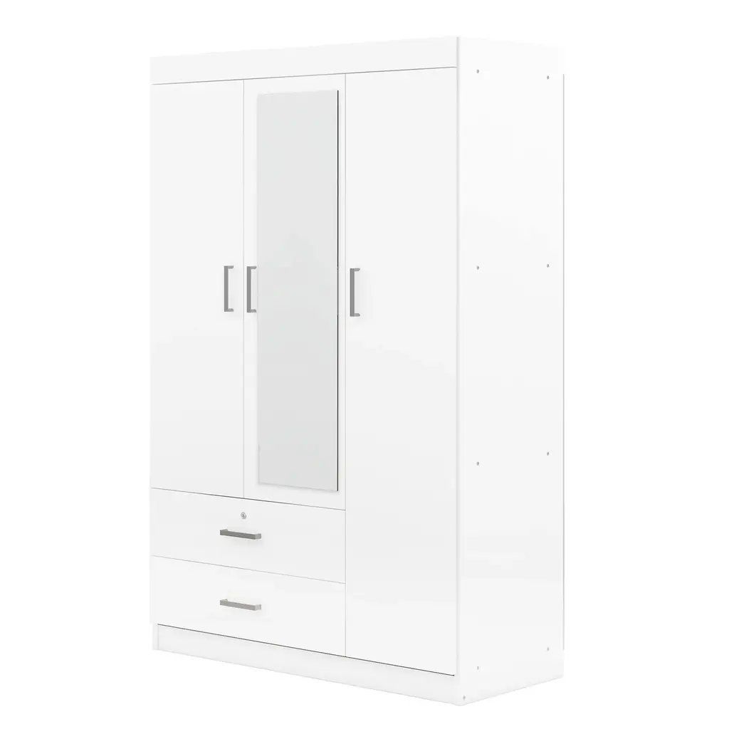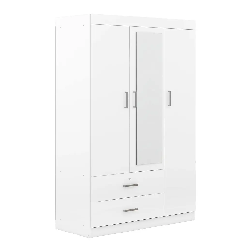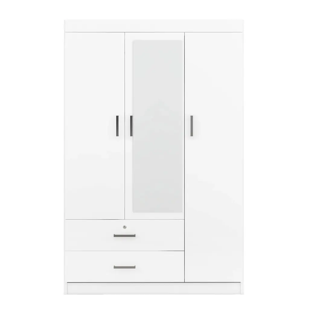 1.Three-Door Design: Ample storage awaits with three generously-sized doors, providing organized space for your clothing and accessories. 2.Built-in Dressing Mirror: The central door features a convenient full-length dressing mirror, allowing you to effortlessly check your appearance before heading out. 3.Secure Storage: Equipped with two drawers, including one lockable drawer for valuables, ensuring your belongings stay safe and secure. 4.Generous Storage Capacity: Enjoy abundant storage space to neatly store your wardrobe essentials, keeping your bedroom clutter-free and organized. 5.Sleek and Timeless Design: With its clean lines and understated elegance, this wardrobe effortlessly enhances any bedroom decor, adding a touch of sophistication to your living space.