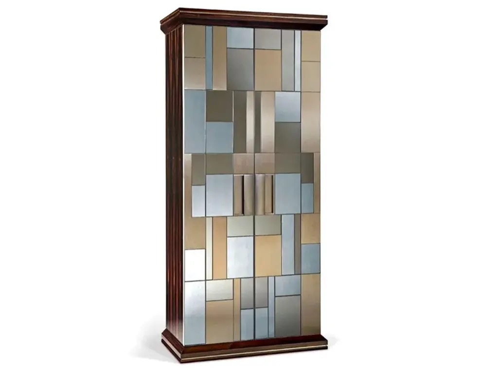 Structure with lacquer finish (many colours available), interior in stained melamine, handles in CODE stained melamine (many colours available). Glass panels with Blu guardian finish and extra clear screenprinted glass. Including 3 shelves and 6 bronze rods. Manufactured in Europe