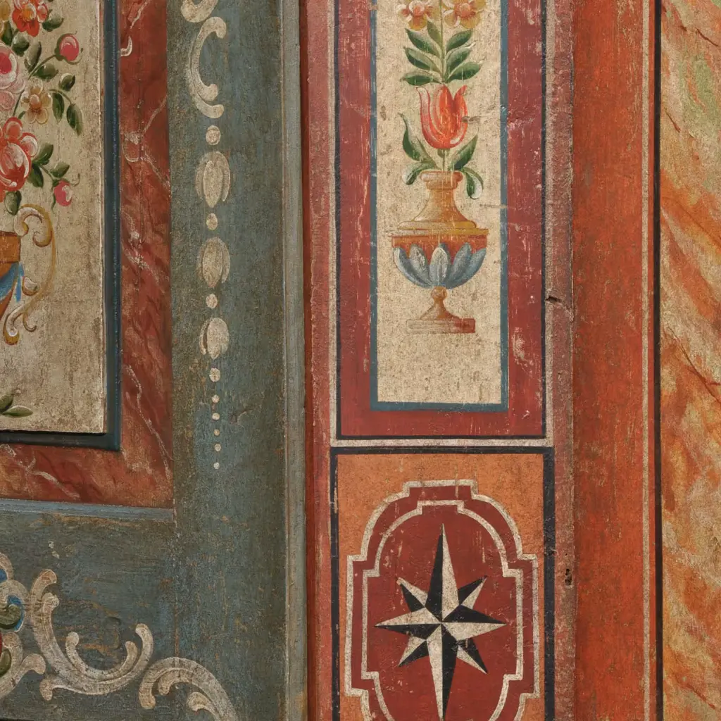 This marvelous artisan wardrobe minutely reproduces an original design in plush Baroque Tyrolean style from the 18th century. Boasting superb handpainted decorations obtained with polychrome water-based tempera paints and sealed by a layer of shellac, it surprises with the highly decorative impact that at once hints at the artisan mastery behind it. Please contact the Concierge for customizations.