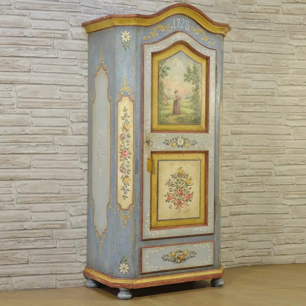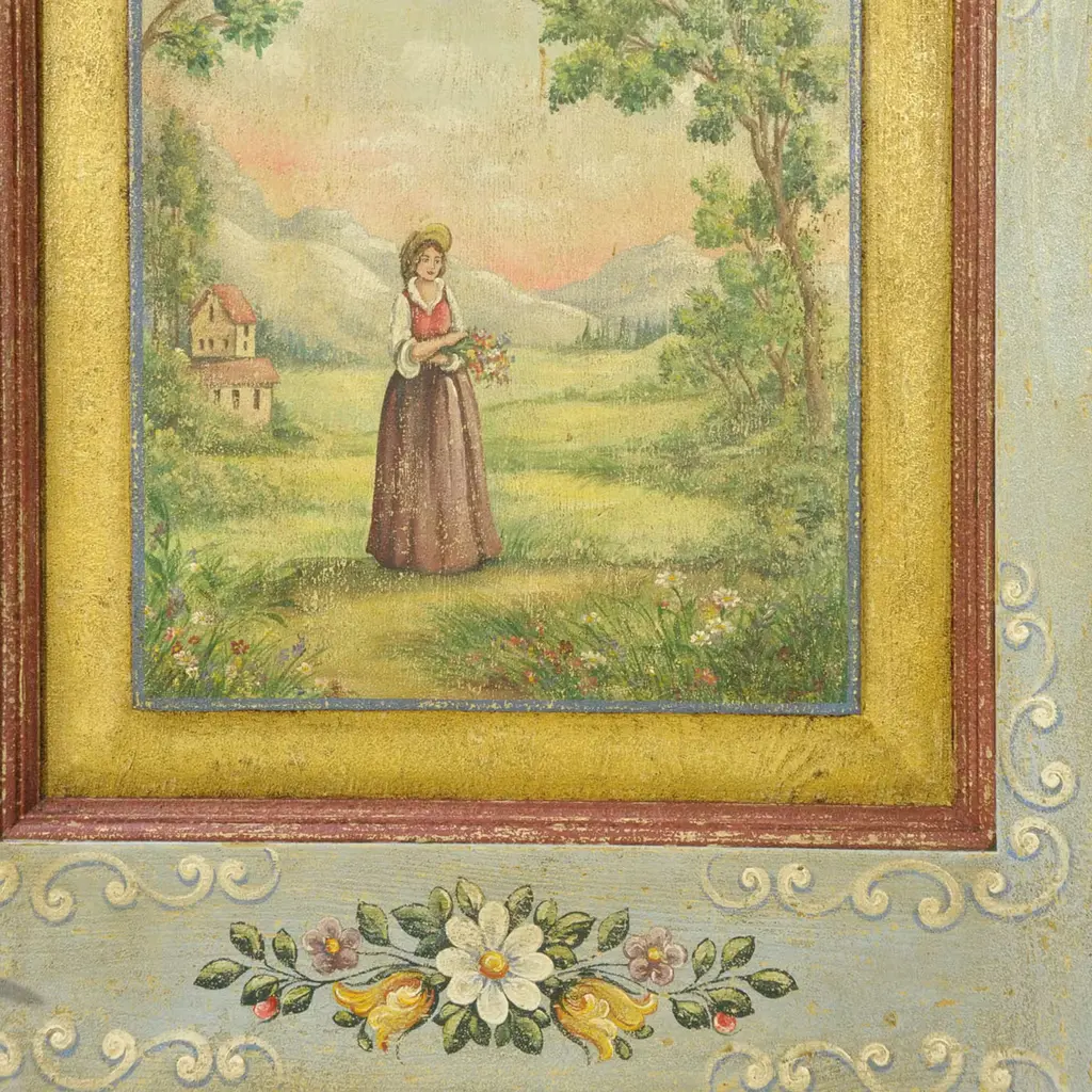 Baroque Tyrolean style from the 18th century gets celebrated in this one-off cabinetmaking gem exquisitely painted by hand. Protected by a layer of beeswax and shellac, the extensive tempera decorations include a bucolic glimpse surrounded by romantic floral accents. Turned feet and a sinuous cymatium complete this singular piece - equipped with one door and a drawer - customizable upon request to the Concierge.