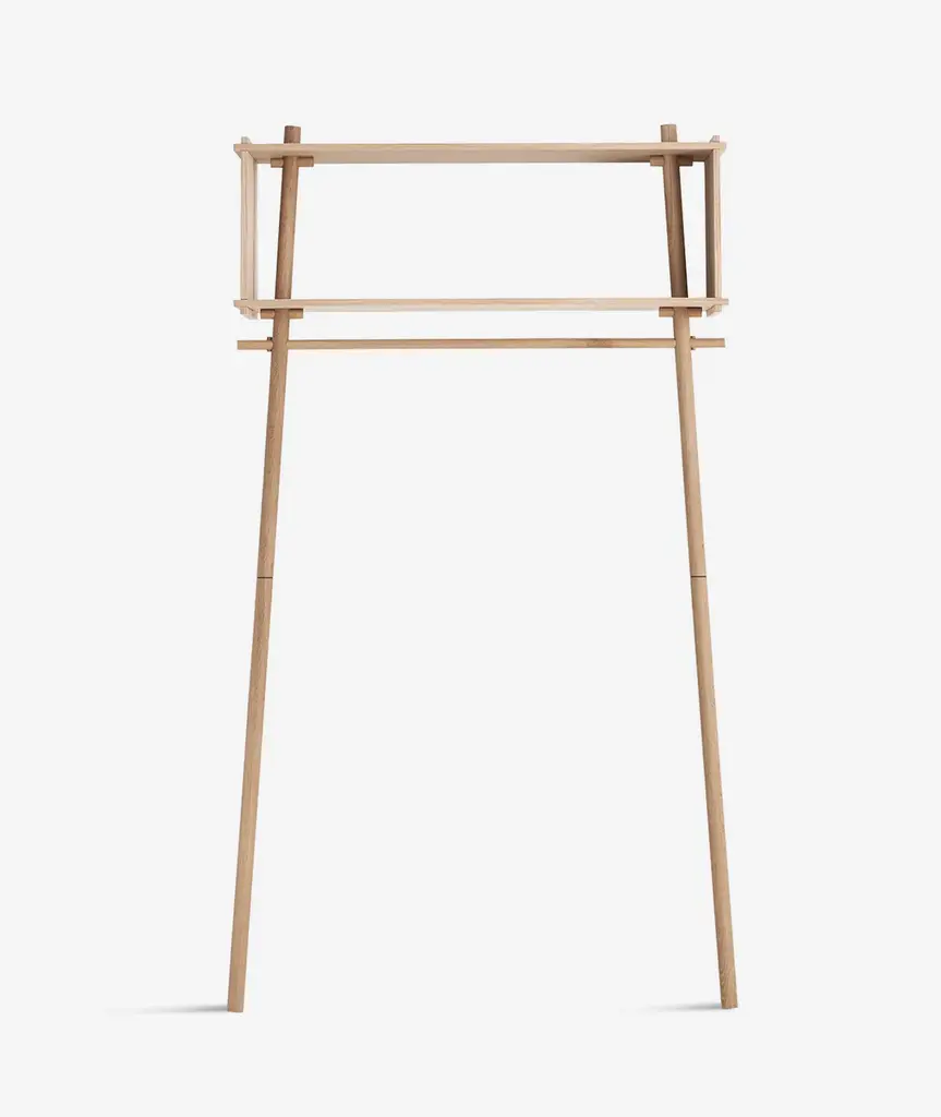Töjbox is a simplistic and functional wardrobe made of oak. The design is ideal for the entrance, bedroom or walk-in closet. Use the clothes rack to hang your shirts and jackets and store your every day belongings or favorite decorations in the box, while the angled legs leave space on the floor for shoes and bags.