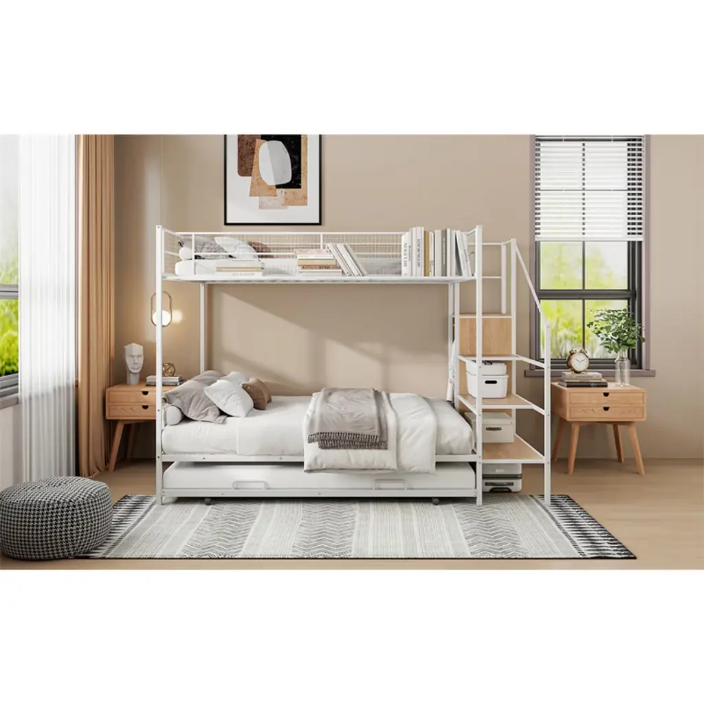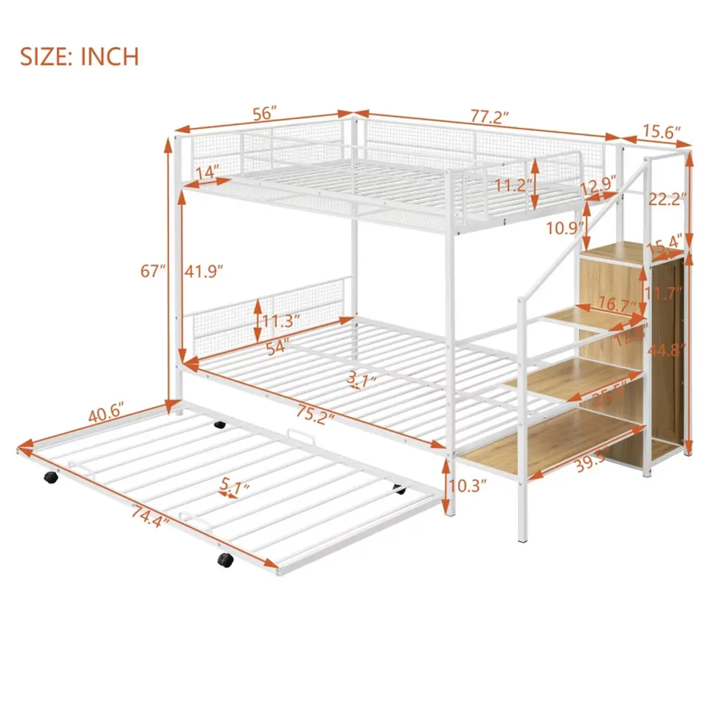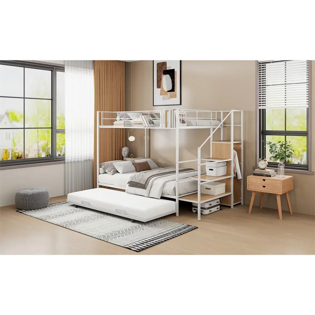 Twin Over Full Metal Bunk Bed With Trundle, Lateral Storage Ladder And Wardrobe