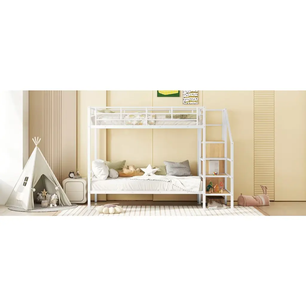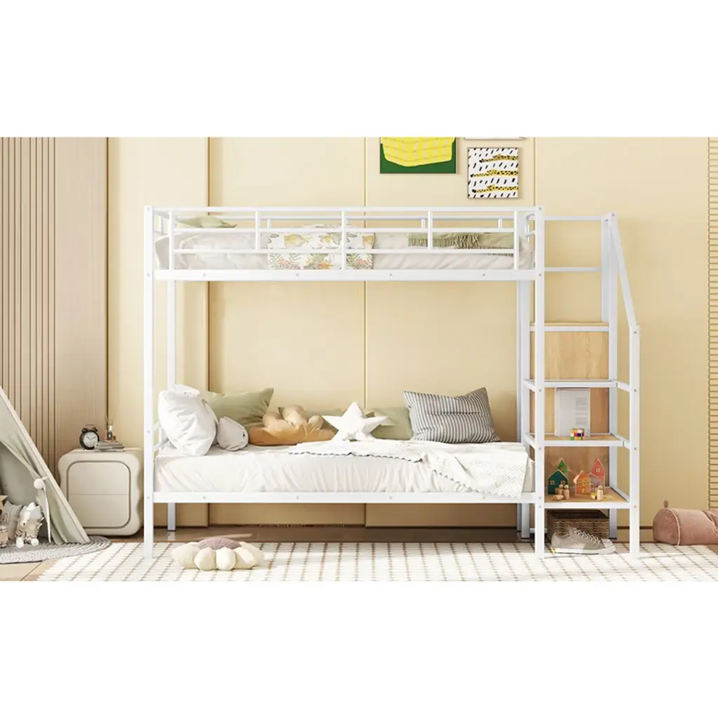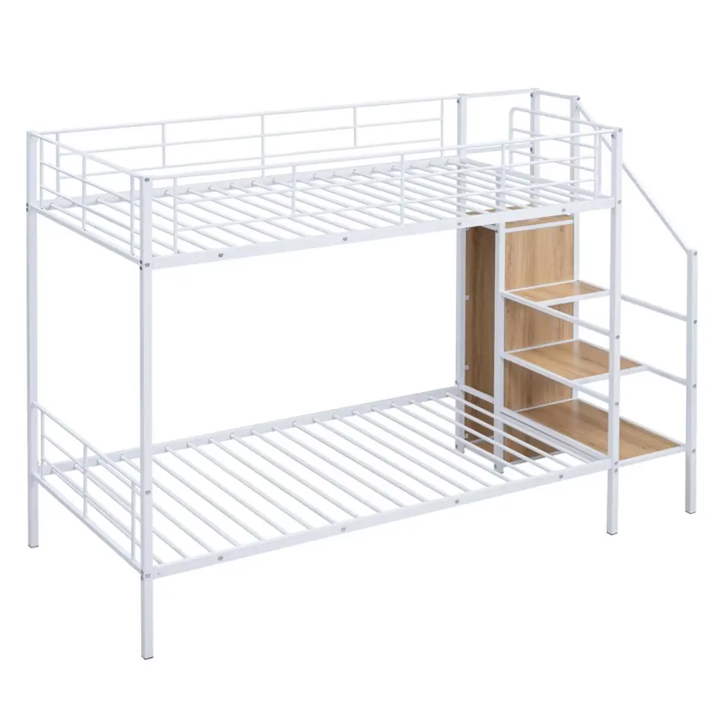 Twin Over Twin Metal Bunk Bed With Lateral Storage Ladder And Wardrobe