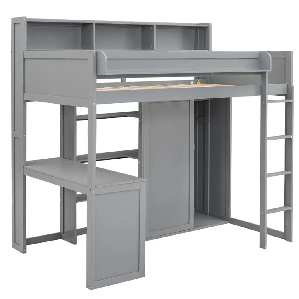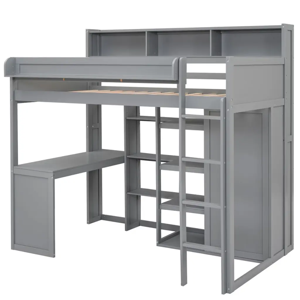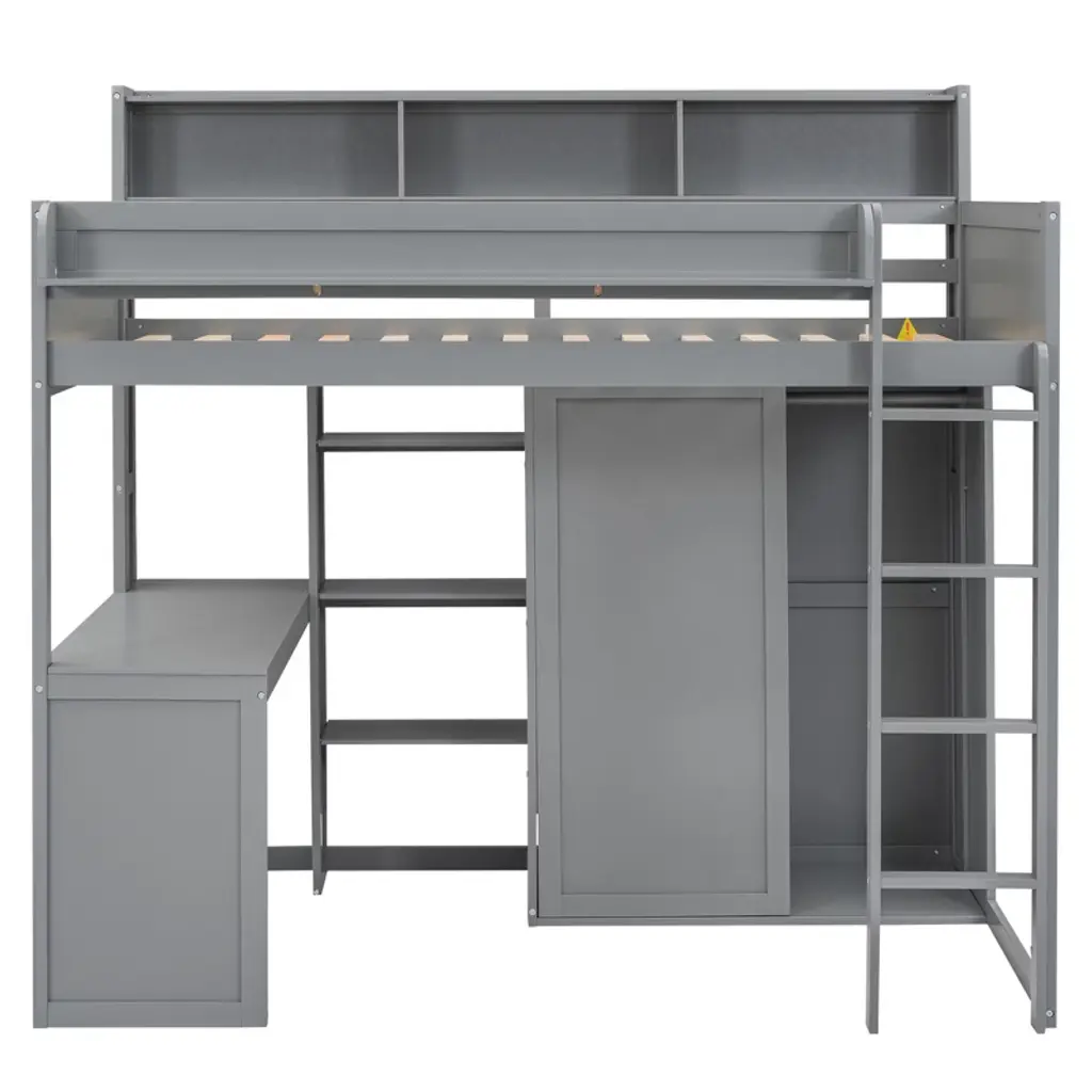 Twin Size Loft Bed With Storage Shelves And Wardrobe, Wood Loft Bed With Built-in Desk And Staircase For Kids Teens Adults, Gray
