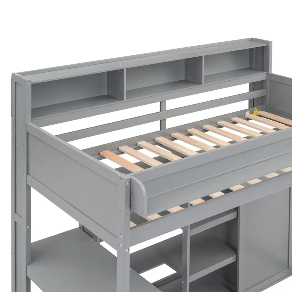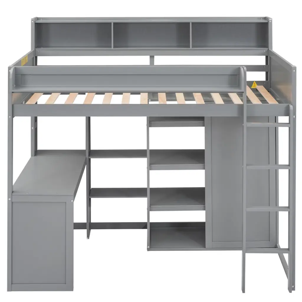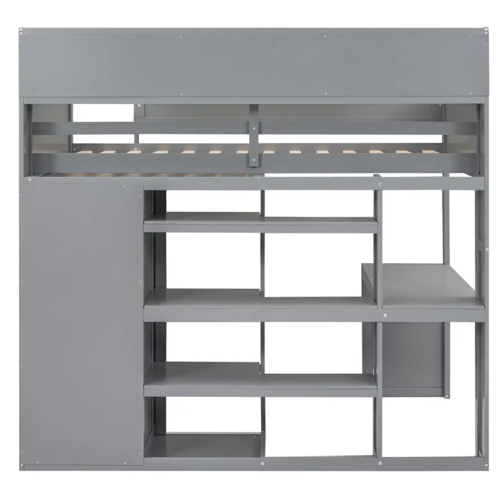 Twin Size Loft Bed With Storage Shelves And Wardrobe, Wood Loft Bed With Built-in Desk And Staircase For Kids Teens Adults, Gray