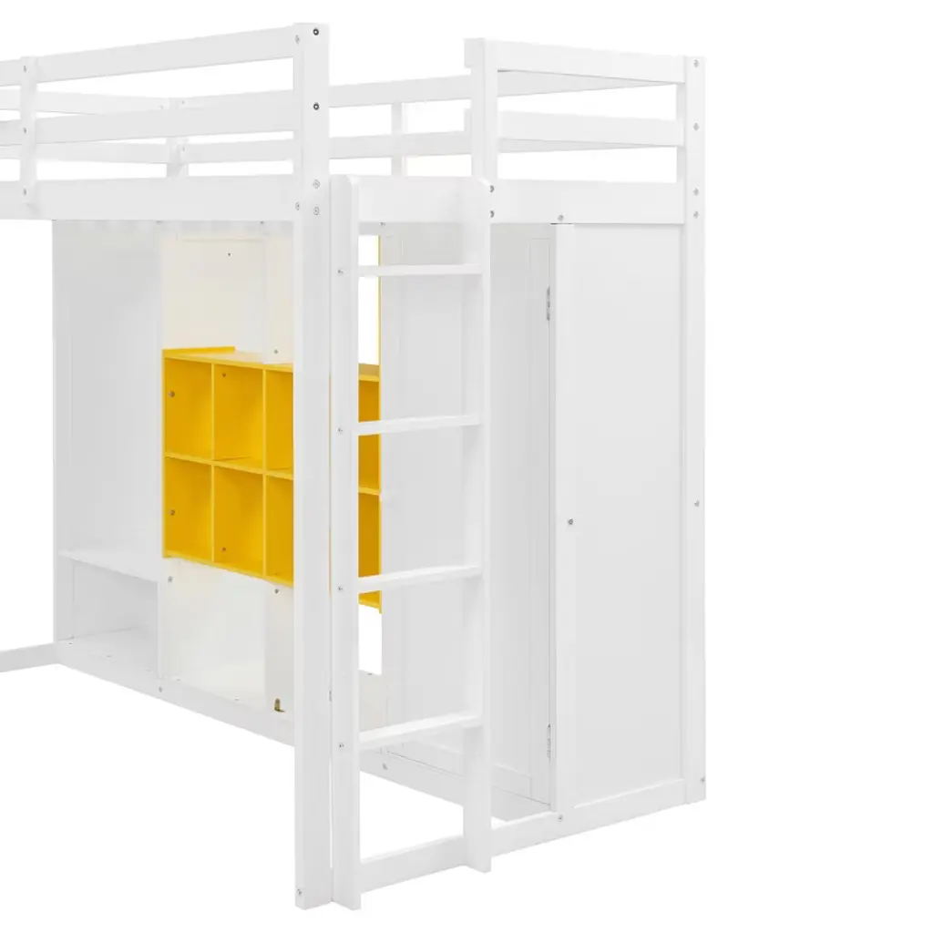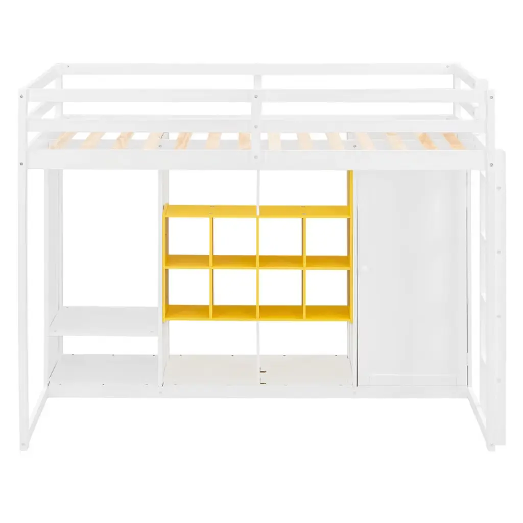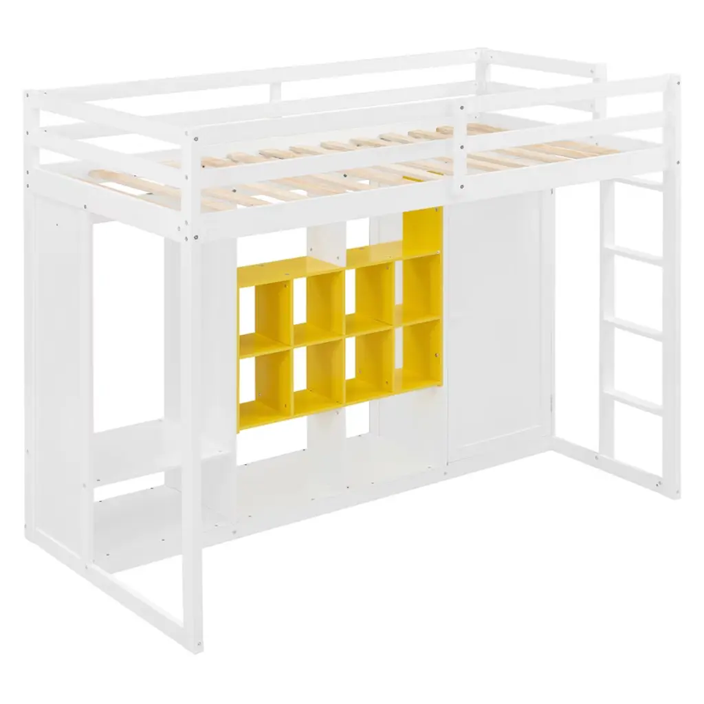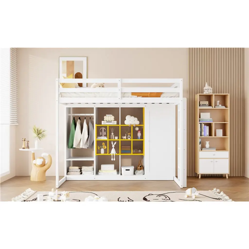 Product Features Smart Storage Solution: Comes with an open wardrobe, vibrant shelves, and a closed cabinet, offering diverse options to store clothes, toys, books, and more in one compact unit. Ideal for maximizing vertical space, this loft bed combines sleeping, storage, and organization functions—perfect for small bedrooms or shared spaces.Colorful & Stylish Design: The contrast between the bed’s wooden frame and the lively colored shelves creates a chic, modern look that brightens any room decor.Reversible Staircase: The ladder can be installed on the left or right side, giving you flexibility to match different room layouts.Safe and Sturdy Structure: Crafted from high-quality wood with strong bed slats and full-length guardrails to ensure long-lasting durability and maximum safety for teens.Dimensions & Assembly: 78.3"L x 42.4"W x 65"H. Mattress not included. Some assembly is required, although we have provided clear instructions and tools. Descriptions Maximize your space with this stylish and functional wooden loft bed, perfect for modern bedrooms with limited square footage. Designed with both safety and storage in mind, it features full-length guardrails and sturdy slats for reliable mattress support. The bed includes a vibrant multi-layer shelving system, a sleek open wardrobe, and a closed cabinet—offering ample storage for clothes, books, and essentials. The colorful shelving adds a bold pop of personality while blending harmoniously with the bed’s elegant wood finish. With a reversible staircase that can be installed on either side, this loft bed adapts easily to your room layout and daily habits. Weight & Dimensions Product Type: Loft BedProduct material: Plywood+MDF+PinewoodThe number of slats: 14Weight Capacity: 400LBSRecommended Mattress Thickness: 4-6"Recommended age: Over 6 yearsBox Spring Required: NoMattress Included: NoIs installation required: YesNotes: Manual measurement has been used, there may be some reasonable error. All the pictures are taken by actual samples, slight chromatic aberration may occur due to lighting or display.
