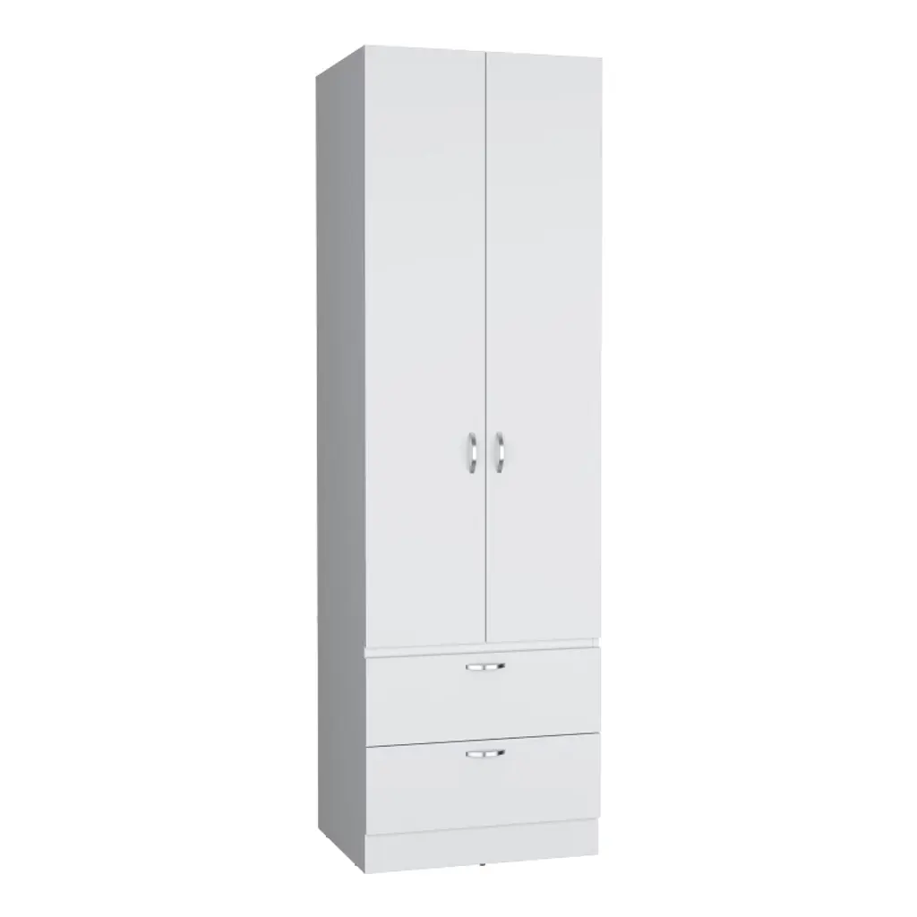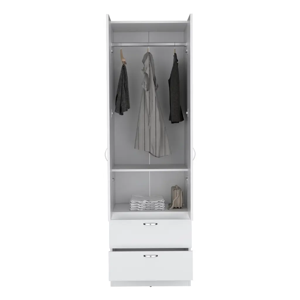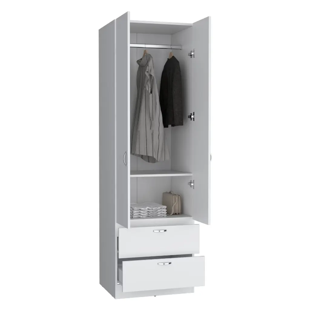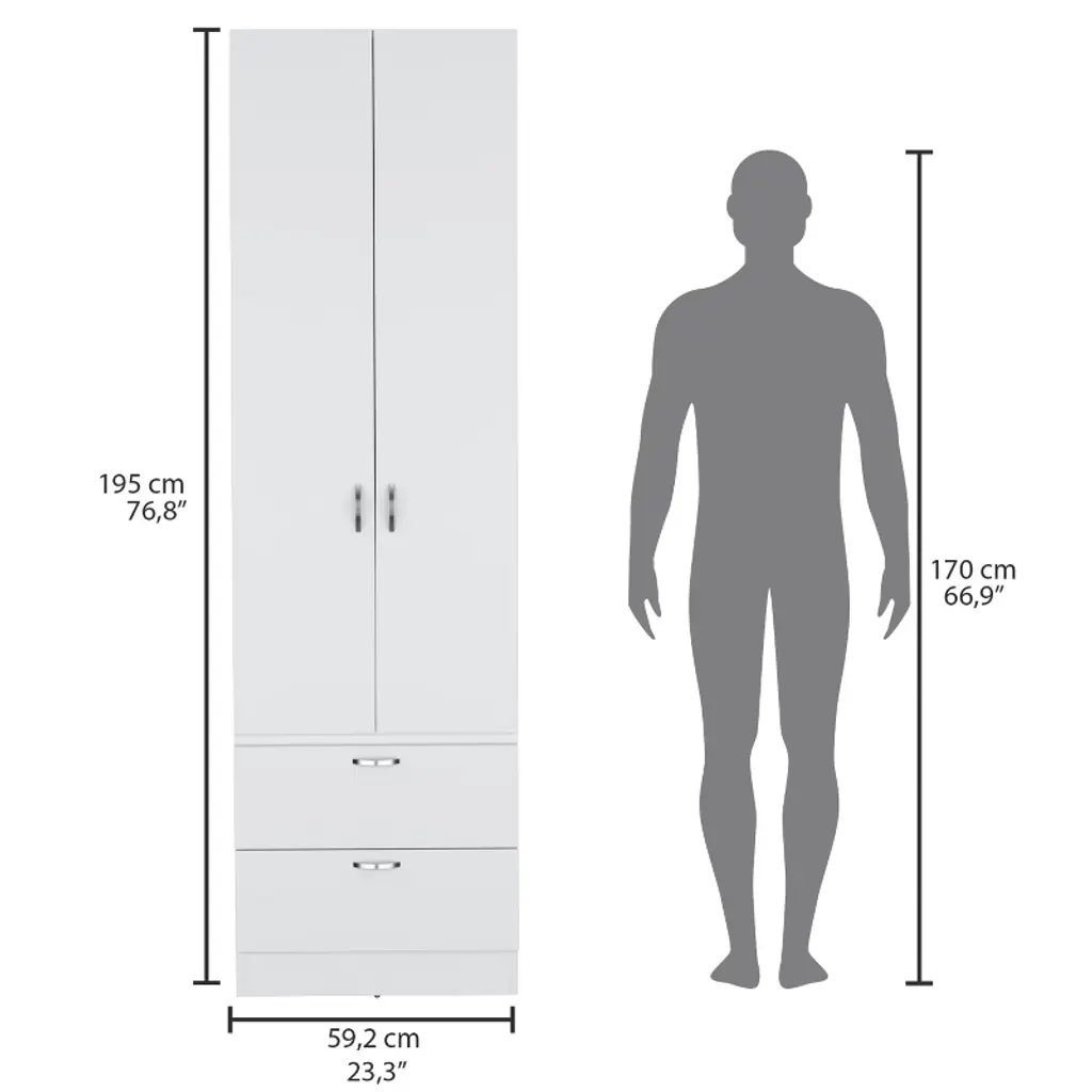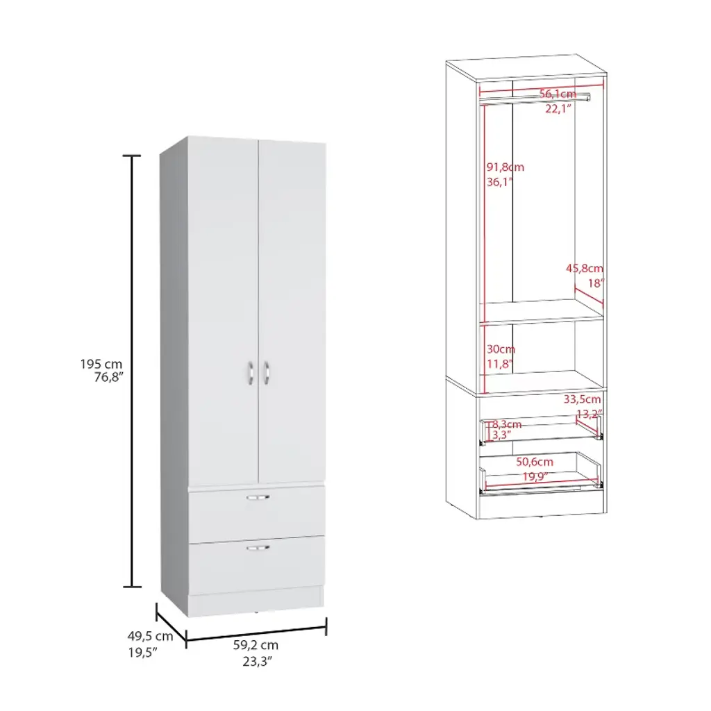 AMPLE STORAGE SPACE: This free-standing Armoire Wardrobe Closet provides versatile storage options with three key components including shelving, drawers, and a hanging section. Ideal for organizing clothing and accessories. VERSATILE SHELVING: With twoshelves , this armoire offers ample space for organizing folded clothes, including shirts, pants, bags, and shoes. SPACE-EFFICIENT DESIGN: This tall storage cabinet features doors and shelves, maximizing storage within a compact footprint. Whether utilized in the kitchen or bedroom, it seamlessly fits into any room. Featuring 2 Drawers 20-Inch Wide, that will give you options for storaging your undergardments and socks. HANGING SPACE: With dimensions of 23.3 inches wide and 76 inches high, this armoire includes a hanging rod to store your pants, dresses, and shirts wrinkle-free.