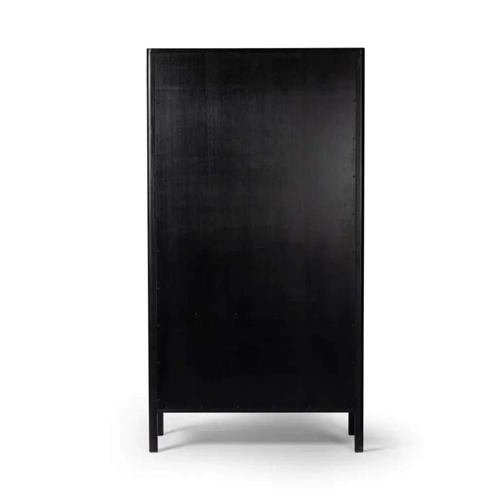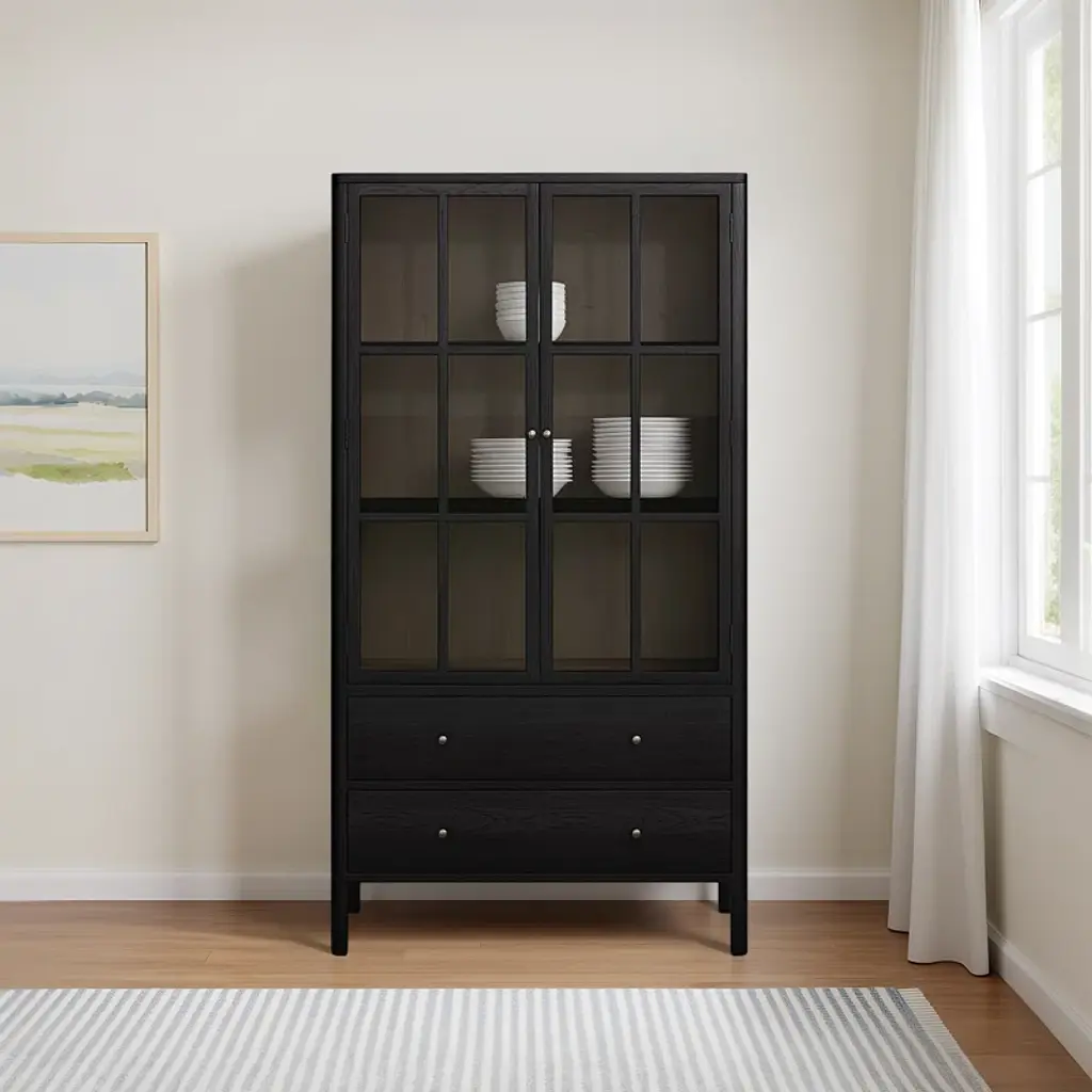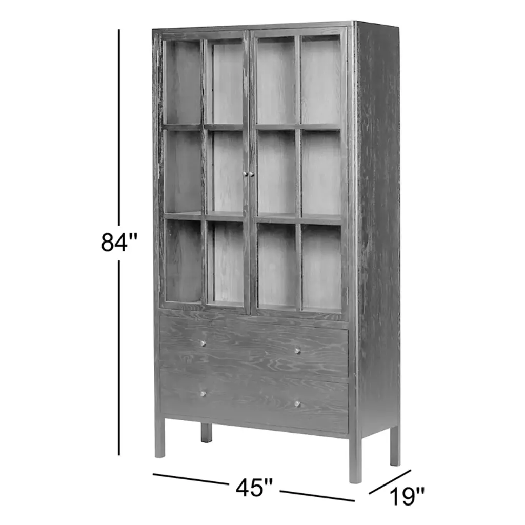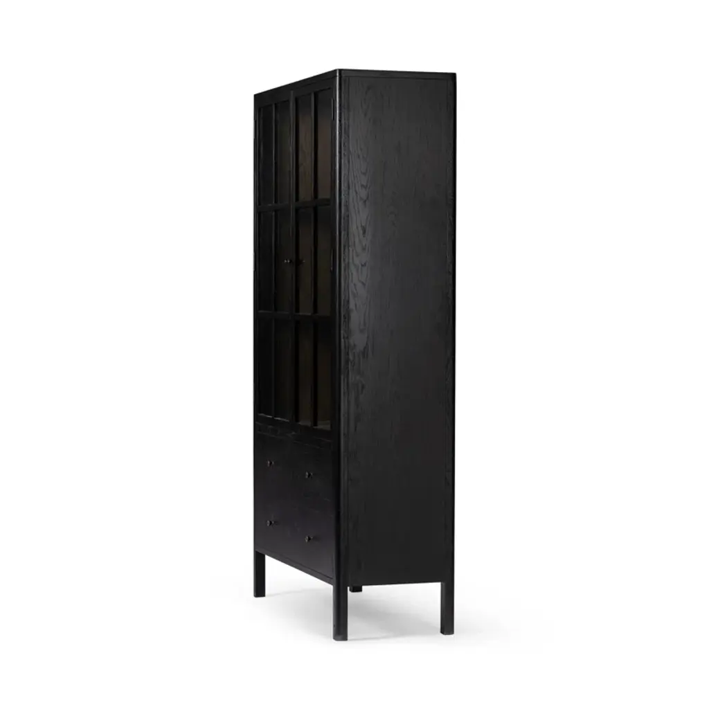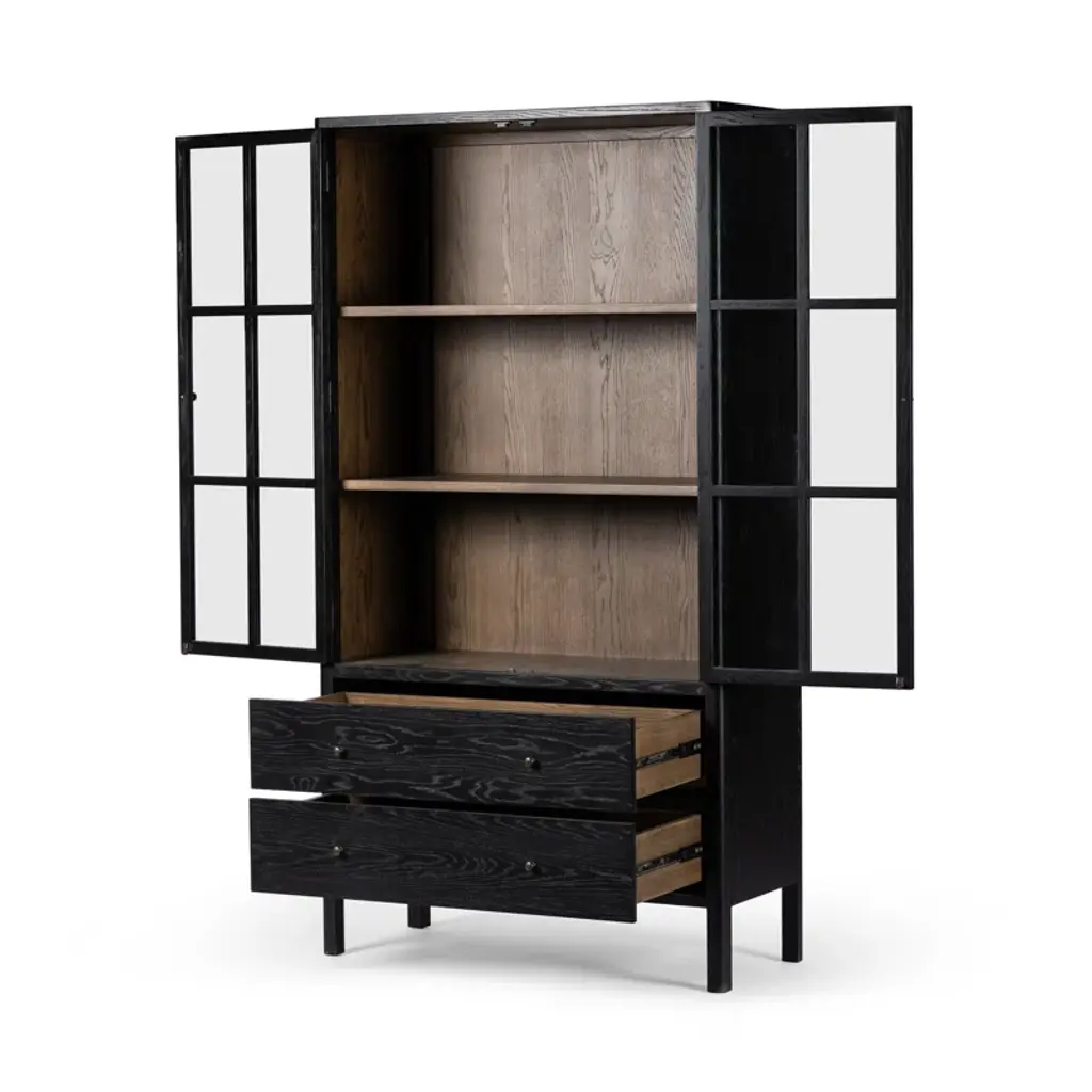 A completely transitional piece, this two-toned cabinet features a blend of understated modern design with a hint of heritage detailing. Crafted from solid oak and oak veneer with a brushed ebony oak exterior and tan oak interior. Built with a variety of storage options and finished with iron hardware and large tempered glass cabinet doors.