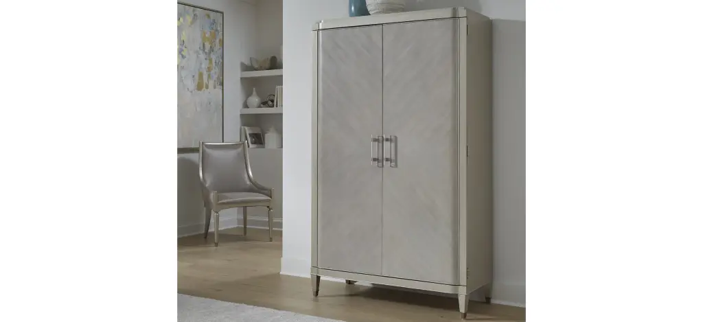 Zoey Storage Armoire Cabinet effortlessly transform this armoire into a workspace, while the interior shelving and four spacious drawers help keep your space uncluttered and organized. Tapered legs with silver-finished ferrules offer support and stability for the champagne-finished frame. Whether used in your bedroom or home office, this armoire cabinet adds function and a timeless, elegant appeal to your home.