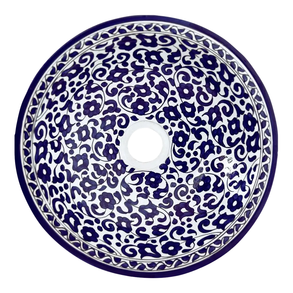 2010s Moroccan Blue Ceramic Handmade And Hand Painted Round Washbasin Sink, Zowaqa