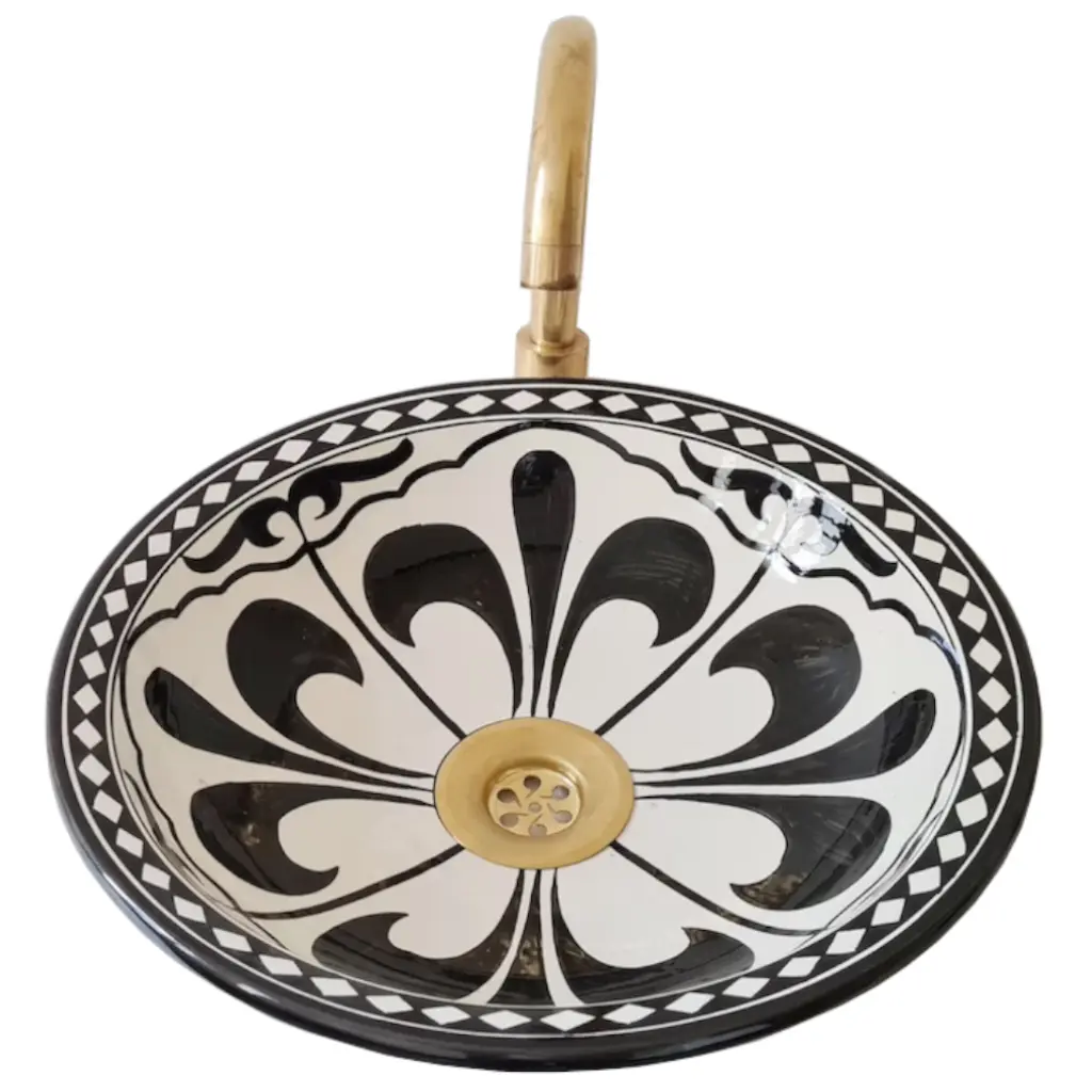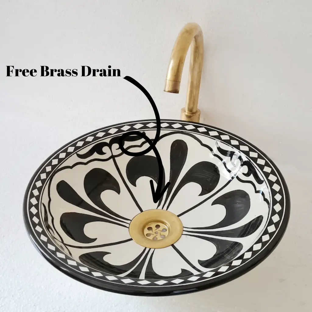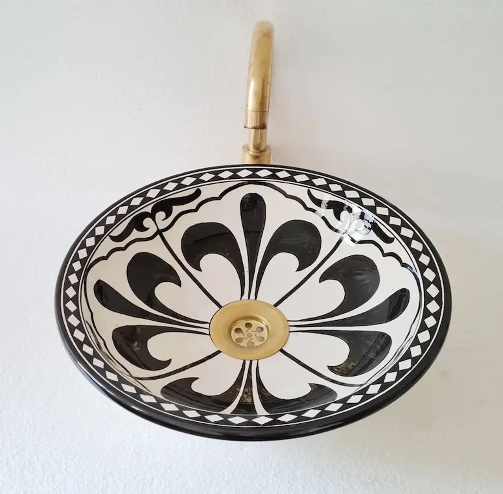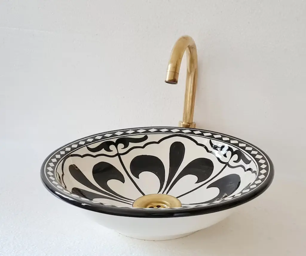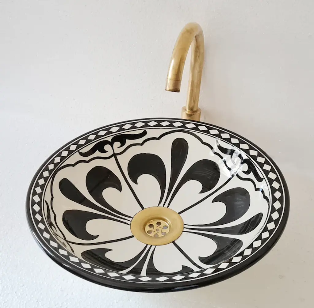 * Introducing our Moroccan Sink, a stunning addition to elevate your bathroom decor. This exquisite vessel sink is made from high-quality ceramic, offering both durability and timeless beauty. * Crafted with meticulous attention to detail, this sink features a design that adds a touch of elegance to any bathroom. However, we offer customization options, allowing you to choose your desired color to perfectly match your unique style. * Please note that the faucet is not included with the sink. * The ceramic construction ensures long-lasting use, while the smooth finish adds a luxurious touch to your space. With its generous size and deep basin, this sink provides ample room for daily use, offering convenience and functionality. * Our Moroccan Sink is designed to complement a variety of interior styles, from modern to traditional. Its versatility makes it a perfect fit for any bathroom renovation or upgrade project. * Enhance your bathroom with the beauty and functionality of our customizable Moroccan Sink. Experience the perfect blend of craftsmanship and style that will transform your bathroom into a luxurious oasis. Choose your color and create a personalized statement piece that reflects your individual taste.