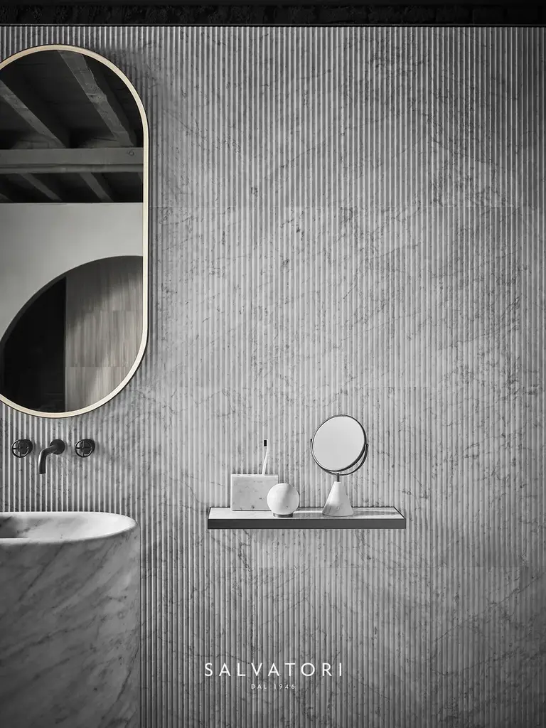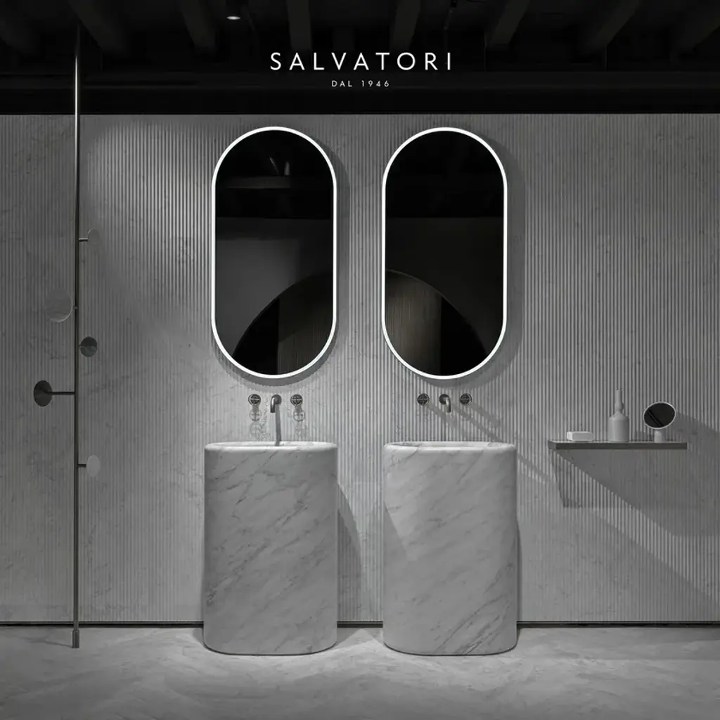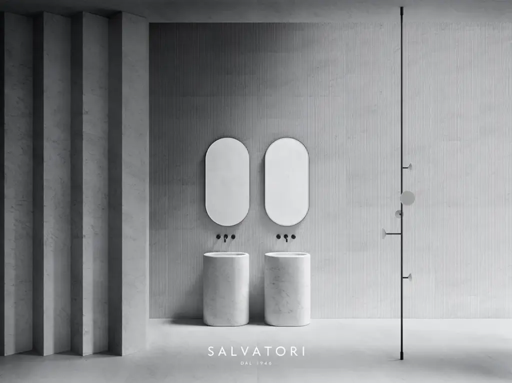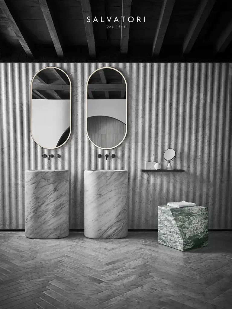 Balnea is a solid column of natural stone, with the top area carved out to create the soft curve of a basin, this is a truly sculptural piece which brings elegance and sophistication to the bathroom.Available in Bianco Carrara, Crema d’Orcia, Gris du Marais® and Pietra d’Avola, it bears the inimitable touch of its designer Elisa Ossino who created the entire Balnea collection round the sculptural quality of natural stone.Variants:Bianco CarraraCrema d'OrciaGris du MaraisPietra d'AvolaElisa Ossino enriches her research on the interpretation of white Carrara marble with Balnea. The sensitivity and sculptural quality of the natural stone inspires a new series of accessories and objects of extraordinary aesthetic coherence. Built around the contrasts of Ossino’s two-dimensional architectural marks and the plastic monumentality of precious marble, the collection is lightened by a balancing act of contrasting voids. Washbasins, storage units, shower trays and hangers complement Ossino’s grand monolithic bathtubs, their imposing forms tempered by fluttering woven linen curtains.