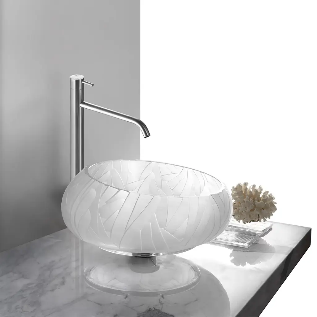 Italian handcrafted crystal sink with matte bamboo grinding and 24% lead crystal. Functional elements create an exceptionally elegant, welcoming, and high-value bathroom experience.