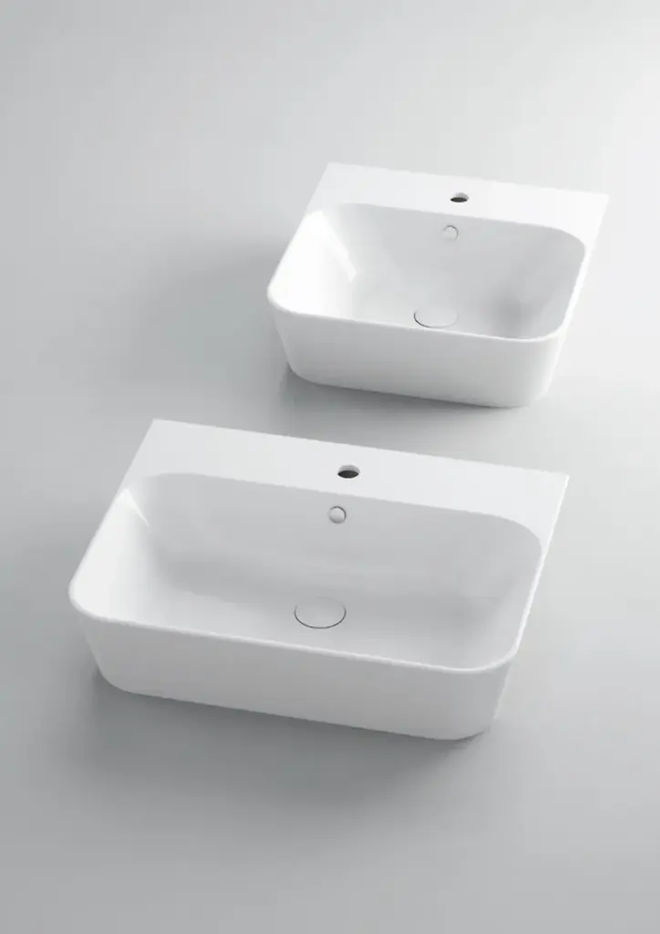 Build is a rectangular ceramic washbasin.The drain can be purchased separately. Build is inspired by the purity and clean lines of Nordic design. It consists of floor-mounted and wall-hung sanitary ware, an elegant freestanding bathtub and various models of the washbasin with wooden units. The toilets feature the Easy Clean and Water saving system, patented technology, which allows a complete single flush of 3 litres instead of 9 litres required for a standard flush. Build consists of storage containers available in elm with a white, natural or cement finish. Certified anti-bacterial treatment is available on request for all ceramic products.
