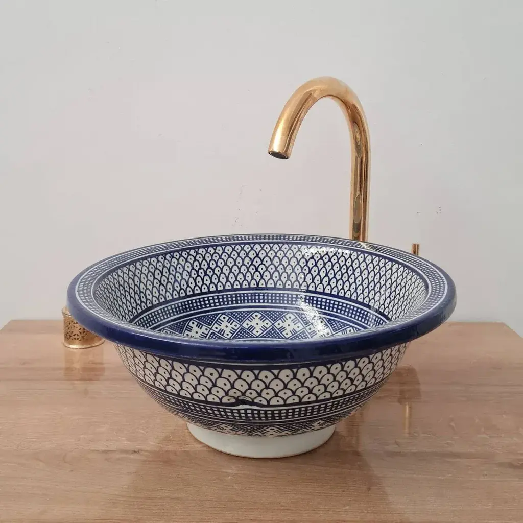This Moroccan earthenware washbasin is an exquisite customary plan, high quality and painted by craftsmans. Exquisite, huge sink directly from Morocco, maded in a conventional method from the old city Fez, known as a popular method to portray the wealth of plan and examples just as for the power of shadings which are so trademark. This sink will assist you with getting a more close to home and individualistic style for your washroom or kitchen, all of them are one of a kind on the grounds that the bowls are perfectly handcrafted and painted by a conventional craftsmans. The underlying wash bowls are agreeable and reasonable being used as well as amazingly simple to clean. Ideal for little restroom or kitchen.
