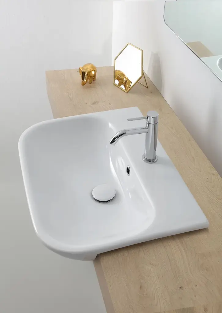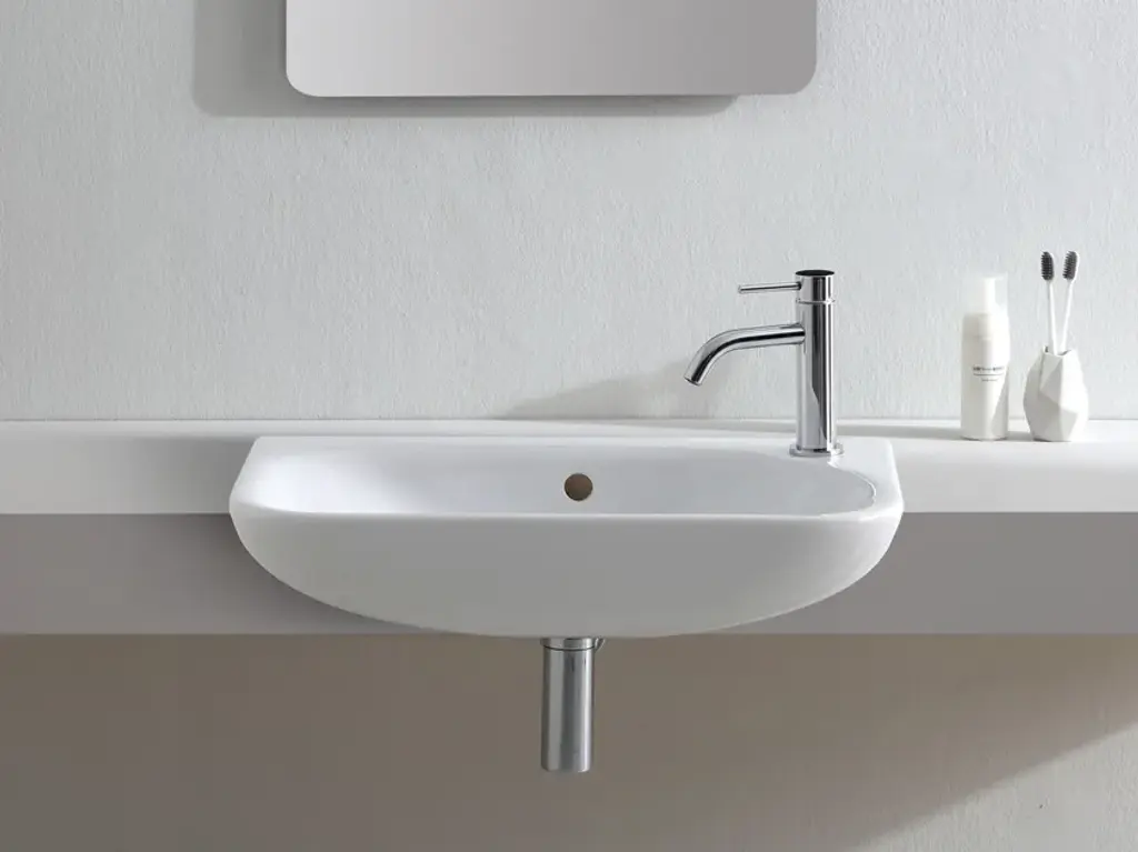 CLEAR is a semi recessed washbasin 54, one tap hole.The new range “Clear” is simple, linear, essential and it represents the Olympia answer to the demands of the actual trends of design.“Clear” is characterised by soft volumes and contained dimensions. Its simplicity and elegance are proclaimed by the copious basin of the washbasin, that can be placed on a sober ceramic top or a thin and harmonious pedestal.The soft and wrapping volumes of the “Clear” wash basins have a stylistic grace, that represents aesthetic timeless principle. They are available in four different sizes -750x450 mm, 650x450 mm, 550x450 mm, 450x350 mm. In order to allow a collocation in every kind of place, offering the possibility to have an elegant bathroom even in a small space. The designer of the “Clear” style is articulated in different versions - Back to wall - Water Closet - Wall hung offering a variety of combining for furnishing solutions that satisfy specific needs, matching functionality and style.