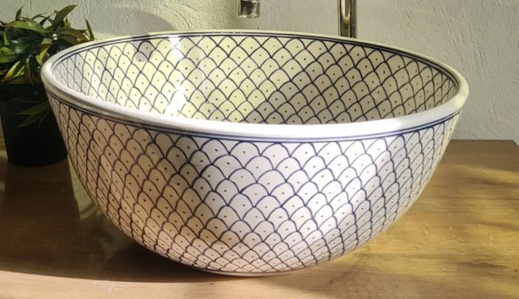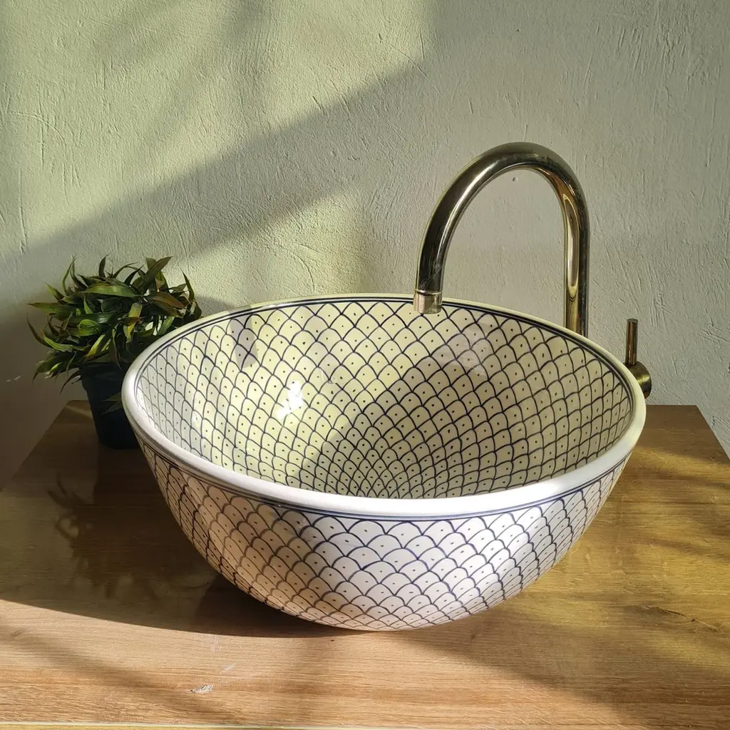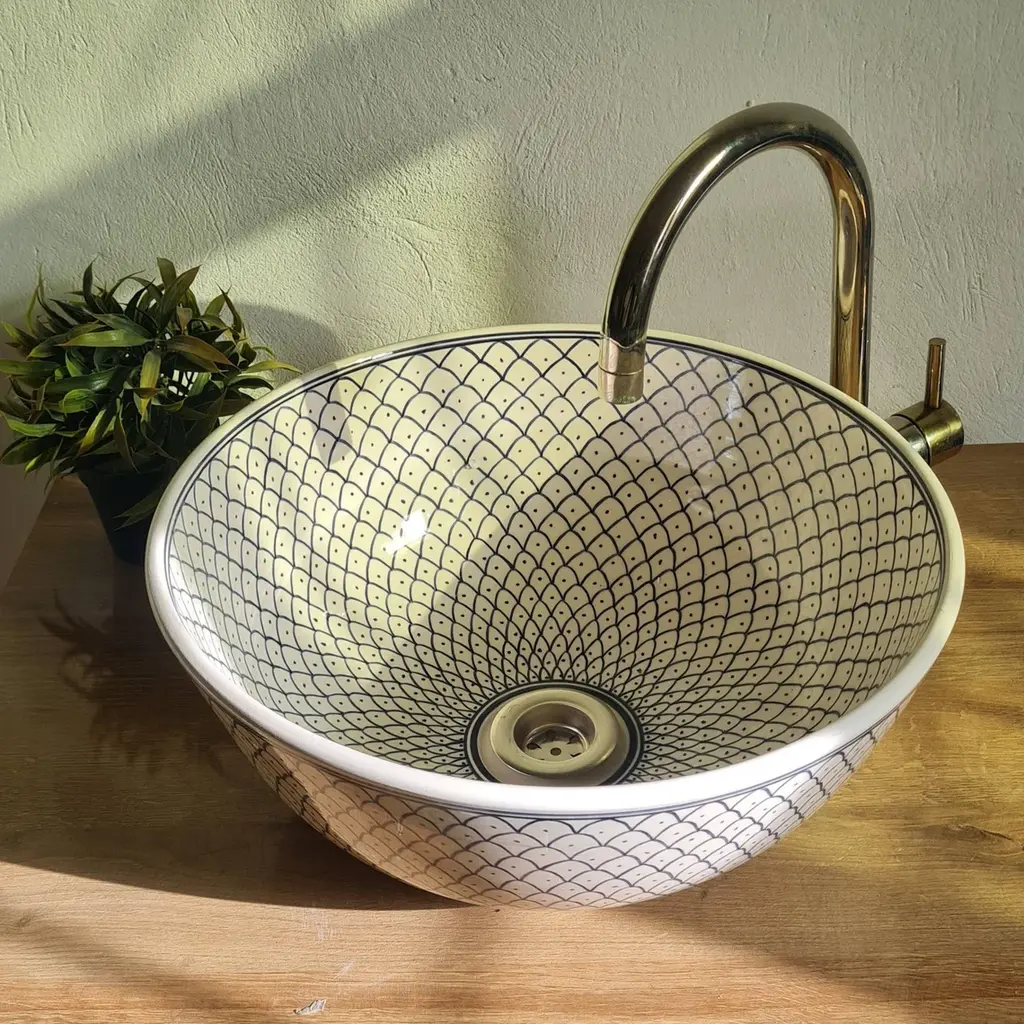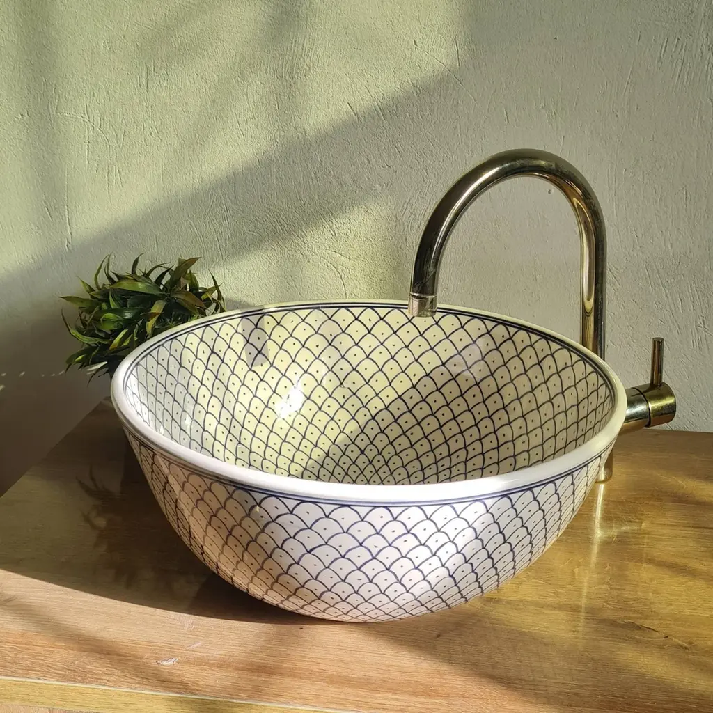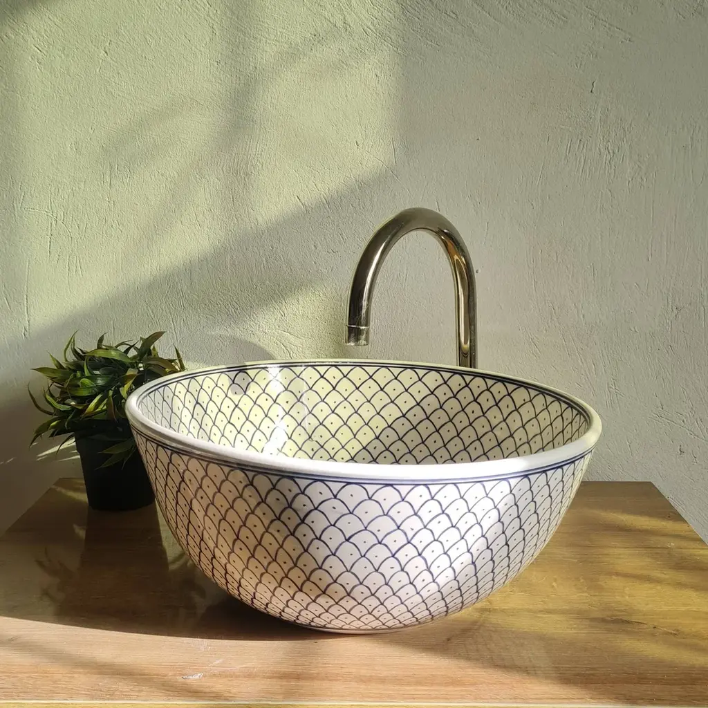 Introducing our Navy Blue Fish Scales Ceramic Bathroom Washbasin, a unique and stylish addition to elevate your bath décor. Crafted with attention to detail, this washbasin features a mesmerizing fish scales pattern in a rich navy blue color, creating a captivating focal point for your bathroom. Made from high-quality ceramic, this washbasin is not only visually appealing but also durable and easy to clean. Its smooth surface ensures hassle-free maintenance, allowing you to enjoy its beauty without the worry of constant upkeep. The navy blue color adds a touch of sophistication and tranquility to your bathroom space, creating a calming atmosphere for your daily routines. Whether you're updating your current bathroom or starting a new design project, this washbasin is sure to make a statement. Measuring 16 inch, it offers ample space for all your washing needs while fitting seamlessly into your existing countertop or vanity. Its versatile design makes it suitable for various bathroom styles, from contemporary to coastal or even nautical-themed interiors. Transform your bathroom into a sanctuary of style and elegance with our Navy Blue Fish Scales Ceramic Bathroom Washbasin. Indulge in the beauty of its intricate design, and enjoy the practicality of a high-quality washbasin that effortlessly merges aesthetics and functionality. Order yours today and take your bathroom décor to new depths of sophistication.