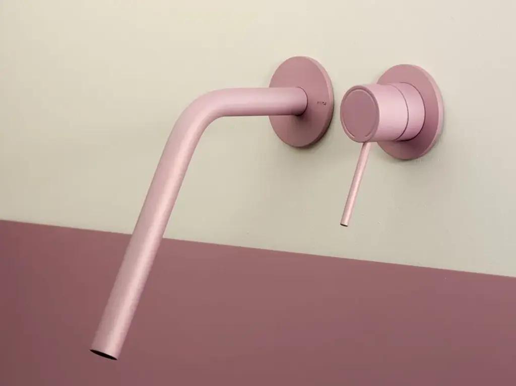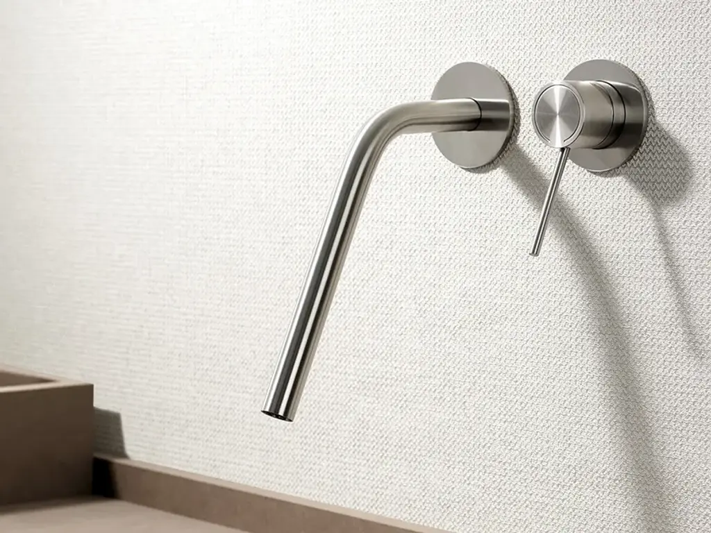 CORSIVO | Wall mounted basin mixer group. Wall mounted mixer set with spout 190 mm ø21 H 180 - stainless steel AISI 316 L.Available finishes: Brushed stainless steel, Deep grey inox, ceraMINA colors.CORSIVO is a wall-mounted built-in set, mixer plus spout Ø21 L.190 H 180 – AISI 316 L stainless steel.FEATURES – BASIN TAPS: 2-hole, wall-mounted, basin mixer, with aerator. Available finishes: brushed stainless steel, polished stainless steel, deep grey PVD, gold PVD, ceraMINA colors.The slim spout, the straight aerator, the consistent inclination of the lines. Almost as if the tap leans towards the user to make its use more comfortable, especially in the built-in solutions. This is how Corsivo guides water toward the hands, in a complete collection where the fine detailing on the stainless steel underlines the product’s artisanal nature and enhances its surfaces. The collection is also available in the ceraMINA version: a palette of ceramic colors with pearly shades designed to match the perfect hue for every project. From pearl black to calm green, passing through sweet blue, light rose, rich brown, vivid orange, and golden yellow.