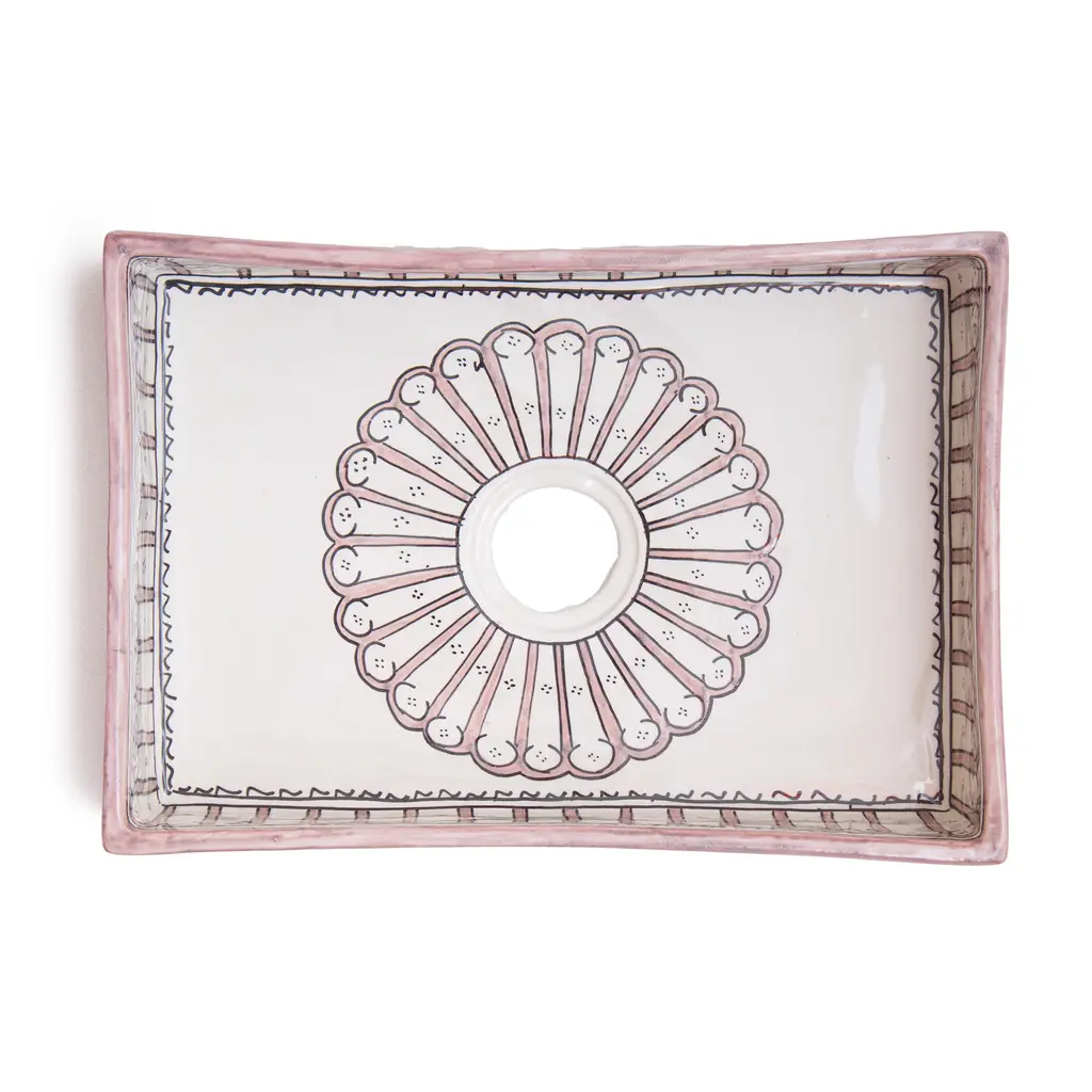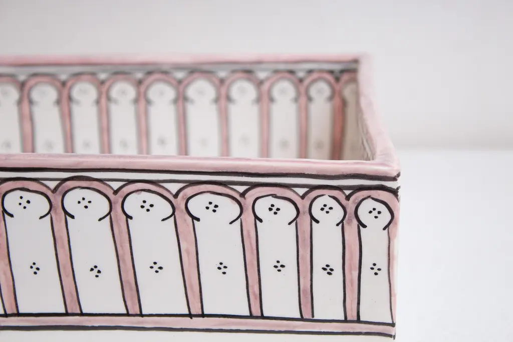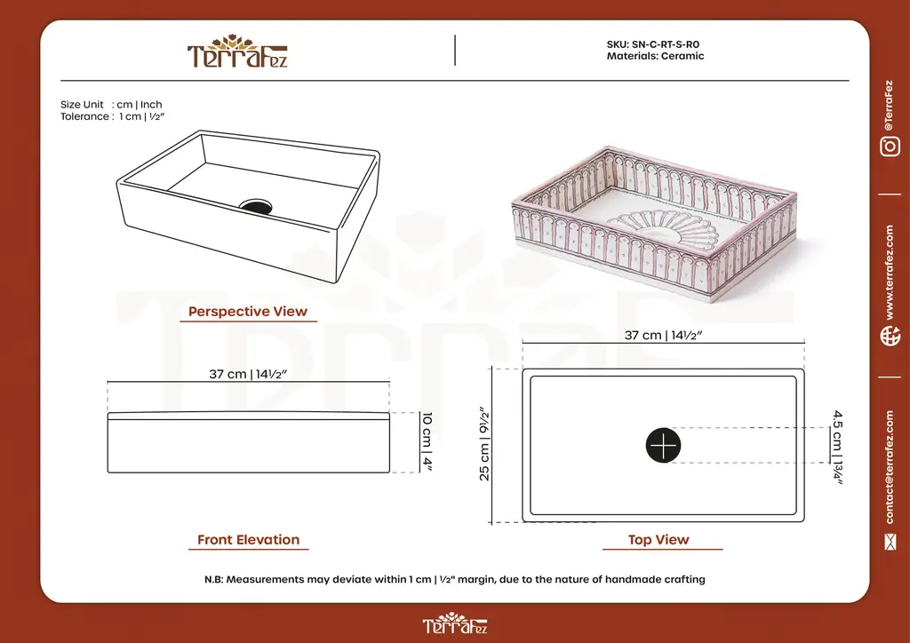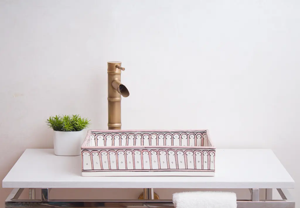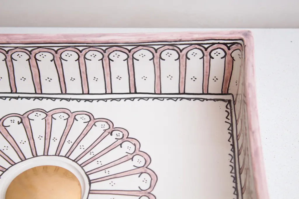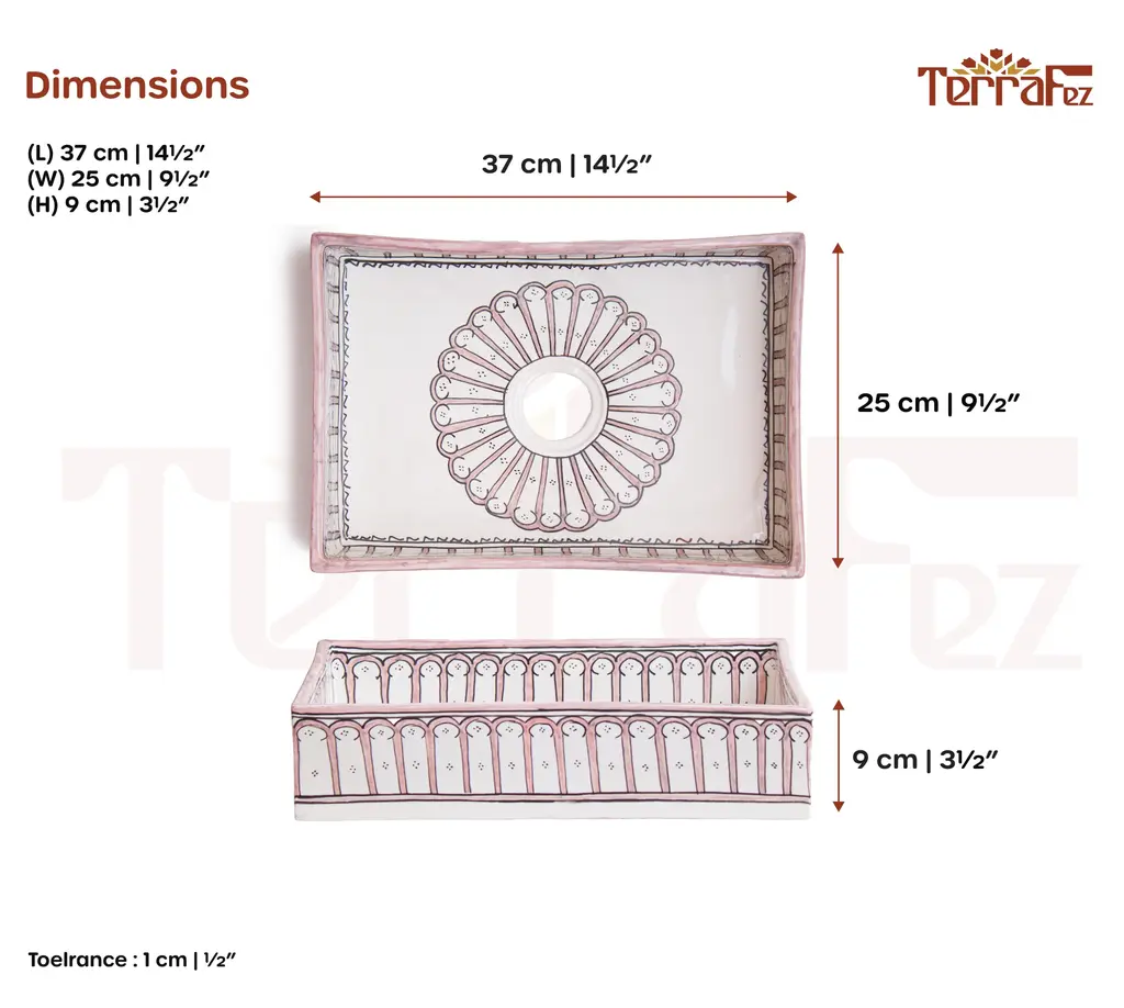 ✔️ What You See is What You Get!! : All photos are 100% Authentic Images of our actual handmade products, taken by us in-house. We DO NOT use AI-generated images AT ALL. Our graphic designer uses Photoshop exclusively for background removal and product cutouts. No alterations are made to the product itself, its colors, textures, or any of its physical features. Handmade Green Ceramic Rectangular Sink Featuring traditional pink "Mehrab" Pattern – Traditional Fez Pottery Vanity Washbasin with Elegant Pattern. Decorative Vessel Basin for Boho, Minimalist, or Luxury Bathroom Interiors. Unique Hand-Painted Countertop Art Piece from Morocco. Oriental Artisan Bathroom Statement Sink in Green Ink over White Glaze Above-counter installation suits various vanity styles. Glazed ceramic construction resists water spots and staining. Regular cleaning with mild soap maintains the surface finish. ----- Sizes & Dimensions ----- Dimensions : Length: 37 cm | 14½" Width: 25 cm | 9½” Height: 9 cm | 3½" ⚪ Drain: 4.5 cm | 1¾"