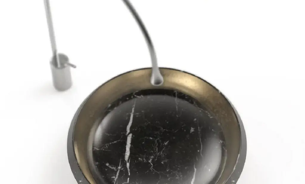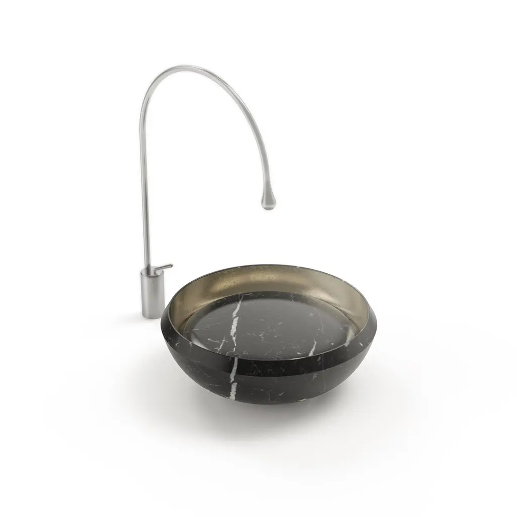 Eclissi washbasin by Marmi SerafiniMaterials: Nero Marquinia marble, Gold Leaf.Dimensions: D 47 x H 16 cmAvailable in other marbles.Tap not included.As the sun, obscured by the moon during an eclipse, reveals an awe-striking fiery rim of light, so this washbasin is simply but effectively embellished by an inner gold-leef rim.Curved lines are the main feature such as the soft curved bottom of the washbasin, which collects the water gliding down the golden rim.Marmi Serafini is located in a small city named Chiampo, internationally well known for its marble production.It's origins stem from Mr. Bruno Fortunato's passion for marble which was then passed on to his two sons, Alessandro ad Luca, who eventually took over.Marmi Serafini has, with the passing of time, transformed into one of the most innovative marble factories, producing extremely design-driven products and objects.