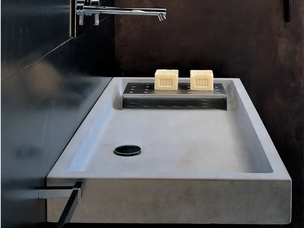 Elle is a rectangular wall-hung washbasin made of concrete.Line of wall hung and above inserted wash basins made of cement finish mortar with water-repellent, elasticizing and stabilizing additives available in grey, white and sand-colored paste.These molded elements maintain a hand-made appearance that is dedicated to the discerning client seeking innovation in the style and aesthetics of interior décor.