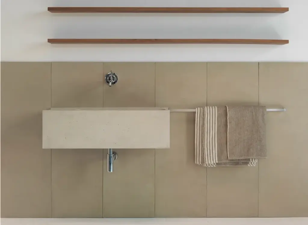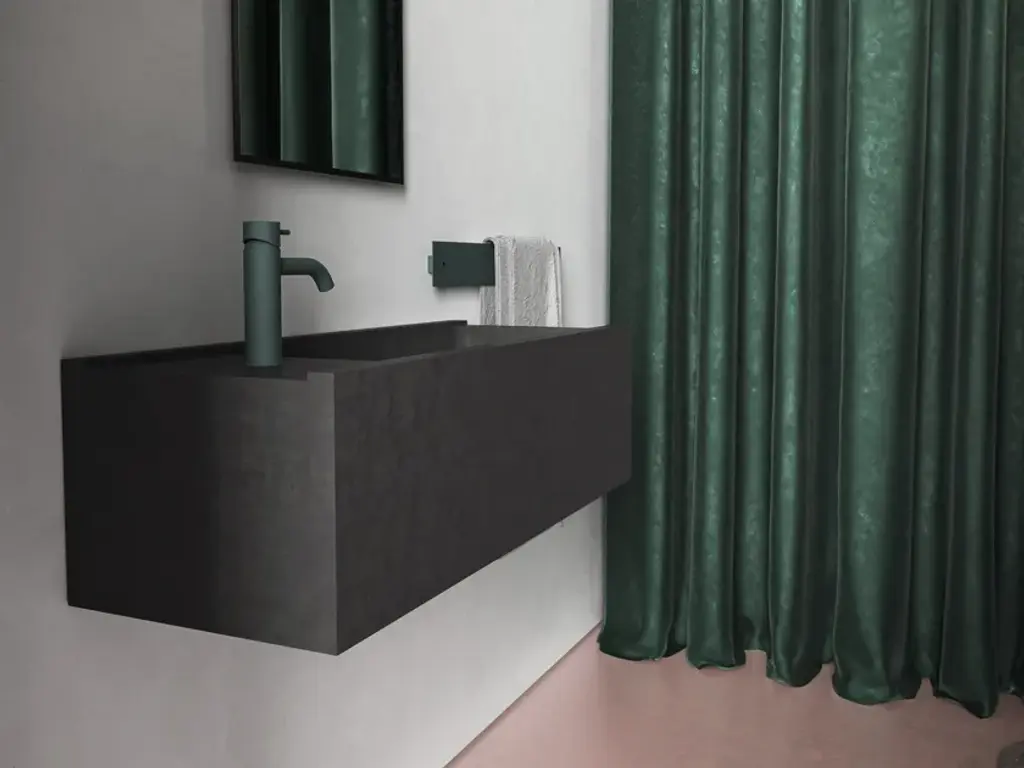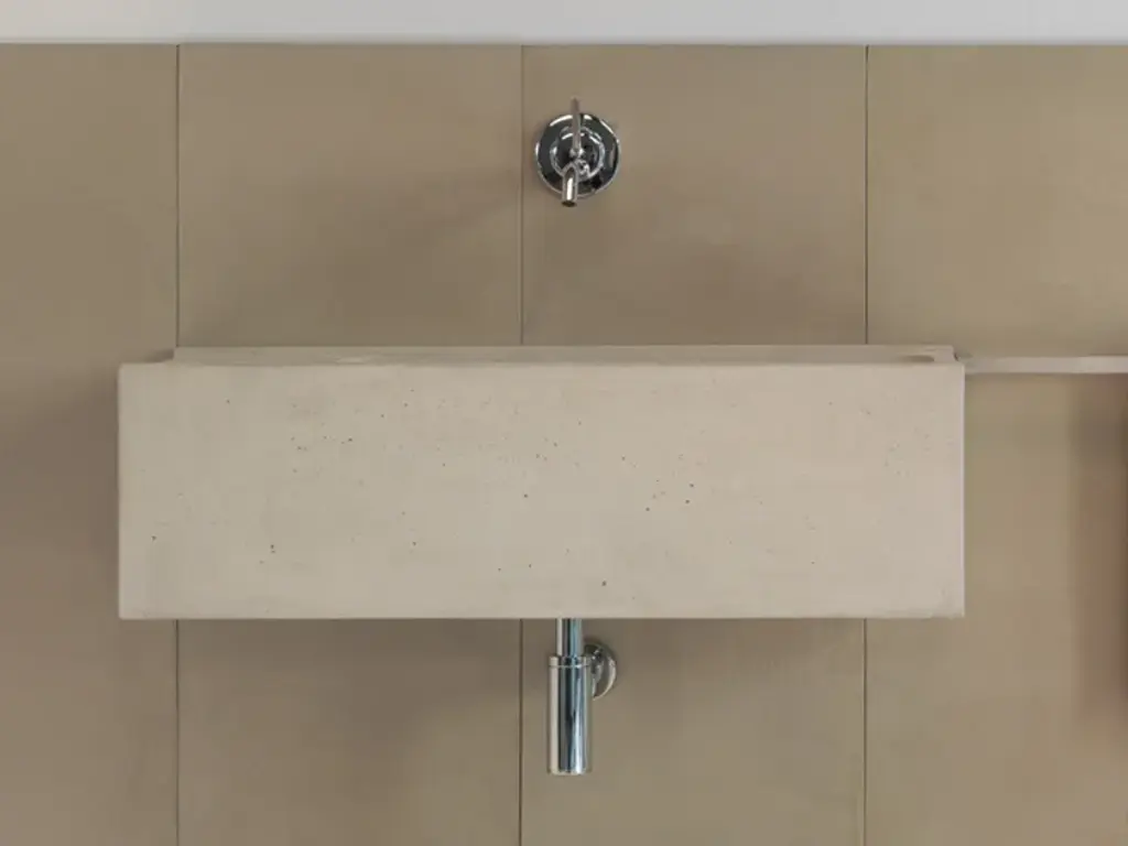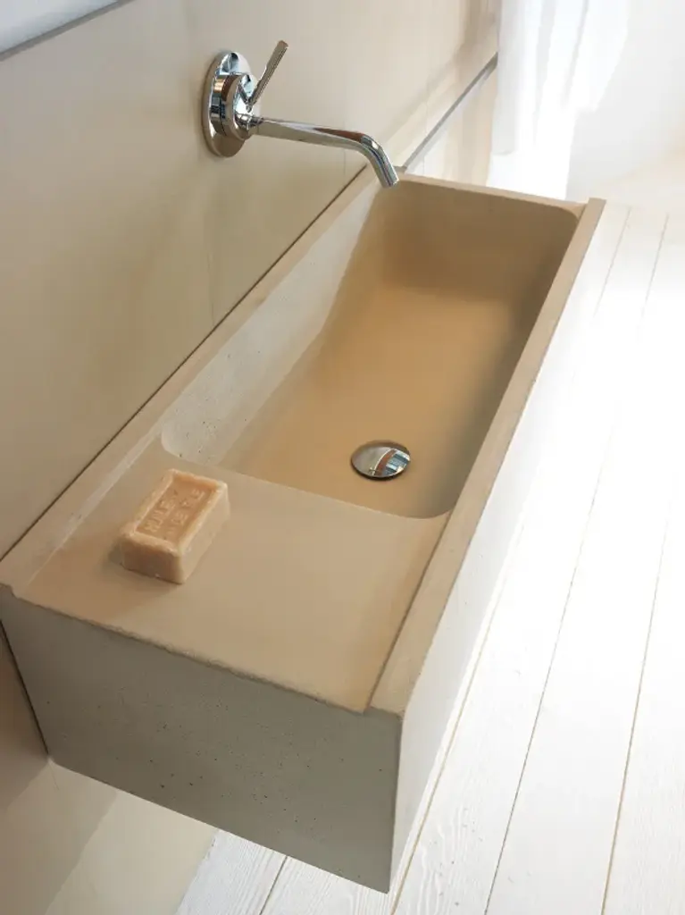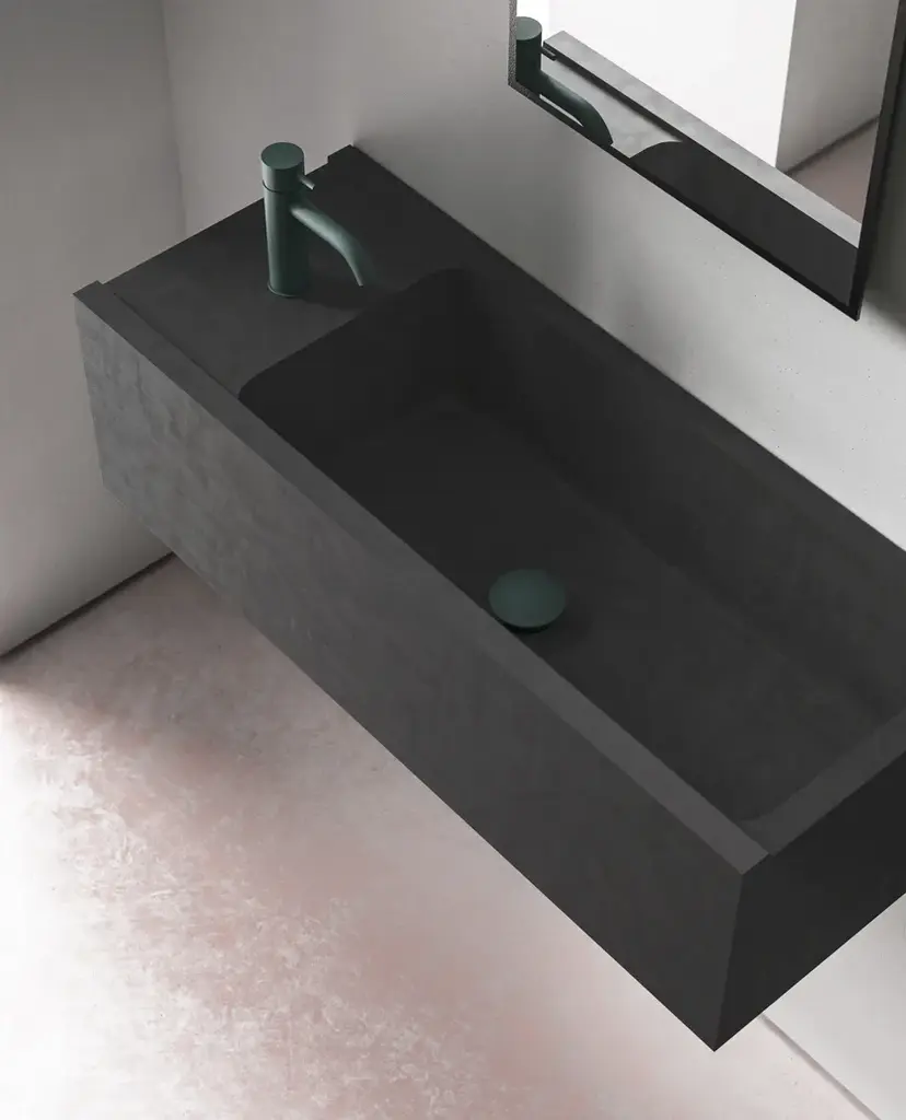 Elledue is a rectangular suspended washbasin made of concrete.Line of wall hung and above inserted wash basins made of cement finish mortar with water-repellent, elasticizing and stabilizing additives available in grey, white, sand, tobacco, black and purple. These molded elements maintain a hand-made appearance that is dedicated to the discerning client seeking innovation in the style and aesthetics of interior décor.