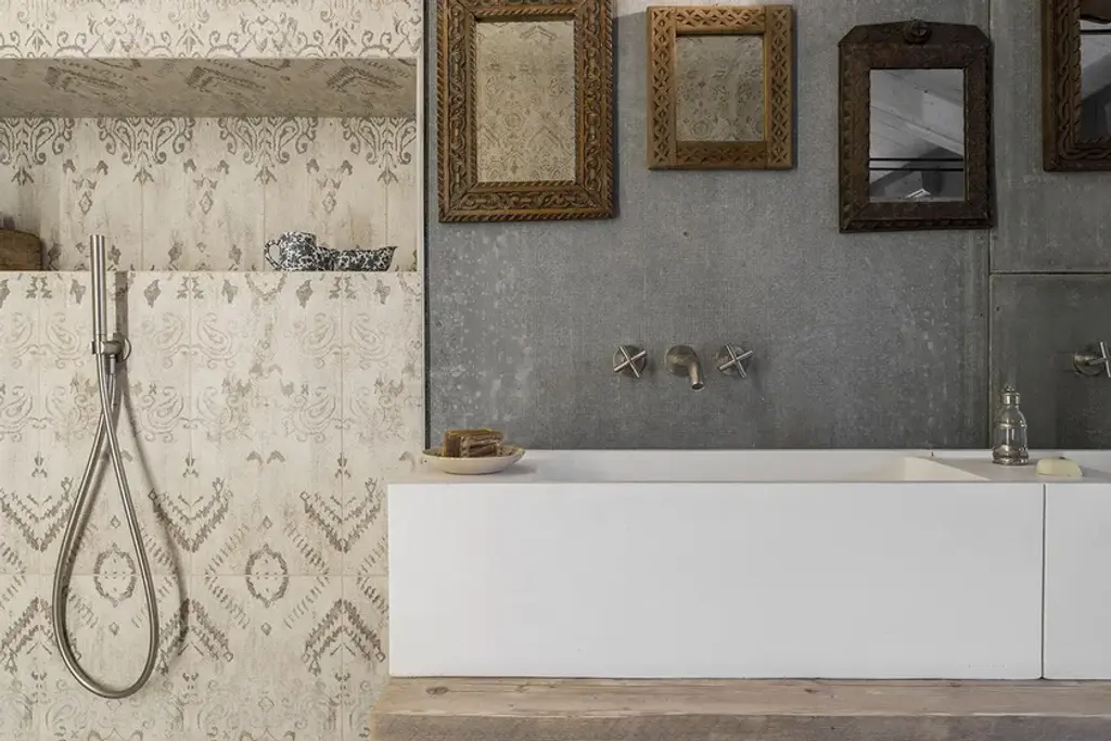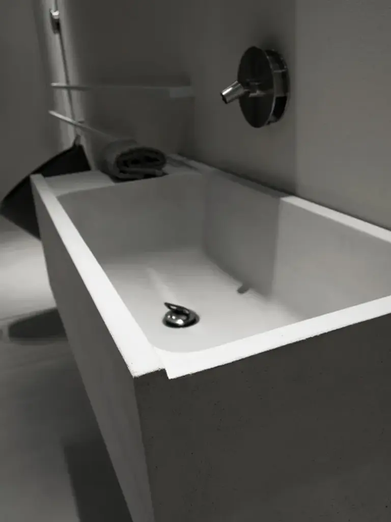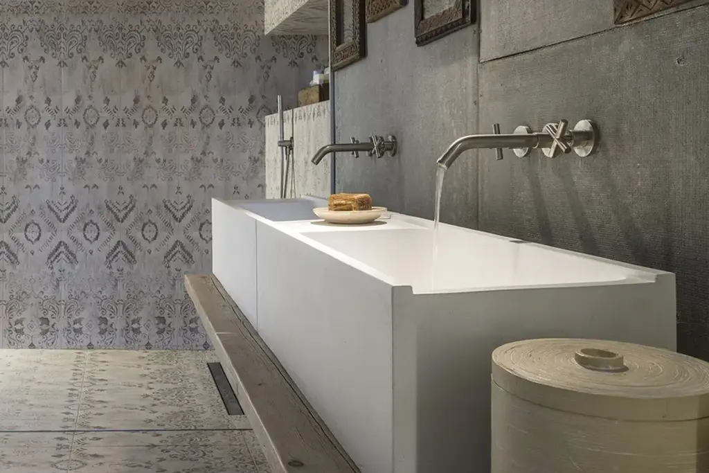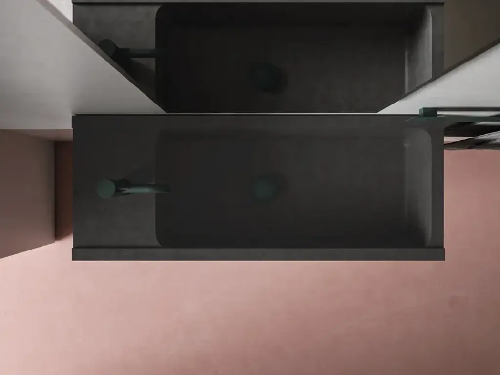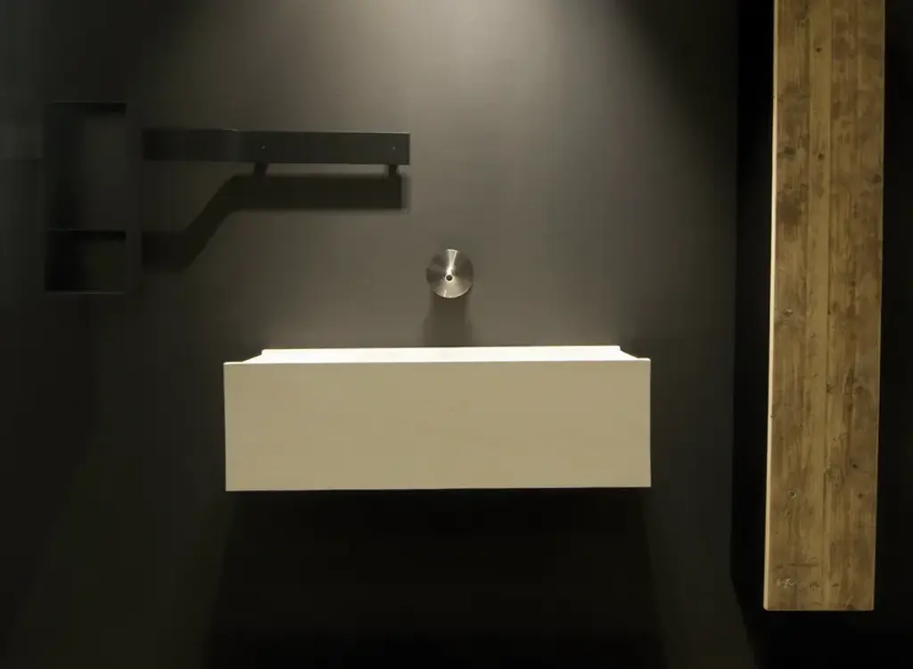 Elledue is a rectangular suspended washbasin made of concrete.Line of wall hung and above inserted wash basins made of cement finish mortar with water-repellent, elasticizing and stabilizing additives available in grey, white, sand, tobacco, black and purple. These molded elements maintain a hand-made appearance that is dedicated to the discerning client seeking innovation in the style and aesthetics of interior décor.