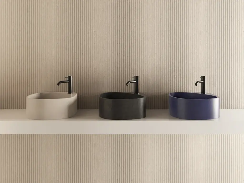 Elletre is a countertop washbasin made of concrete with an irregular and soft shape, also available in the suspended version; suitable for both wall and basin taps. Available colors: black, sand, tobacco, white, purple and gray.
