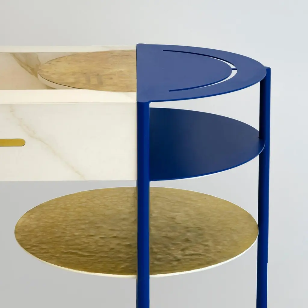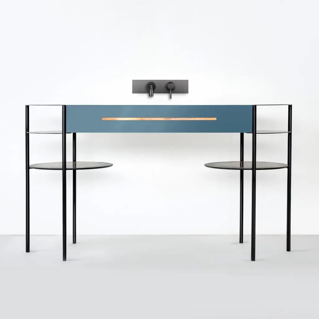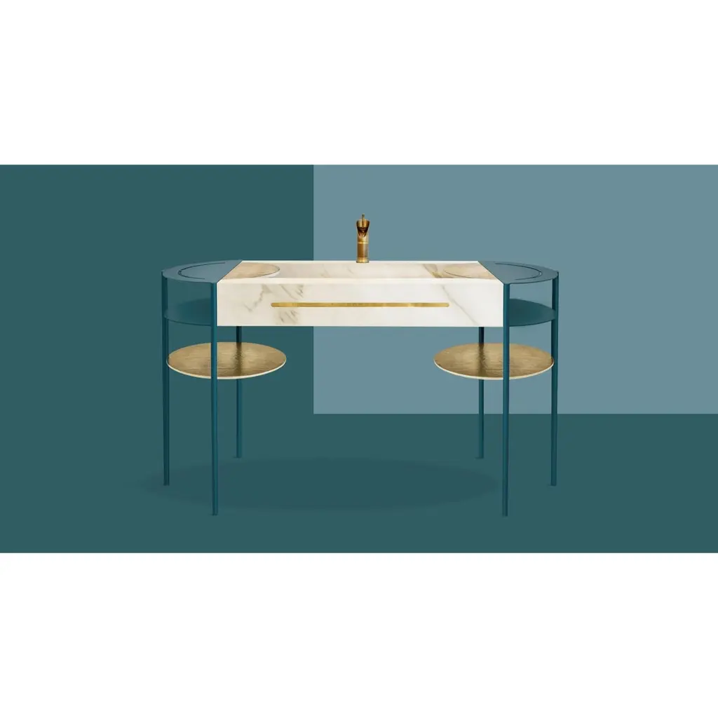 Fontanae Nettuno Washbasin by Atlas ProjectDimensions: D 50 x W 150 x H 90 cm. Materials: Painted iron, metal, marble, and blue steel.Available in different materials and finishes. Please contact us.Fontanae/NettunoInspired by the historic fountains of Rome, the Fontanae series of free-standing washbasins combines aesthetics and functionality, offering authentic furnishing elements.Characterized by a voluptuous yet rational design, Fontanae washbasins are protagonists of the bathroom environment, which, from an intimate and private place, becomes a space to be designed, personalized, and furnished.Our ProjectThe synergy between a thirty-year Italian craft experience and an original design, based on the need to research and develop topics up with the new aesthetic trends, gives birth to Atlasproject, an exclusive furniture collection conceived by the designer Massimiliano Giordano.Born and developed first in Copenhagen, then in Vienna and finally in Rome, the project is – as a matter of fact - a journey of contamination and encounter between the many cultures of the European Design.The production is focused on a dynamic dialogue between geometries and materials, which leads to collections of deep impact and elegance. Every piece merges essential geometric shapes with the most surprising materials, textures, and colors, as the result of a careful selection of natural materials and hand-processed metals.The Atlasproject collections are entirely made in Italy, where the tradition of artisanality is still a deep value, to ensure high-quality and long-life products.Of Neapolitan origins, Massimiliano Giordano grew up inthe family’s artistic atelier.The artisan knowledge and the design skills lead him to Atlasproject, a creative container inspired by the journey, leit motiv of his personal and professional life. In fact, the designer leaves from Naples towards Copenhagen, where he will stay for five years, and then for Vienna for five years more in the heart of the Mitteleuropean design, and finally in Rome, where he currently lives and works.The amazing connections between the encountered design souls actually represent the most significant stylistic figure of his works.