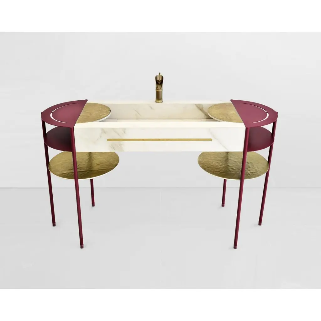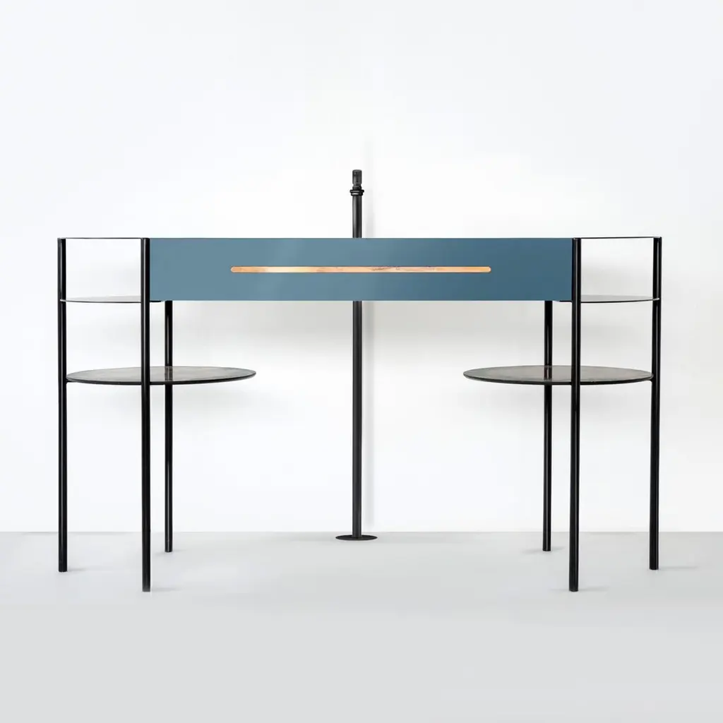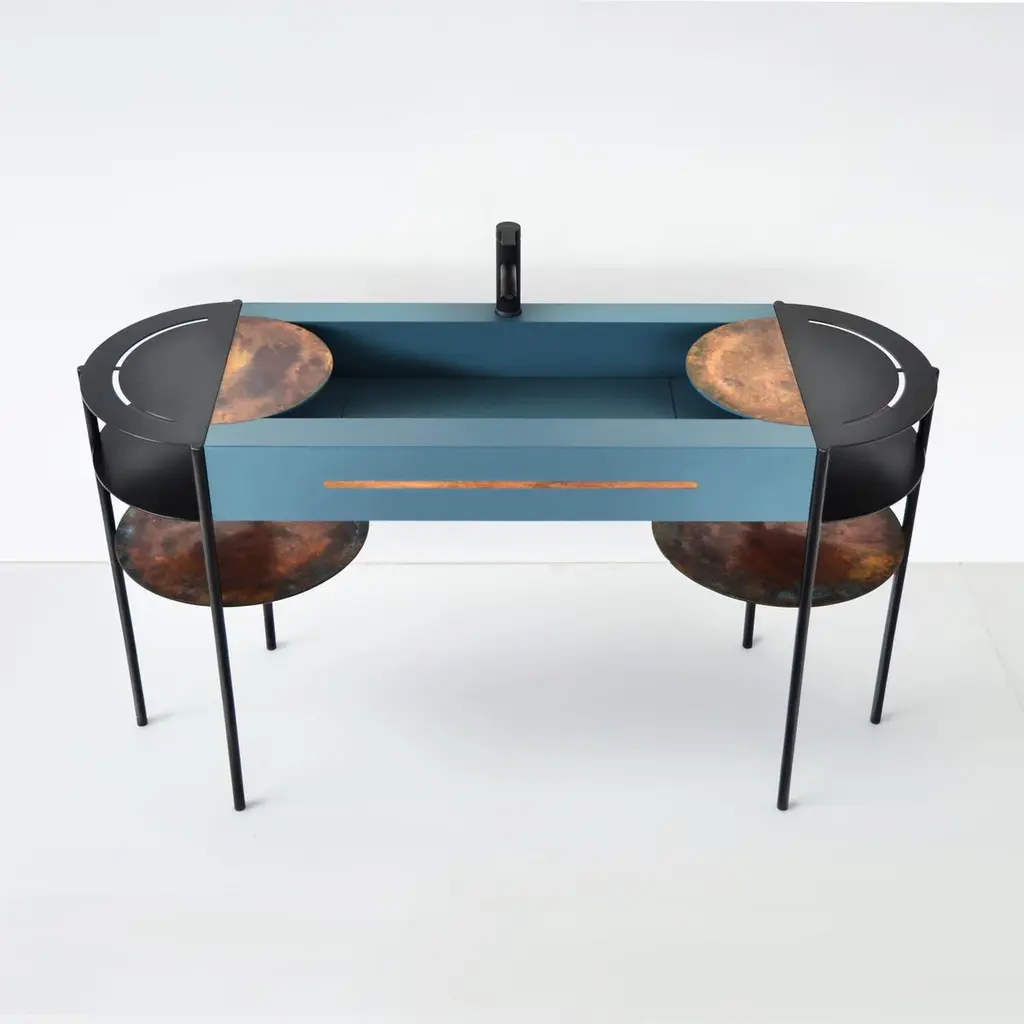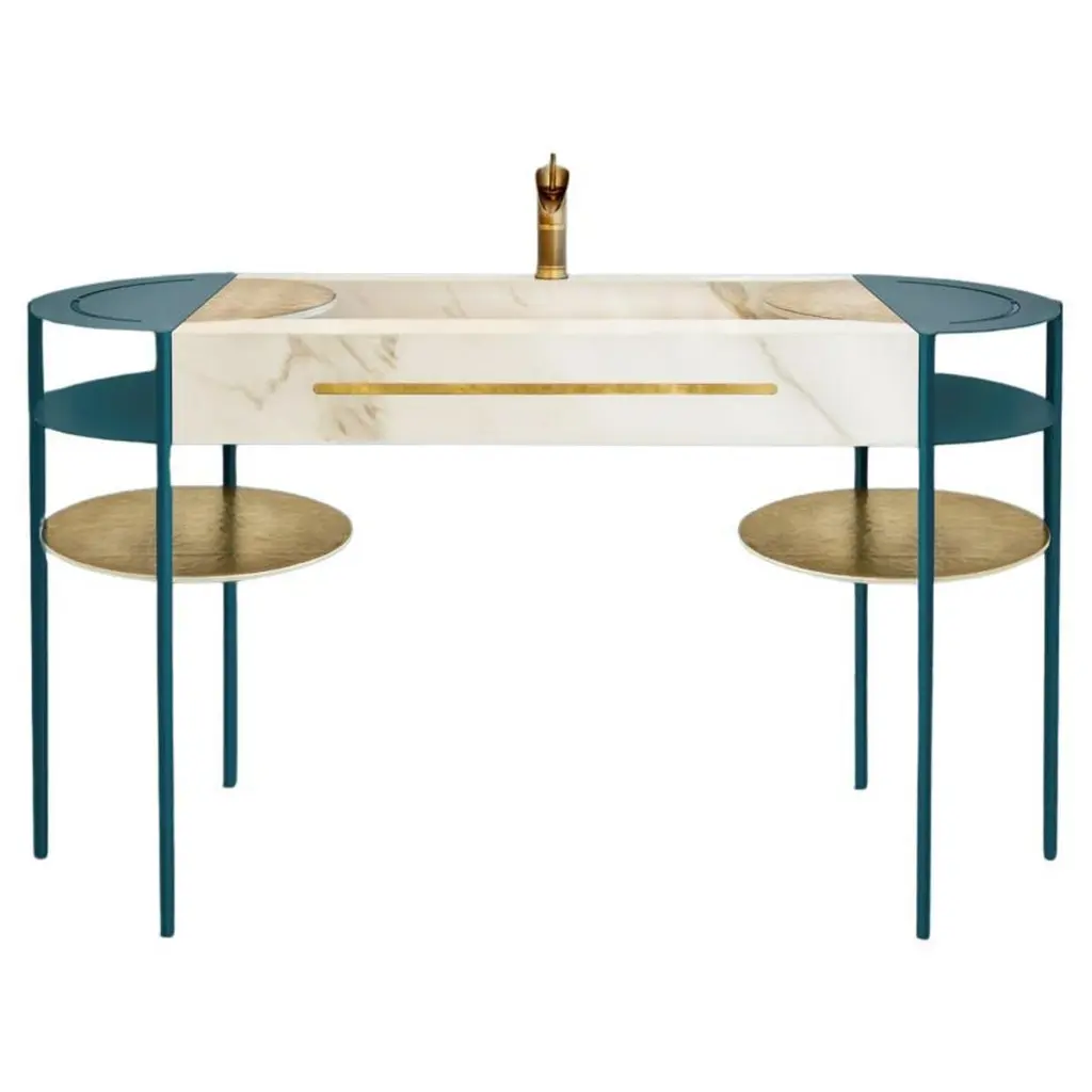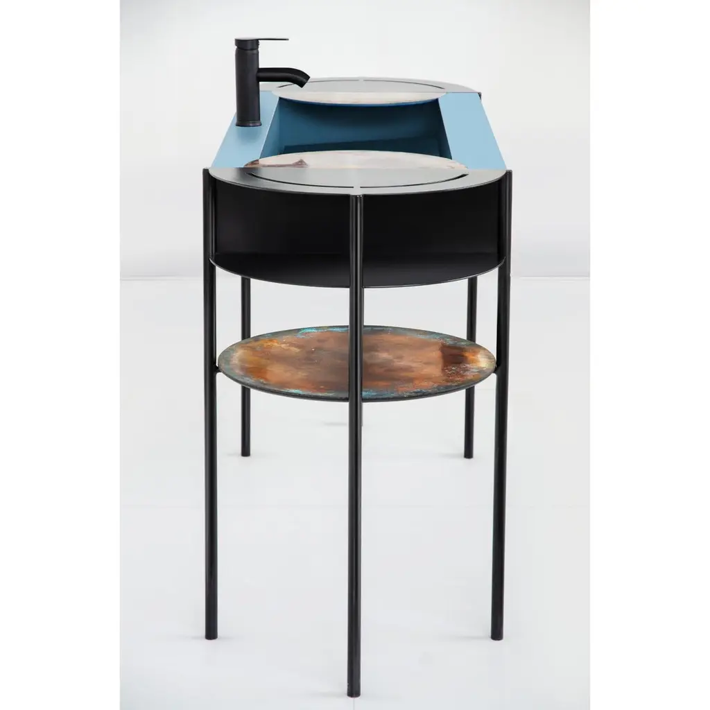 Fontanae Nettuno Washbasin by Atlas ProjectDimensions: D 50 x W 150 x H 90 cm. Materials: Painted iron, metal, marble, and steel.Available in different materials and finishes. Please contact us.Fontanae/NettunoInspired by the historic fountains of Rome, the Fontanae series of free-standing washbasins combines aesthetics and functionality, offering authentic furnishing elements.Characterized by a voluptuous yet rational design, Fontanae washbasins are protagonists of the bathroom environment, which, from an intimate and private place, becomes a space to be designed, personalized, and furnished.Our ProjectThe synergy between a thirty-year Italian craft experience and an original design, based on the need to research and develop topics up with the new aesthetic trends, gives birth to Atlasproject, an exclusive furniture collection conceived by the designer Massimiliano Giordano.Born and developed first in Copenhagen, then in Vienna and finally in Rome, the project is – as a matter of fact - a journey of contamination and encounter between the many cultures of the European Design.The production is focused on a dynamic dialogue between geometries and materials, which leads to collections of deep impact and elegance. Every piece merges essential geometric shapes with the most surprising materials, textures, and colors, as the result of a careful selection of natural materials and hand-processed metals.The Atlasproject collections are entirely made in Italy, where the tradition of artisanality is still a deep value, to ensure high-quality and long-life products.Of Neapolitan origins, Massimiliano Giordano grew up inthe family’s artistic atelier.The artisan knowledge and the design skills lead him to Atlasproject, a creative container inspired by the journey, leit motiv of his personal and professional life. In fact, the designer leaves from Naples towards Copenhagen, where he will stay for five years, and then for Vienna for five years more in the heart of the Mitteleuropean design, and finally in Rome, where he currently lives and works.The amazing connections between the encountered design souls actually represent the most significant stylistic figure of his works.