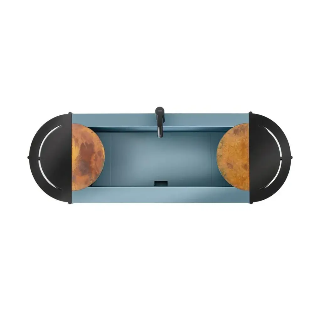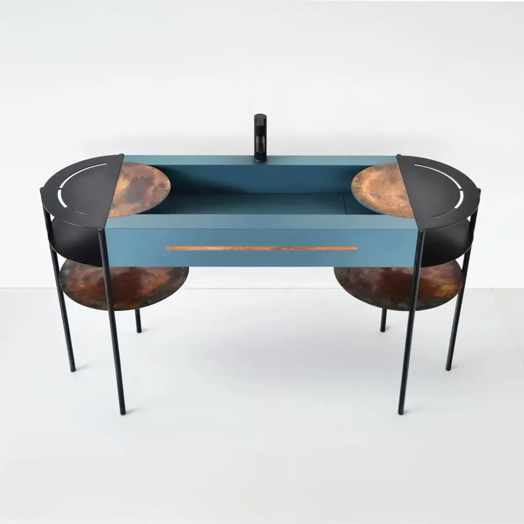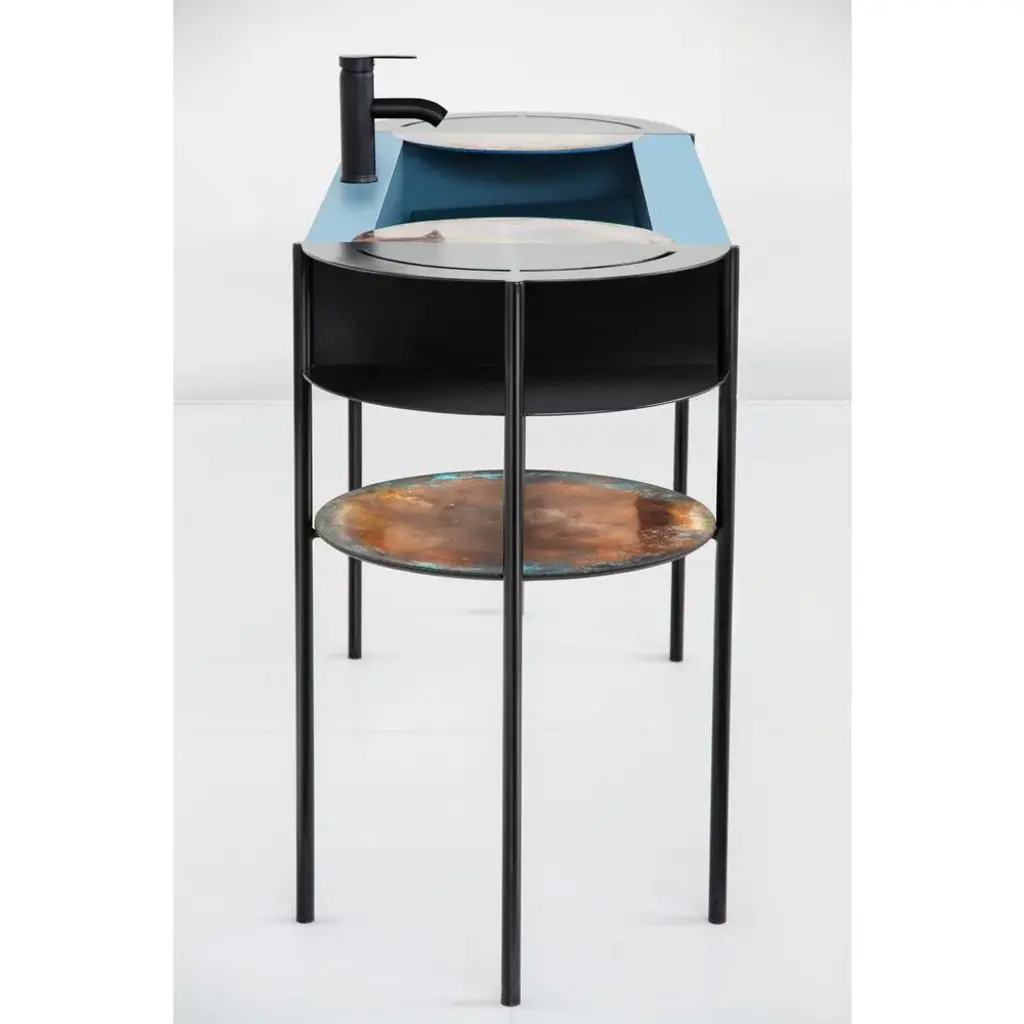 Fontanae Nettuno Washbasin by Atlas Project Dimensions: D 50 x W 150 x H 90 cm. Materials: Painted iron, metal, Sahara Black porcelain gres, and blue steel.