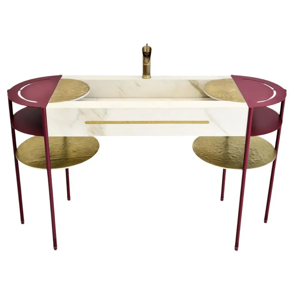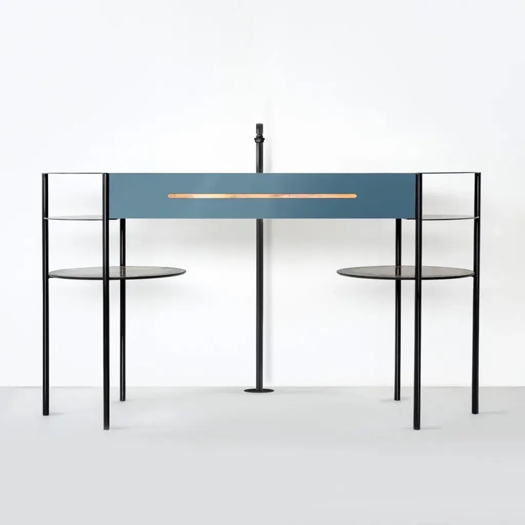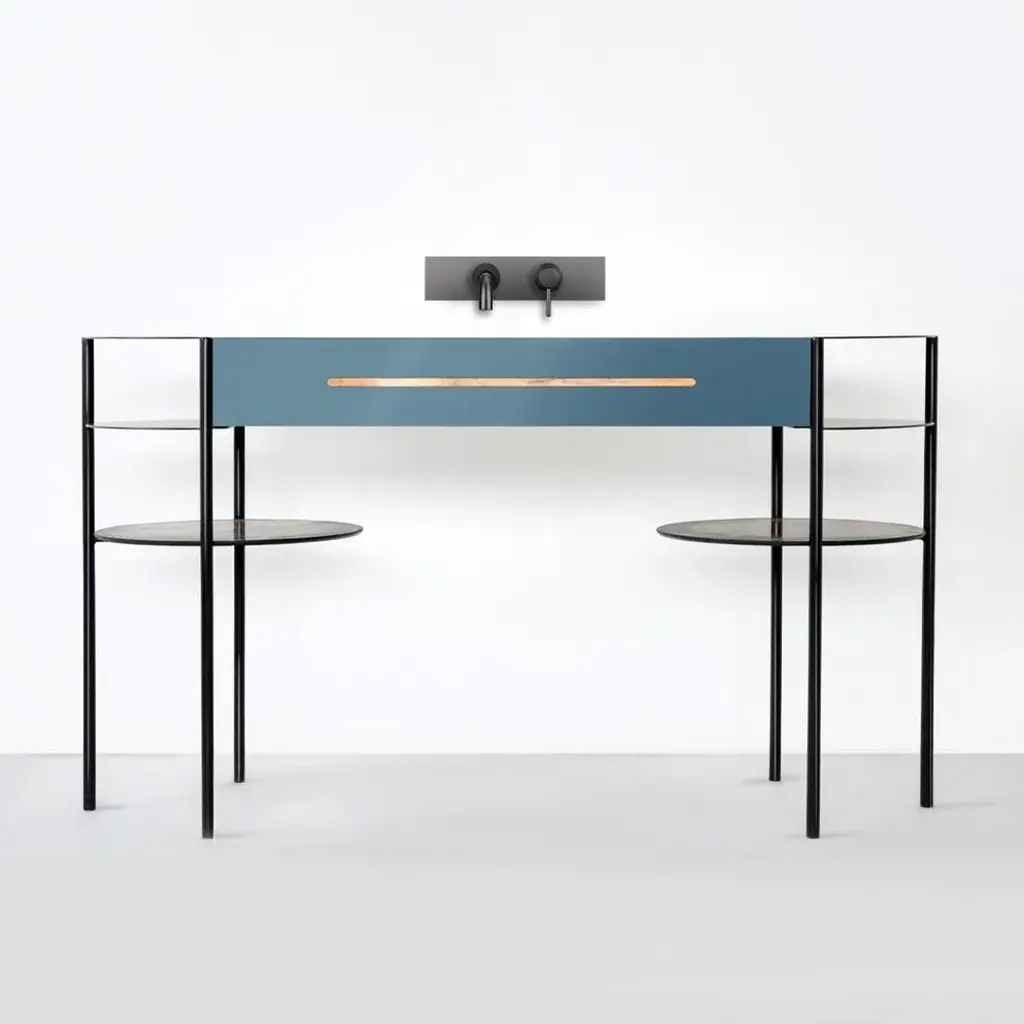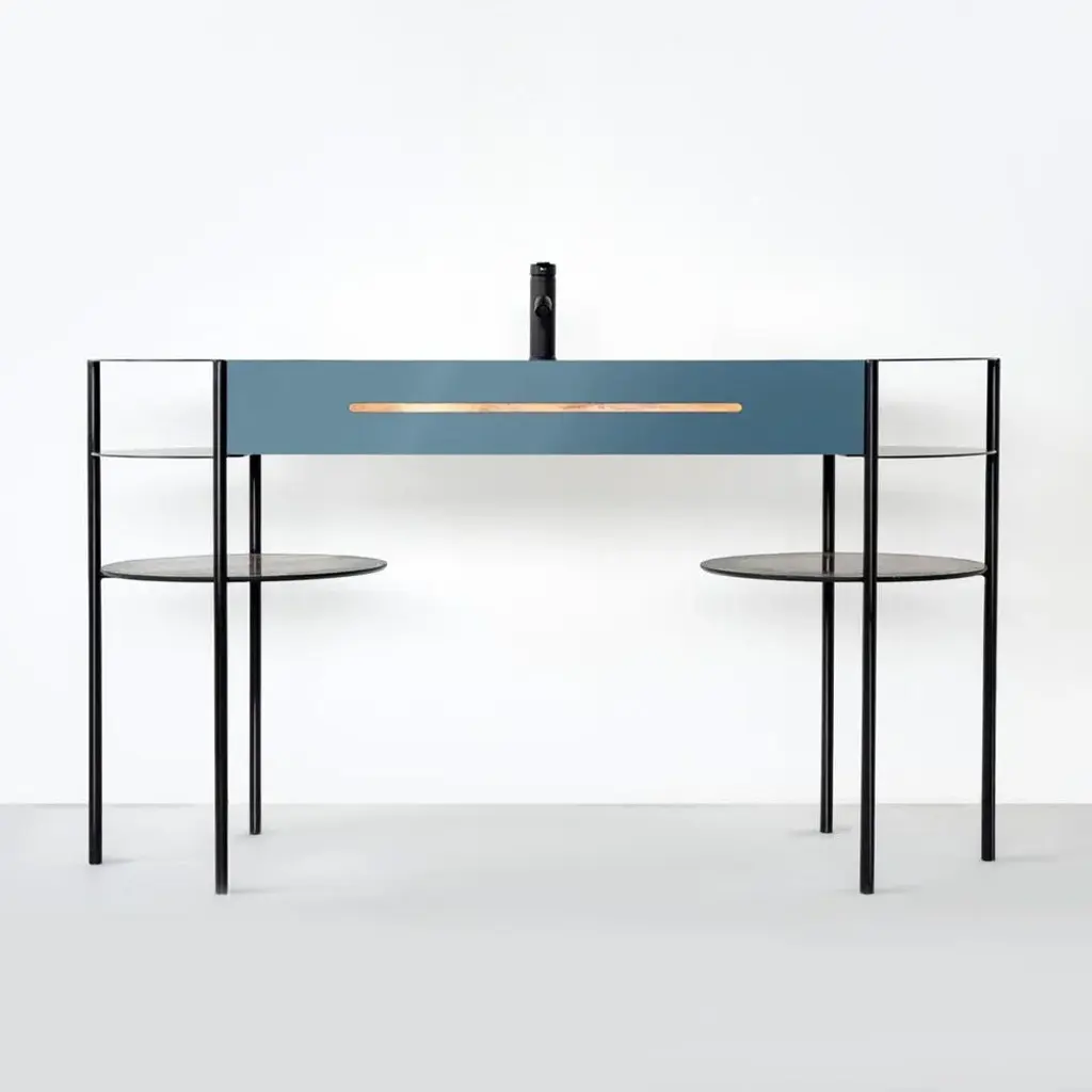 Fontanae Nettuno Washbasin by Atlas Project Dimensions: D 50 x W 150 x H 90 cm. Materials: Painted iron, metal, Sahara Black porcelain gres, and blue steel.