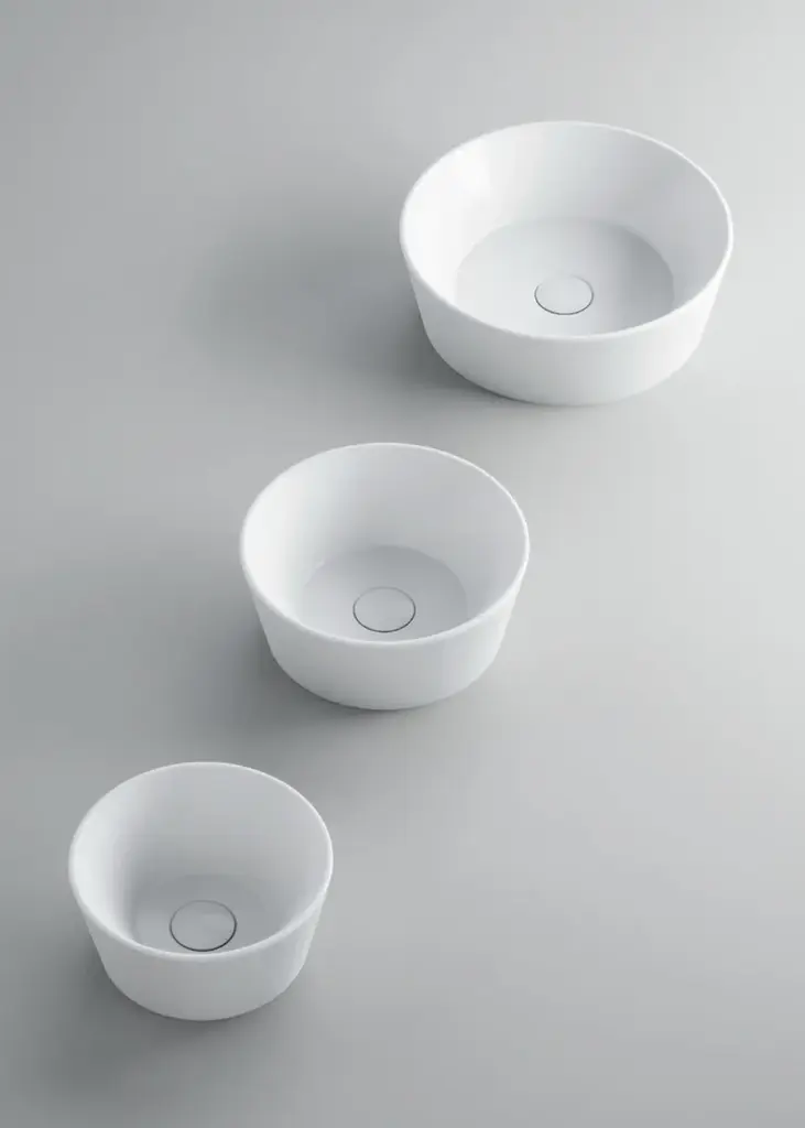 Forma is a countertop round single ceramic washbasin available in various finishes and 3 dimensional variants.The drain can be purchased separately.