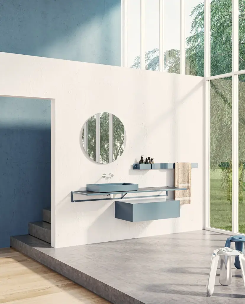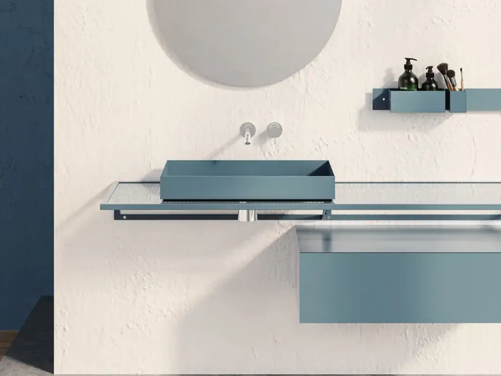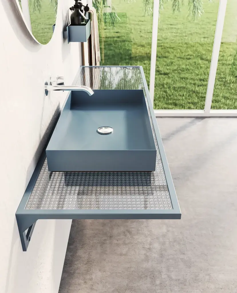 Lacquered steel suspended top with wired glass. 45 cm deep.NB. One standard Ø 10 hole for countertop washbasins. For oversized holes please contact customer service.Framed is a suspended top ideal for countertop washbasins in the wired glass version or in the expanded metal version.The aesthetic canon of this furnishing proposal expresses an idea of beauty in the form of understatement: products evoking refined, apparently spartan, neo-industrial atmospheres in sophisticated realities. Varnished stainless steel sinks, re-used wood tops, light pierced metal sheet tops are the components of this line of industrial matrix, both for the materials of choice and for the shapes. Contemporary interpretation of an informal style reflecting low-tech choices. Friendly objects that, in the simplicity of the revealed function, give the environment where they are inserted a specific identity.