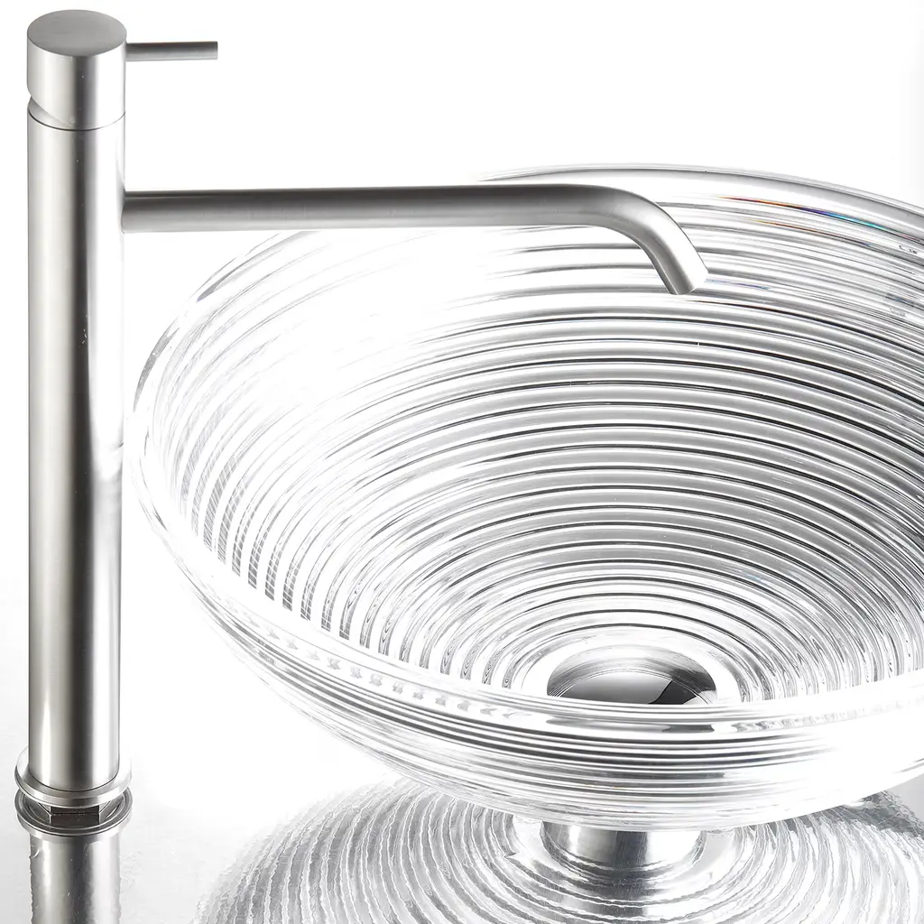 Italian Handcrafted Clear Crystal Basin Sink with Hand-Grooved Detailing. Functional features that create a bathroom of exceptional elegance, warmth, and high value.