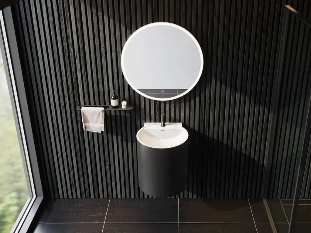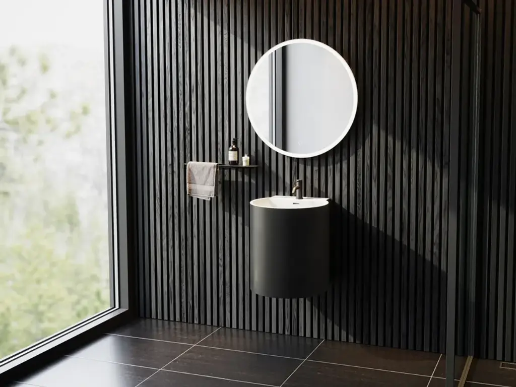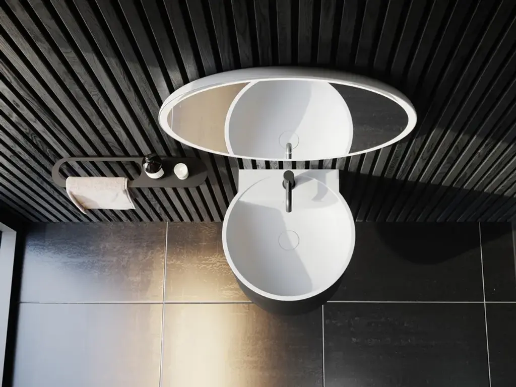 HELSINKI W45 is a wall-mounted basin characterized by clean lines with an industrial touch, a perfect alternative to traditional washbasins, to be combined with a raw wood top or an elegant Acovi® flat.The washbasin, made of Acovi®, has soft and organic shapes with the outside finished with a matte black gelcoat; you can combine it with a wide selection of bathroom furniture from the Copenhagen Bath collection, HELSINKI W45 is also available in the countertop version.Like all products in Acovi®, HELSINKI has a 10-year warranty against internal breakage and color variations.Material: Acovi® Solid SurfaceColour: Matte black / white