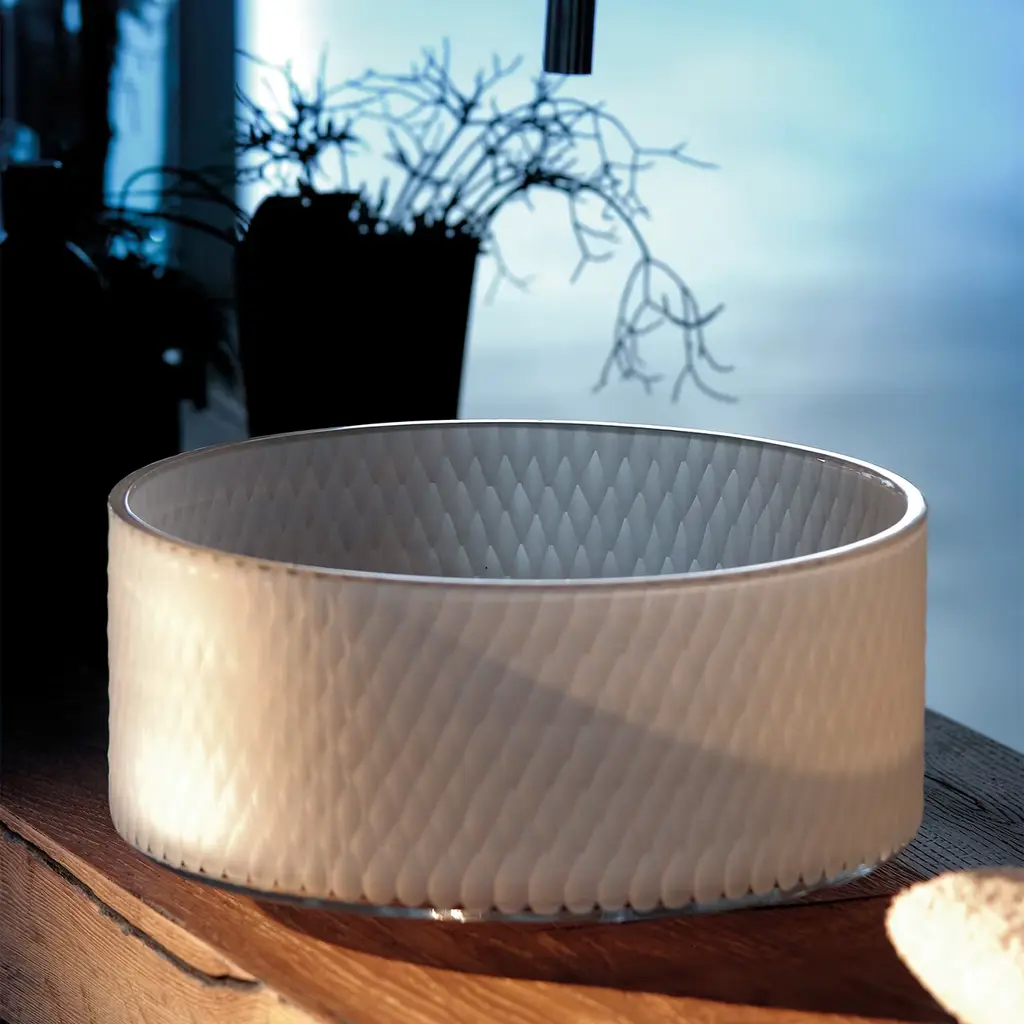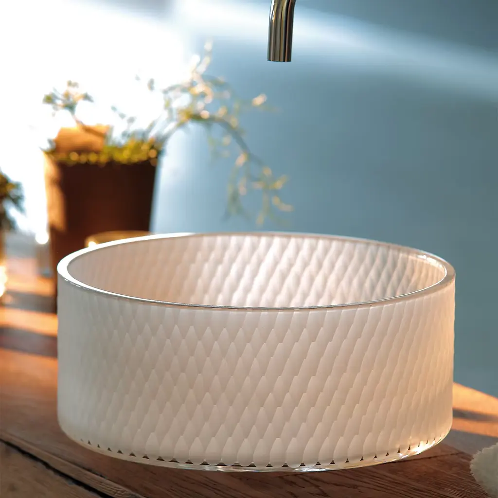 Handcrafted Italian crystal hexagon sink with a finely etched matte hexagonal pattern. The sink basin is designed to exude elegance and warmth, elevating any bathroom to luxurious heights. Functional elements seamlessly blend to create a space of exceptional refinement.
