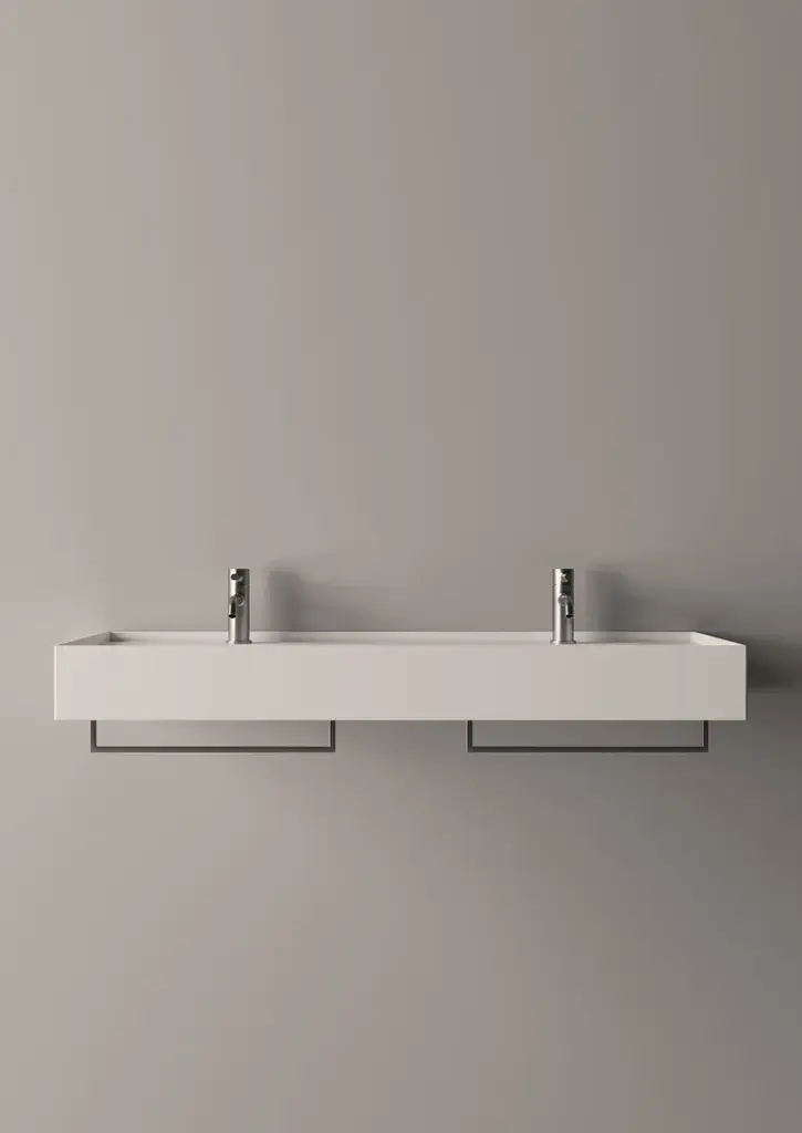 Hide is a double ceramic washbasin.Towel rail not included.Purchasing information:Pop up plugs are not included and must be purchased separately (see product PIL06)One of Alice Ceramica’s most iconic collections. Steep curves and generous plans to be used in every bathrooms and for all necessities.And from today with a brand new modern touch, the practical towel holders.