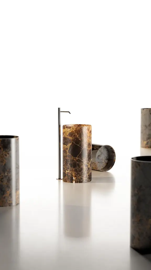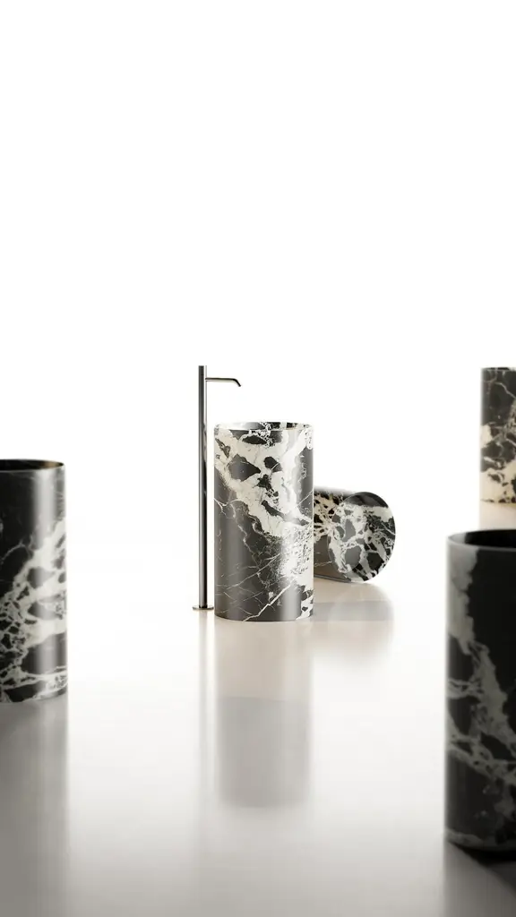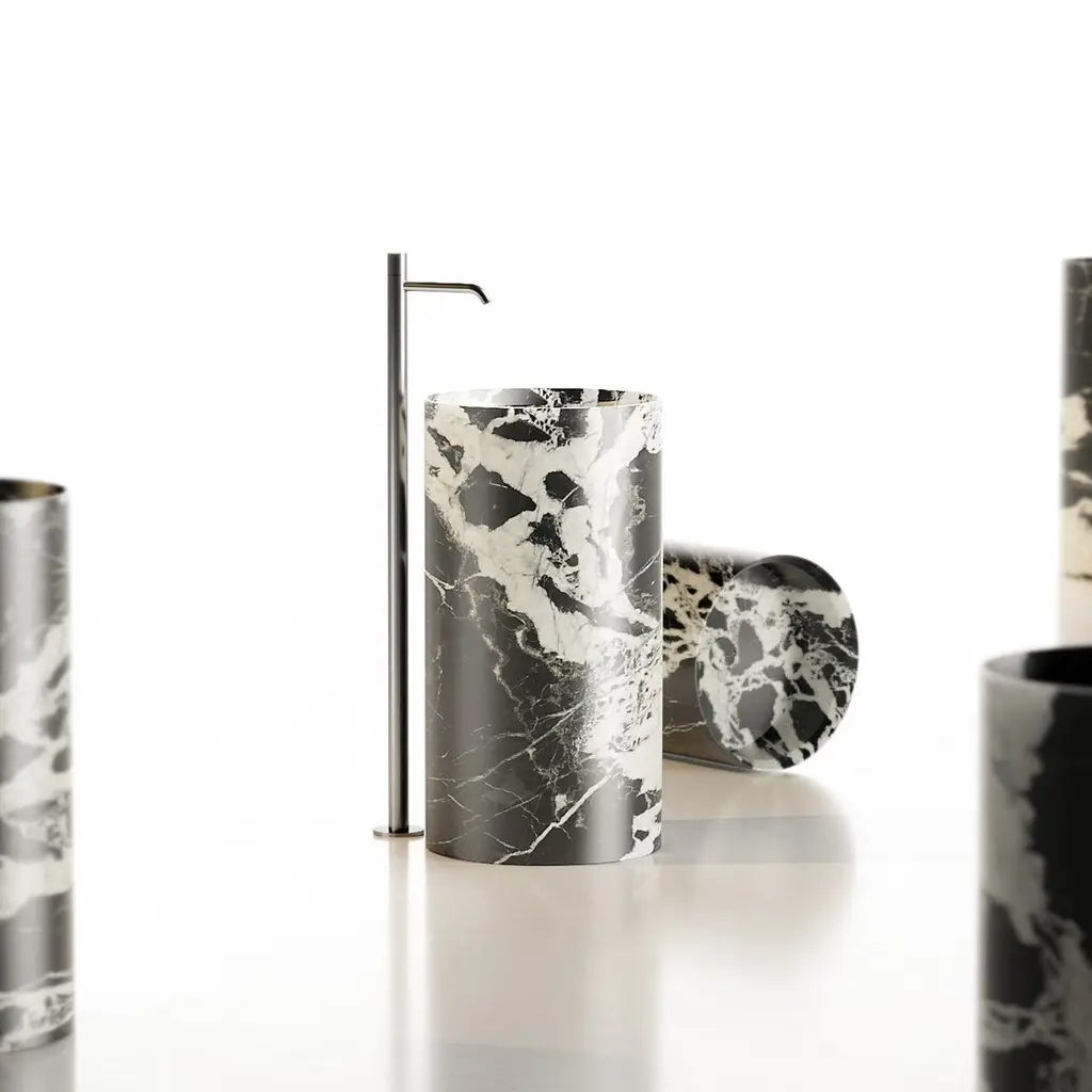 High Entity Circle Washbasin by Marmi SerafiniMaterials: Nero Marquinia Venato marble.Dimensions: D 45 x H 85 cmAvailable in other marbles and in 3 sizes: H 20, H 50, H 85 cm.Tap not included.Available in a classic version with the traditional drainpipe, or more modern with stone drainpipe. Ideal position for this piece is the center of the room, slightly away from the wall.Marmi Serafini is located in a small city named Chiampo, internationally well known for its marble production.It's origins stem from Mr. Bruno Fortunato's passion for marble which was then passed on to his two sons, Alessandro ad Luca, who eventually took over.Marmi Serafini has, with the passing of time, transformed into one of the most innovative marble factories, producing extremely design-driven products and objects.