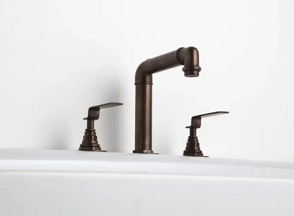 3 holes industrial tap.Collection of washbasins and sanitary ware in a pure industrial style. Many choices of sinks (countertop or on a metal stand with a reel eiffel tower look). The Industrialis series exists with many different faucets and with several mirrors and accessories all in industrial style. Many finishes available for metal parts as well as wooden and metal furniture for additional storage. Floor mounted toilets and bidets and wall hung wc also available.