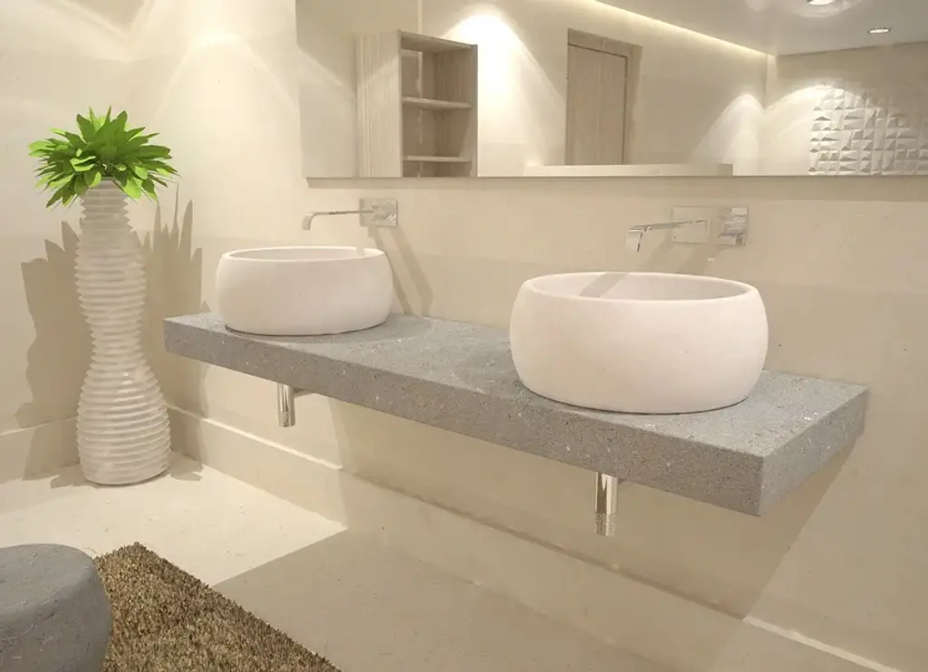 L8 is a washbasin made of robot-worked beige stone and finished by hand. The sink has veins and traces of fossils, due to the very nature and origin of the Lecce stone. The washbasin has a round shape with a hole in the center for the reflux of water. The washbasin has a very minimal style, and is therefore suitable for inclusion in a bathroom with both classic and modern design.