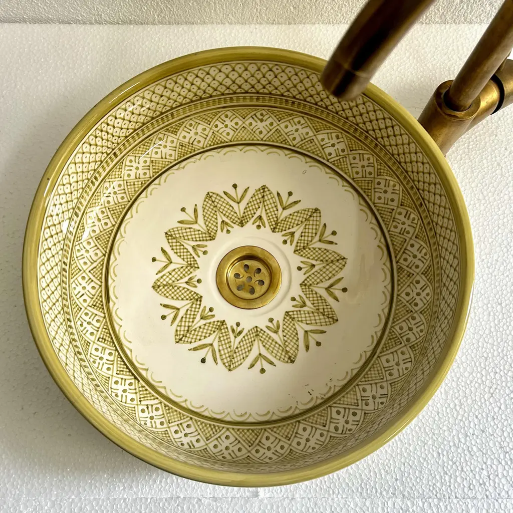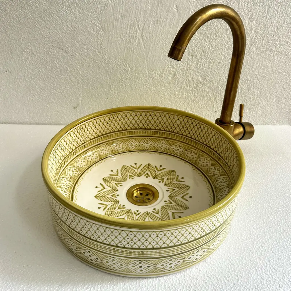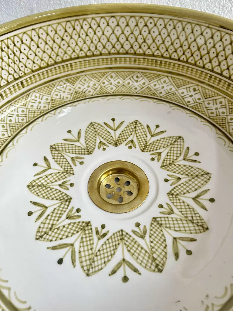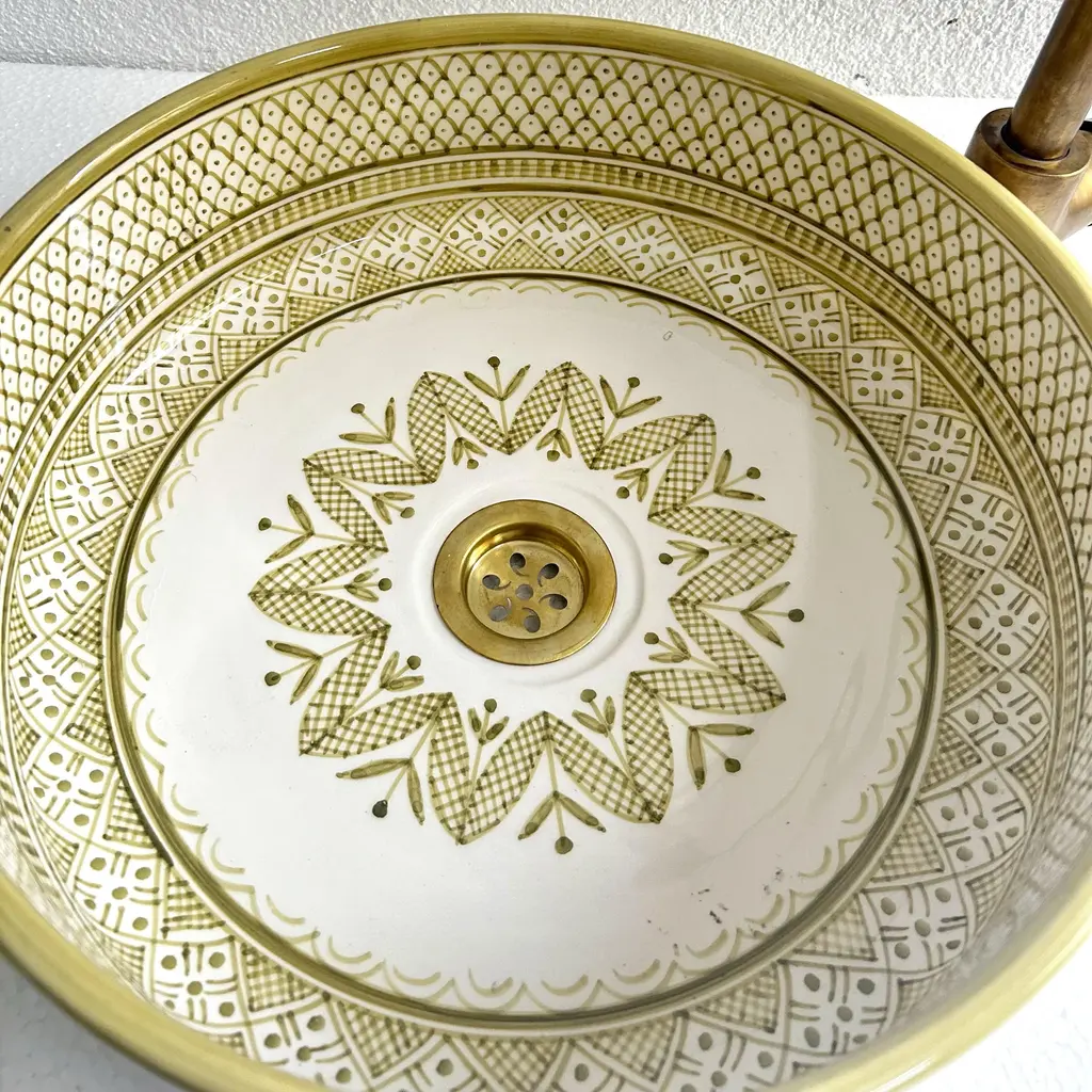 Add a Touch of Timeless Beauty to Your Bathroom with Our Handcrafted Light Green Sink Experience elegance in your bathroom with our light green vanity sink, meticulously handcrafted by skilled Moroccan artisans. This beautiful ceramic vessel sink measures 16x16x5.9 inches, designed with durability and sophistication in mind. Each sink is a true piece of art, showcasing intricate blossom patterns at the basin’s center, a stunning blend of nature-inspired elements and traditional Moroccan aesthetics. Our mid-century ceramic washbasin brings life to any bathroom decor, featuring a soothing white and light green palette that’s sure to catch the eye and uplift your space. Finished with a stylish brass drain, this bathroom sink goes beyond functionality, creating a refined and elegant centerpiece. With careful attention to every detail, our artisans use time-honored techniques passed down through generations, dedicating 5-14 days to craft each sink exclusively for you. Transform Your Bathroom with Handcrafted Artistry Choose this unique vanity sink to enhance your bathroom’s style and grace. Please note that due to its handcrafted nature, slight variations in color and pattern may occur, making each piece truly one-of-a-kind. EssahlyMa