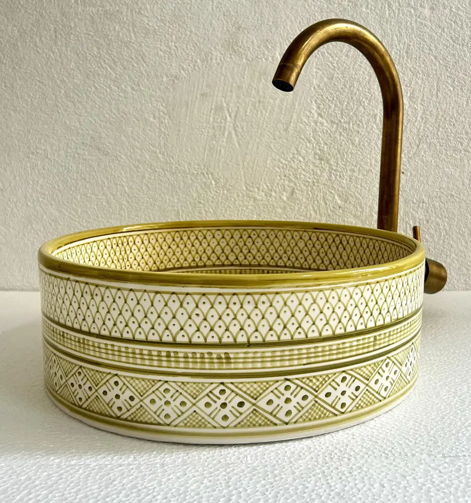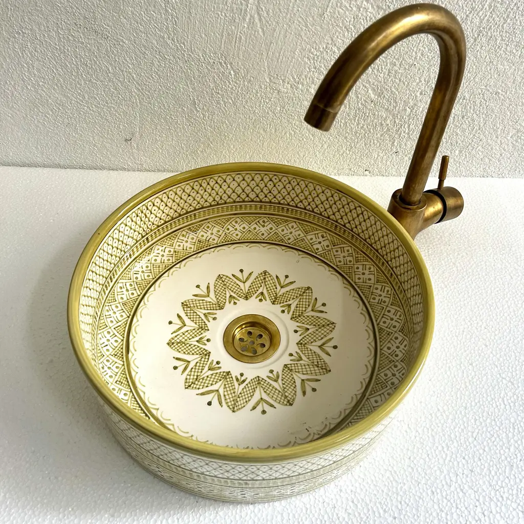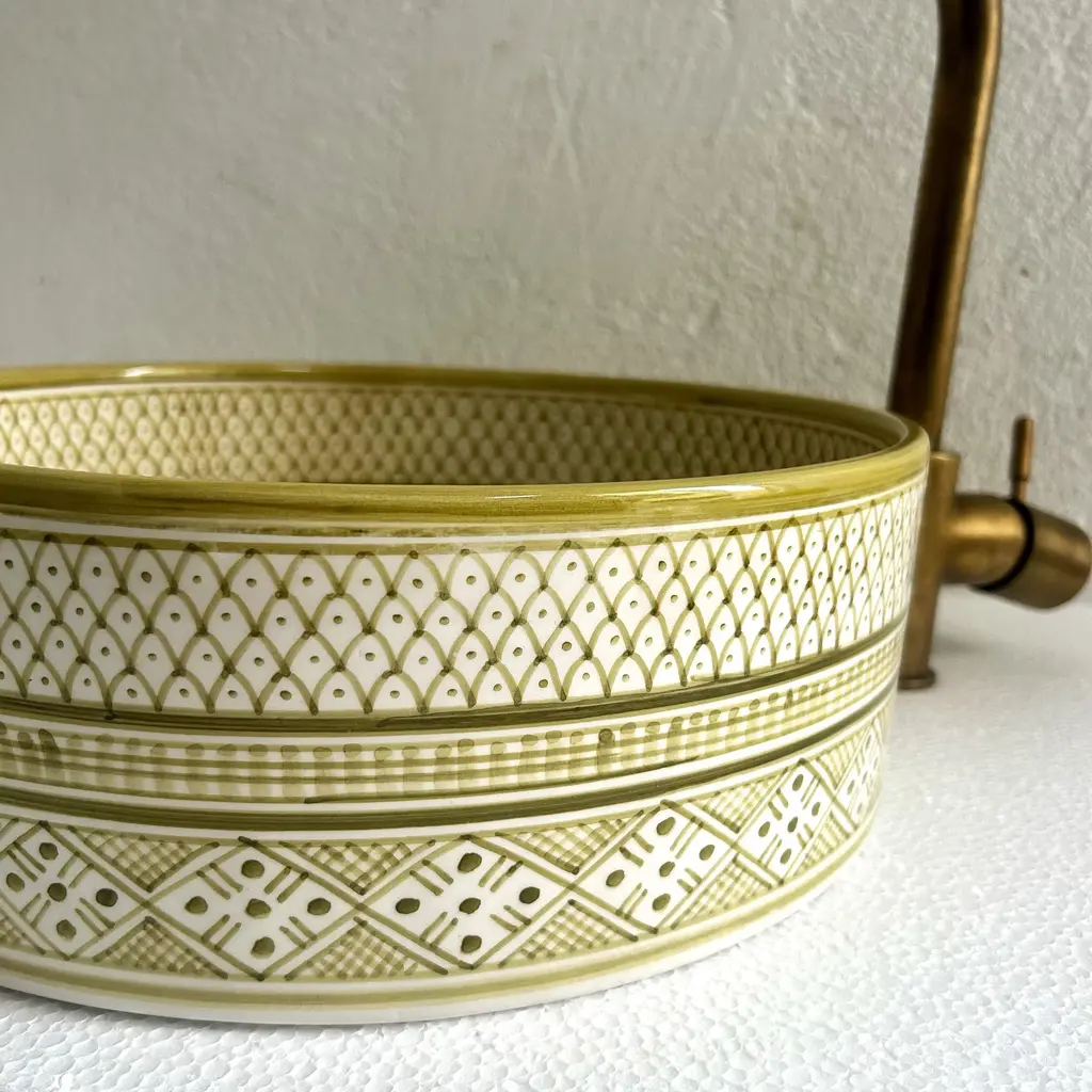 Add a Touch of Timeless Beauty to Your Bathroom with Our Handcrafted Light Green Sink Experience elegance in your bathroom with our light green vanity sink, meticulously handcrafted by skilled Moroccan artisans. This beautiful ceramic vessel sink measures 16x16x5.9 inches, designed with durability and sophistication in mind. Each sink is a true piece of art, showcasing intricate blossom patterns at the basin’s center, a stunning blend of nature-inspired elements and traditional Moroccan aesthetics. Our mid-century ceramic washbasin brings life to any bathroom decor, featuring a soothing white and light green palette that’s sure to catch the eye and uplift your space. Finished with a stylish brass drain, this bathroom sink goes beyond functionality, creating a refined and elegant centerpiece. With careful attention to every detail, our artisans use time-honored techniques passed down through generations, dedicating 5-14 days to craft each sink exclusively for you. Transform Your Bathroom with Handcrafted Artistry Choose this unique vanity sink to enhance your bathroom’s style and grace. Please note that due to its handcrafted nature, slight variations in color and pattern may occur, making each piece truly one-of-a-kind. EssahlyMa