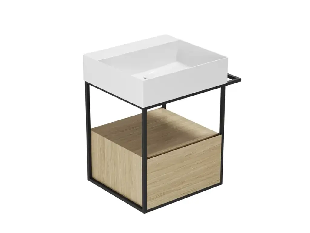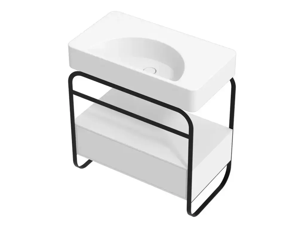 Lunaris is a collection of washbasin complemented by a powder-coated stainless steel structure, available in variations with a ceramic countertop or a lacquered drawer matching the washbasin. The design of the washbasins stands out with a semicircular basin nestled within a soft parallelepiped with roundededges . The generous support surfaces enhance the refined aesthetics with everyday functionality. The structure gracefully unfolds with a play of curves and nodes, delicately encompassing the washbasin with lightness and elegant harmony.