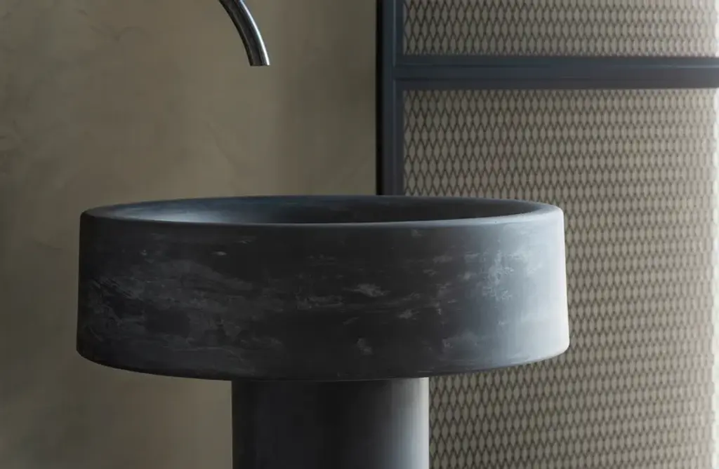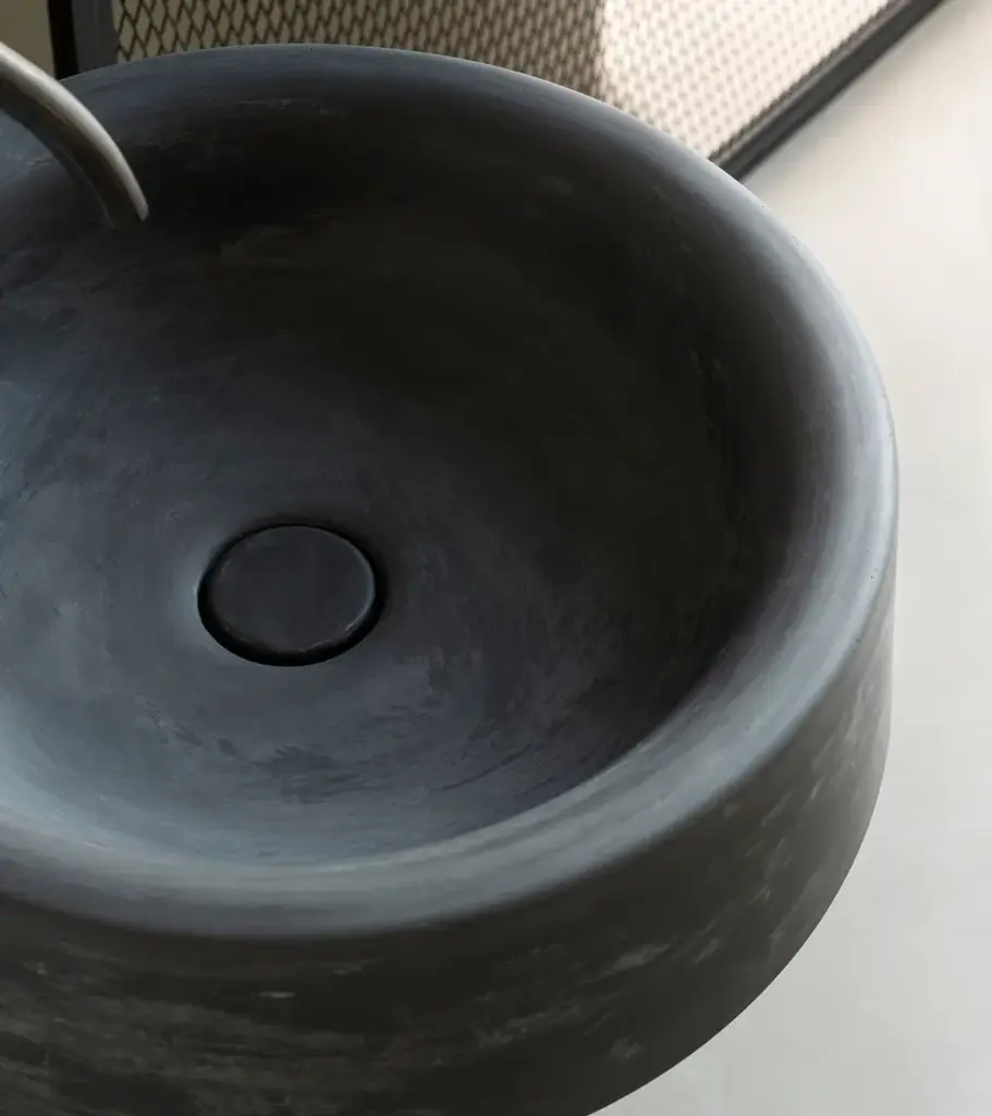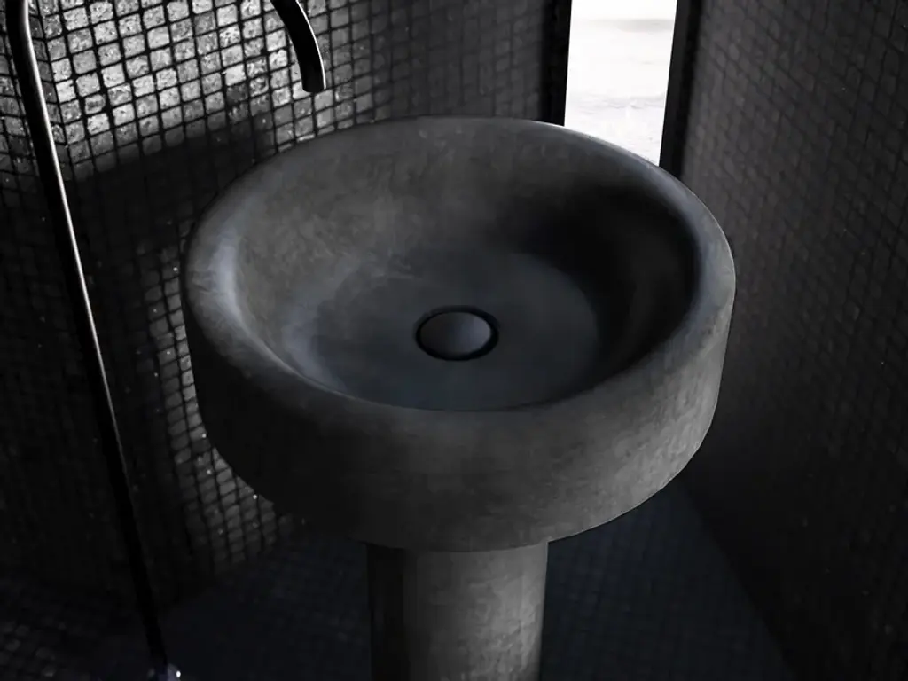 The concrete material, which the LVC free-standing washbasin is made up of, updates the classical model of pedestal washbasins making it an object in a material delabré style, ideal for those who love unconventional aesthetics.Available in different colours.Free flow basin drain with concrete drain covering included.