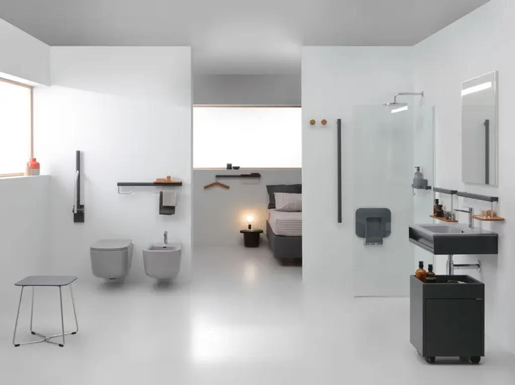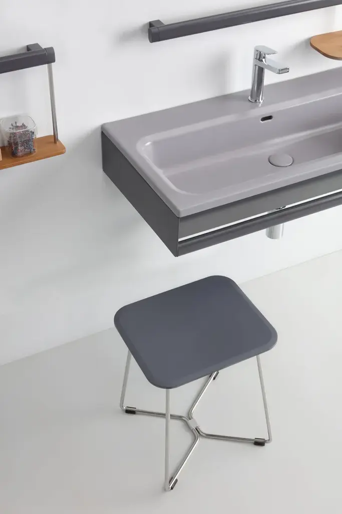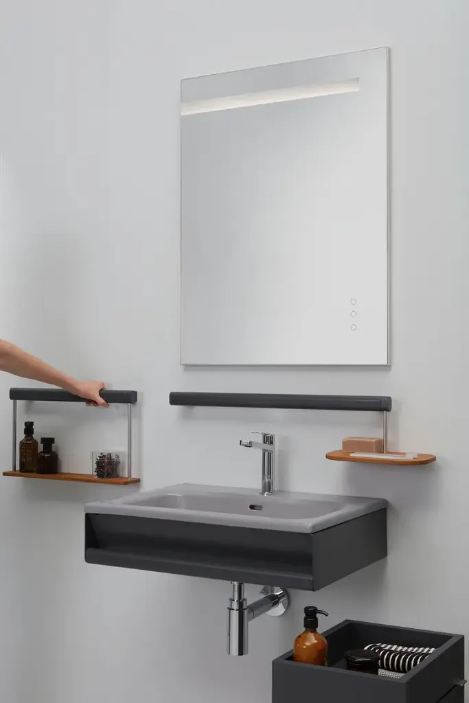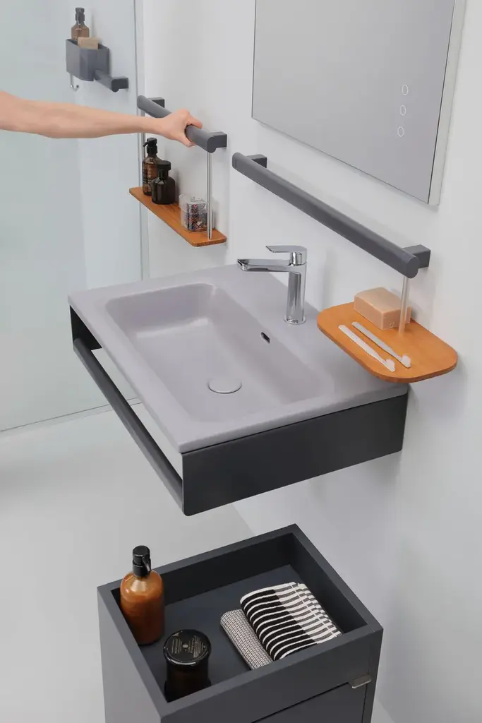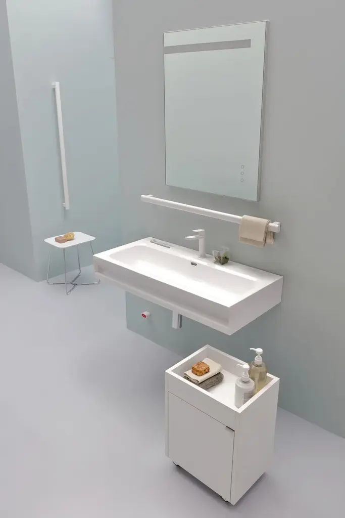 Omnia is a suspended rectangular washbasin. Fixings included. Available in 2 sizes.The OMNIA washbasin, with minimalist shapes, is available in ceramic in 65 and 100 cm widths and in acrylic stone in the standard 65 cm width (or other sizes on request). It is characterized by a bevel that runs along the perimeter of the basin and connects it with the top; a distinctive design that is also found in the bidet and in other products in the collection, such as the stool and the shower seat.To complete the washbasins, a metal structure equipped with a handle on the front to facilitate safe movement, a towel holder and an accessory holder to be applied as options on the sides.The new bathroom’s concept: safety, beauty and technology. A complete and adaptable collection for an enjoyable and safe bathroom environment, where self-care can be carried out naturally and serenely.This is OMNIA, a system that allows the design and arrangement of every area of the bathroom through innovative and functional solutions.Variously accessorized safety bars, shower seats, storage cabinets, washbasins, toilet pans, mirrors with integrated systems for air sanitization and requests for help... a blend of safety, aesthetics and technology designed to enhance the comfort and well-being in a discreet and intimate space such as the bathroom and beyond. OMNIA makes beautiful what must be safe.
